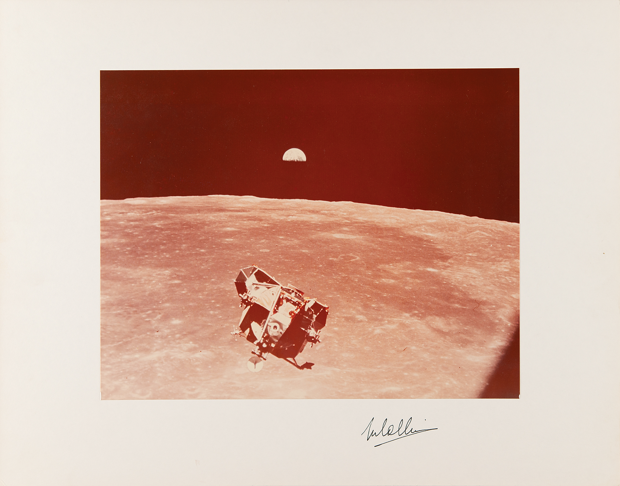 Sought-after official color glossy 13.25 x 10.5 NASA photo of the Apollo 11 Lunar Module Eagle soaring high above the surface of the moon, with the Earth visible in the background, affixed to its original 20 x 16 cardstock mount, which is signed neatly in black ink, “M. Collins.” In fine condition.