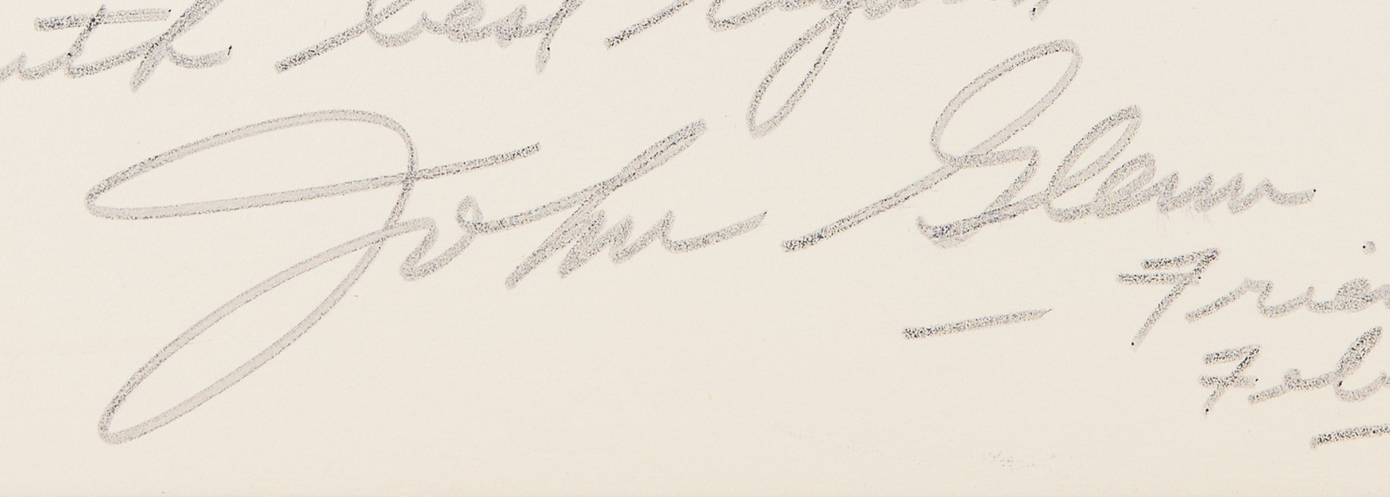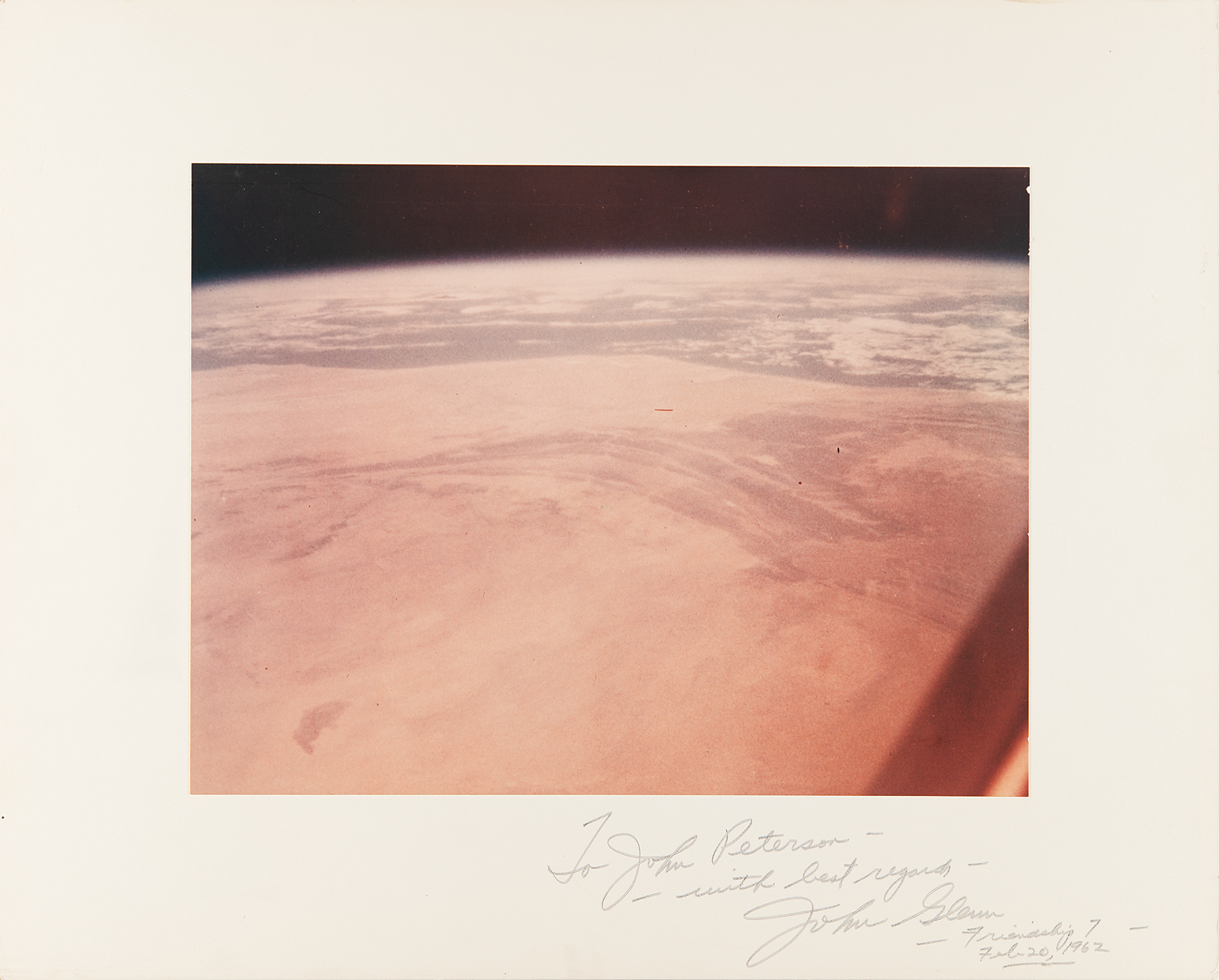 Official color semi-glossy 13.75 x 10.25 NASA photo of North Africa as viewed from John Glenn’s Friendship 7 spacecraft during the Mercury-Atlas 6 mission, affixed to its original 20 x 16 cardstock mount, which is signed and inscribed in black felt tip, “To John Peterson — with best regards — John Glenn — Friendship 7 — Feb 20, 1962.” In fine condition.