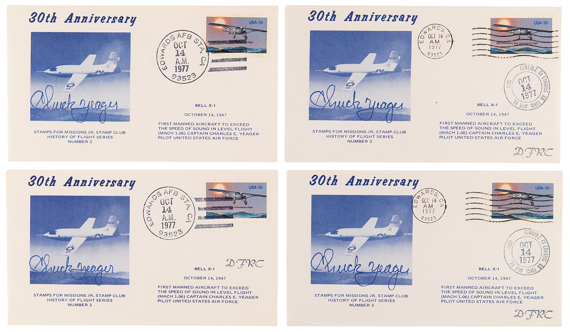 Four commemorative covers honoring the 30th anniversary of Yeager's famous Bell X-1 flight that broke the sound barrier on October 14, 1947, each signed in blue felt tip, "Chuck Yeager." In overall fine condition.