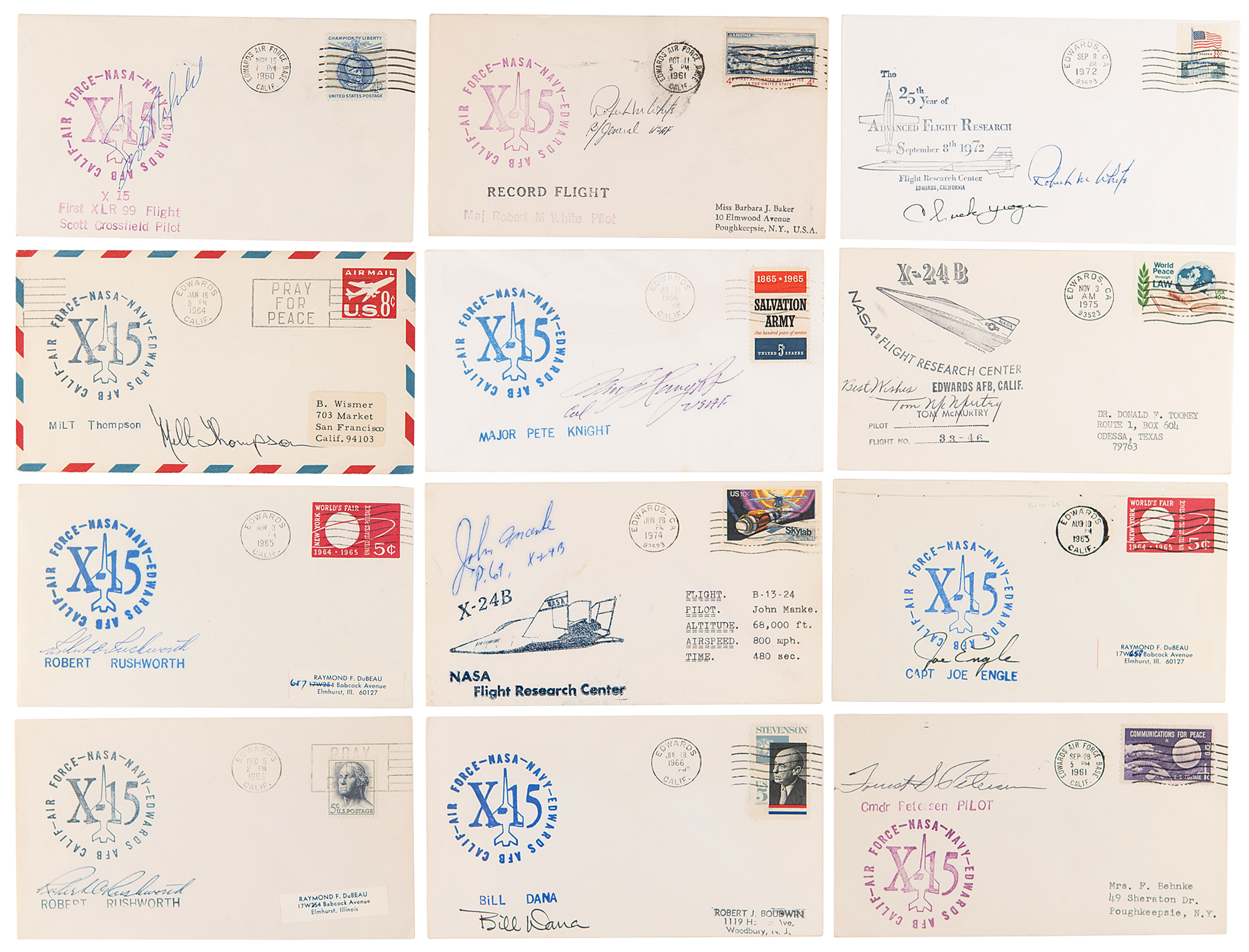 Group of 12 commemorative covers honoring flights of experimental aircraft including the X-15 and X-24B, each signed in ink by one or more legendary test pilots. Signers are: Chuck Yeager and Robert M. White, Scott Crossfield, Milt Thompson, Joe Engle, Pete Knight, Forrest S. Petersen, Bill Dana, Robert M. White, Tom McMurtry, John Manke, and Robert A. Rushworth (2). In overall fine condition.