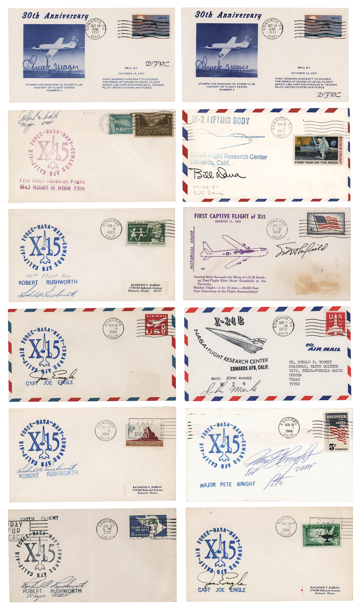 Group of 12 commemorative covers honoring flights of experimental aircraft including the X-15 and X-24B, each signed in ink by a legendary test pilot. Signers are: Chuck Yeager (2), Scott Crossfield, Joe Engle (2), Pete Knight, Bill Dana, Robert M. White, Robert A. Rushworth (3), and John Manke. In overall fine condition, with some staining to the Crossfield cover.