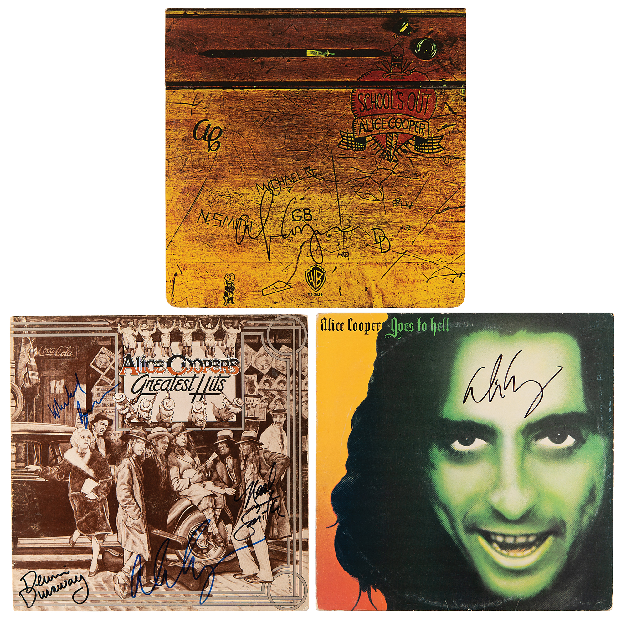 Three albums signed on the front cover in blue or black felt tip by Alice Cooper: Greatest Hits compilation album, Alice Cooper Goes to Hell, and School’s Out. The Greatest Hits album is also signed on the front cover by Dennis Dunaway, Neal Smith, and Michael Bruce. In overall fine condition. The records for the Alice Cooper Goes to Hell and School's Out albums are included.