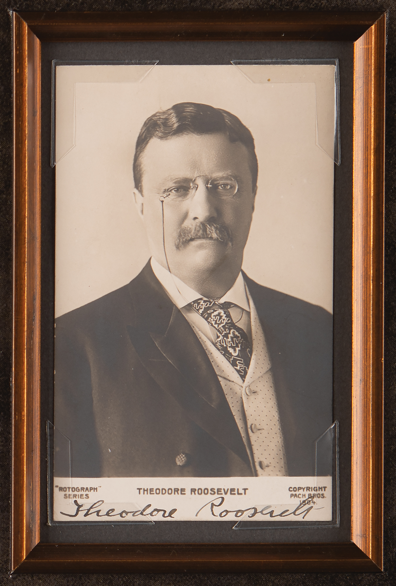 Uncommon matte-finish 3.25 x 5.25 postcard photograph of Theodore Roosevelt by the Pach Brothers Studio of New York, as part of the ‘Rotograph’ series, signed nicely in the lower border in fountain pen. Archivally matted and framed to an overall size of 13.75 x 15.75. In very fine condition. Accompanied by a full letter of authenticity from JSA.