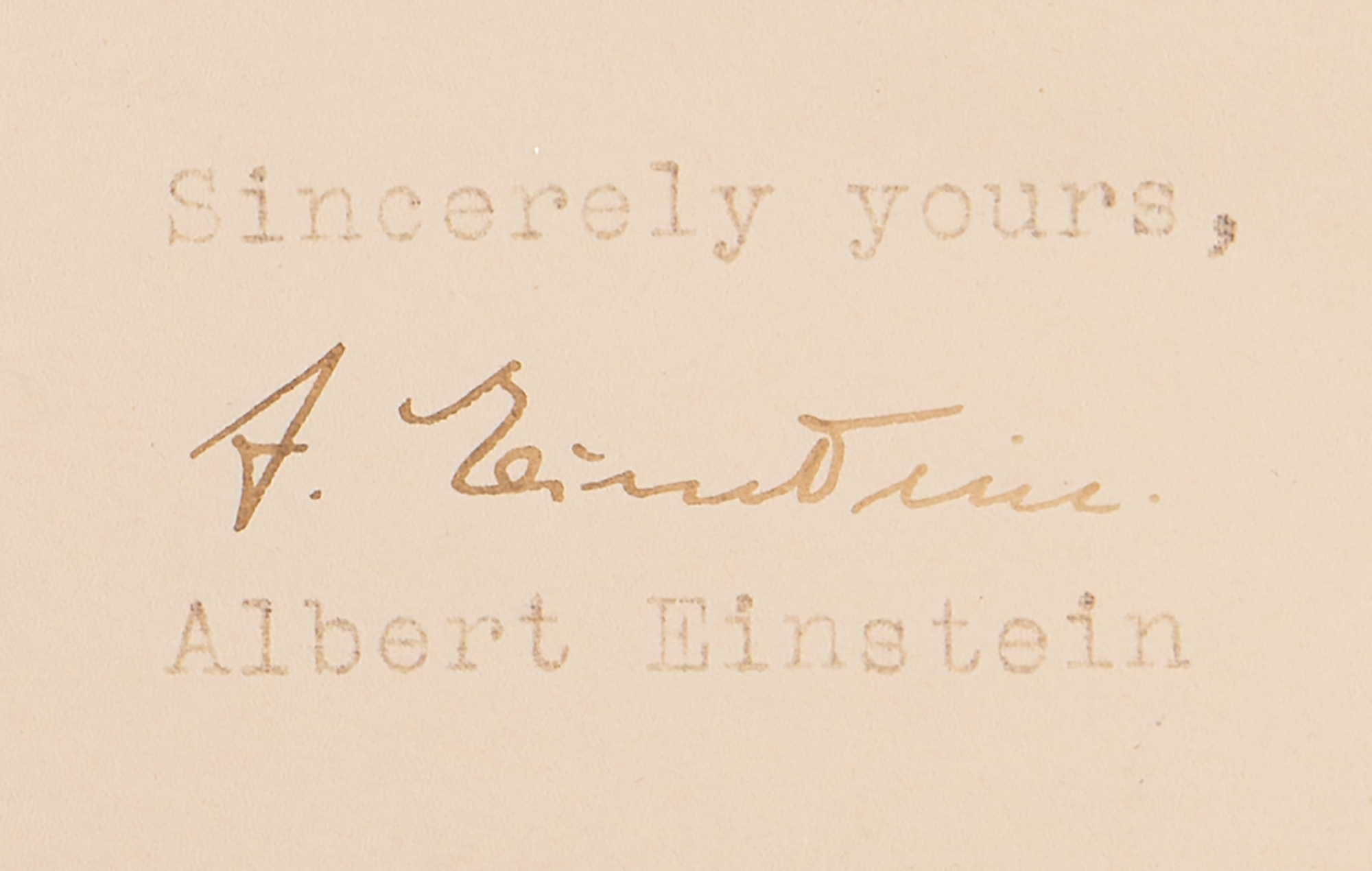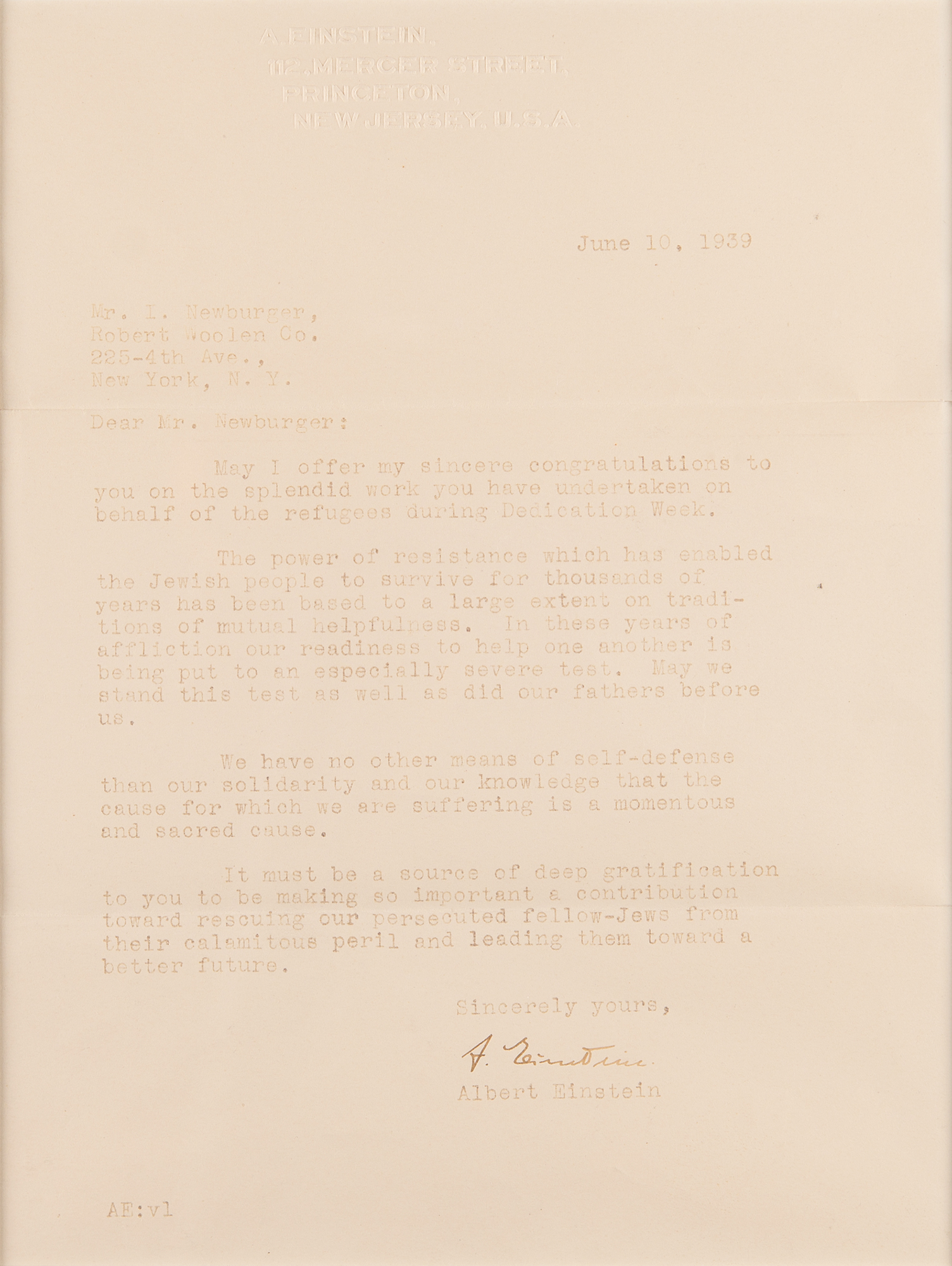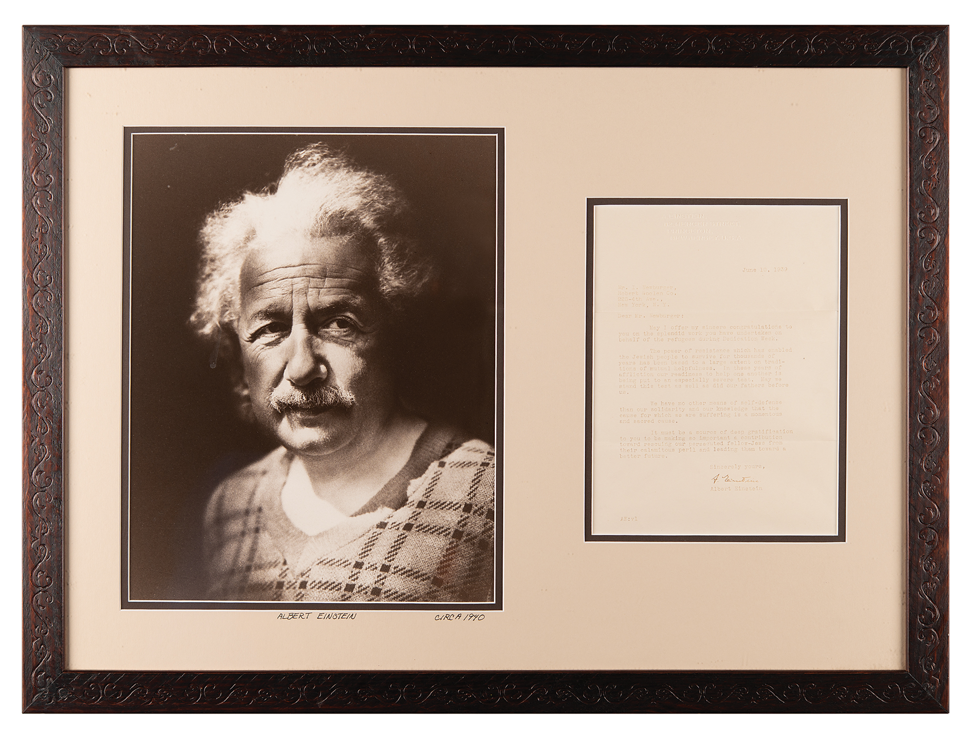 TLS signed "A. Einstein," one page, 7 x 9.25, personal embossed letterhead, June 10, 1939. Letter to Mr. I. Newburger at Robert Woolen Co., in full: "May I offer my sincere congratulations to you on the splendid work you have undertaken on behalf of the refugees during Dedication Week. The power of resistance which has enabled the Jewish people to survive for thousands of years has been based to a large extent on traditions of mutual helpfulness. In these years of affliction our readiness to help one another is being put to an especially severe test. May we stand this test as well as did our fathers before us. We have no other means of self-defense than our solidarity and our knowledge that the cause for which we are suffering is a momentous and sacred cause. It must be a source of deep gratification to you to be making so important a contribution toward rescuing our persecuted fellow-Jews from their calamitous peril and leading them toward a better future." Archivally double-matted and framed with a large satin-finish photo of Einstein to an overall size of 26.5 x 19.75, with collector's ink notations below the photo. In fine condition, with overall fading.