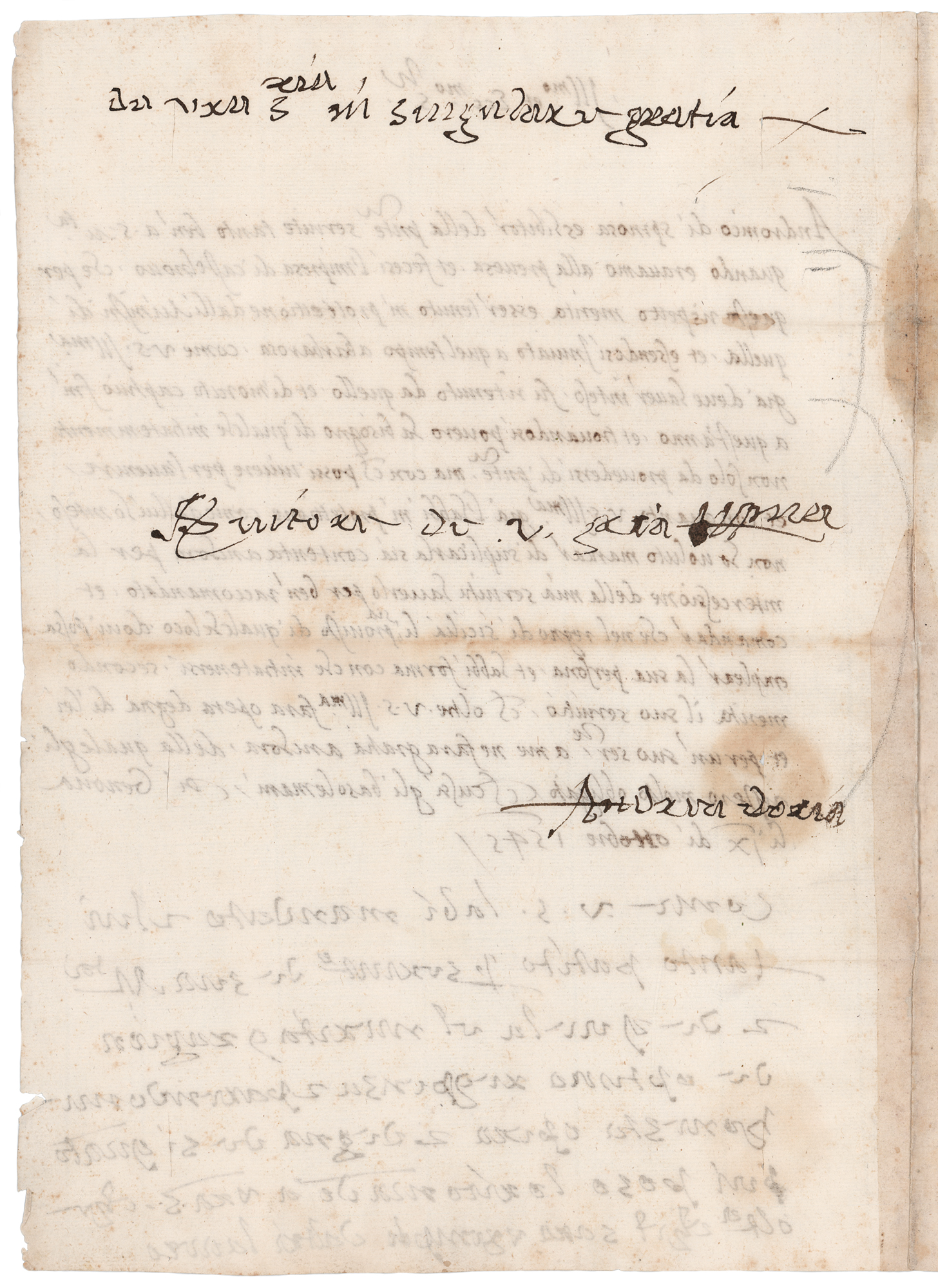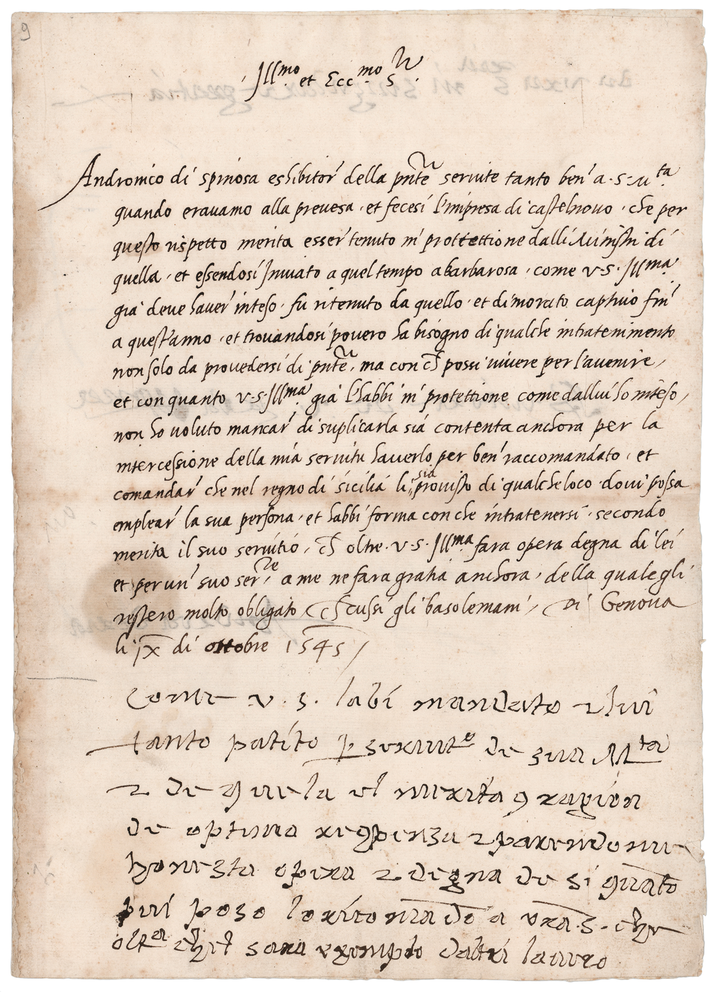 Italian condottiero and admiral from Genoa (1466–1560). Partial ALS in Italian, one page both sides, 8.5 x 11.75, October 9, 1545. Untranslated letter to Prince Ferdinand Gonzaga recommending the endorsement of Andronicio di Spinosa, with the second part of the letter written entirely in the hand of Doria, who signs at the conclusion of the second page. In very good to fine condition, with scattered light toning and a circular seal-related stain.