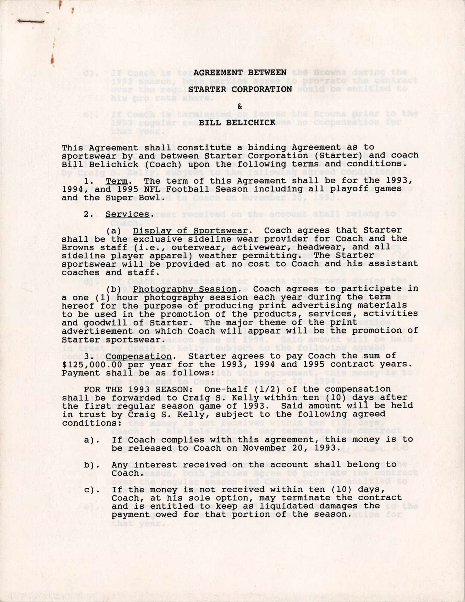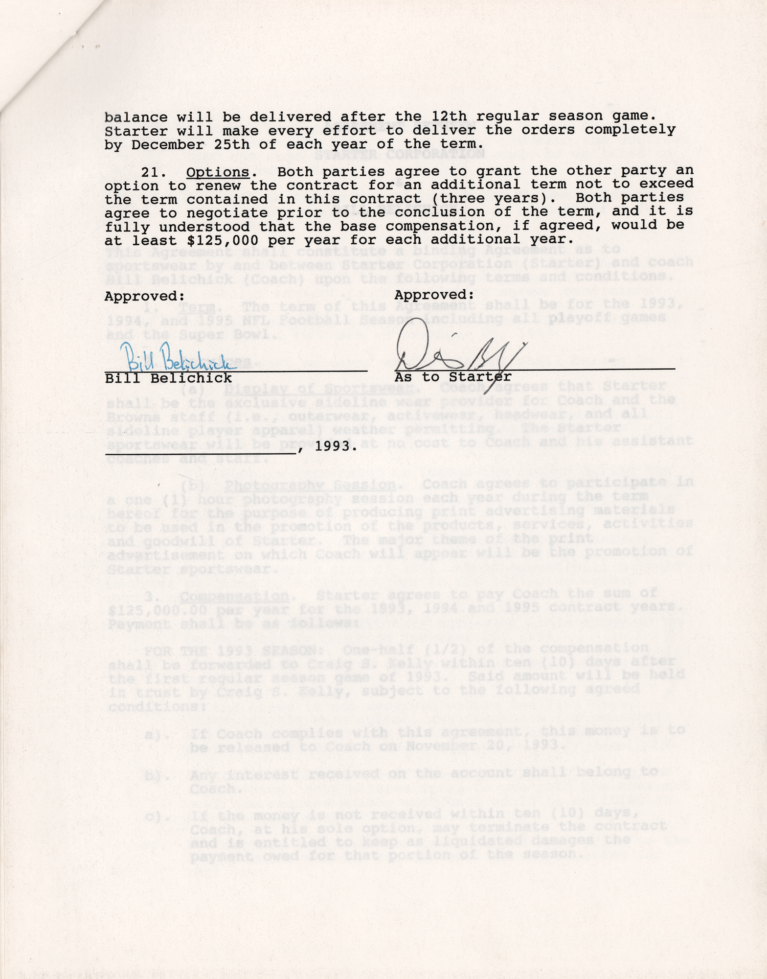 DS, seven pages, 8.5 x 11, 1993. Contract between the Starter Corporation and Bill Belichick, head coach of the Cleveland Browns football team of the NFL, with the latter agreeing “that Starter shall be the exclusive sideline wear provider for Coach and the Browns staff,” which will provided “at no cost to Coach and his assistant coaches and staff,” for the 1993, 1994, and 1995 NFL seasons, “including all playoff games and the Super Bowl.” Additionally, Belichick must participate in a one-hour photography session each year. As compensation, Starter agrees to pay Belichick $125,000 per year. Signed at the conclusion in blue ballpoint by Belichick. A copy of the contract is stapled to the last page. In fine condition.