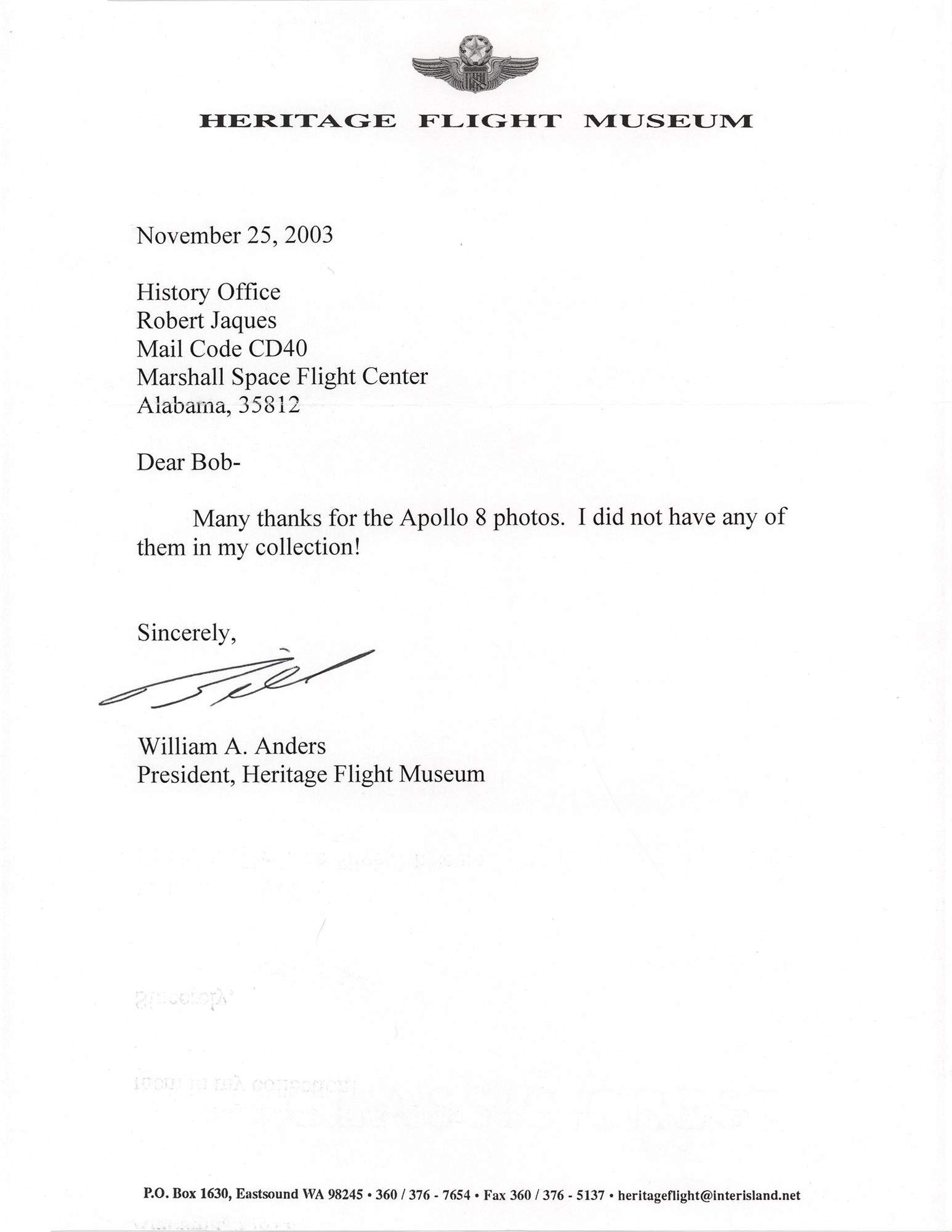 TLS signed “Bill,” one page, 8.5 x 11, Heritage Flight Museum letterhead, November 25, 2003. Brief letter to Robert Jaques of the History Office at the Marshall Space Flight Center: “Many thanks for the Apollo 8 photos. I did not have any of them in my collection!” In fine condition.