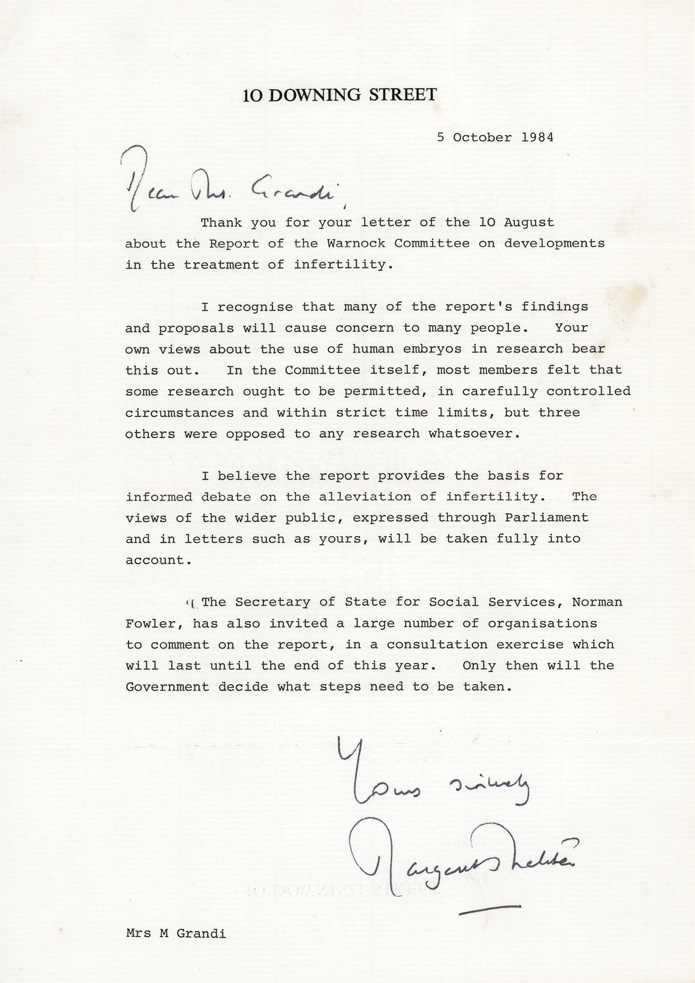 TLS as Prime Minister, signed “Yours sincerely, Margaret Thatcher,” one page, 8.25 x 11.75, 10 Downing Street letterhead, October 5, 1984. Letter to Mrs. M. Grandi, in full: “Thank you for your letter of the 10 August about the Report of the Warnock Committee on developments in the treatment of infertility. I recognise that many of the report's findings and proposals will cause concern to many people. Your own views about the use of human embryos in research bear this out. In the Committee itself, most members felt that some research ought to be permitted, in carefully controlled circumstances and within strict time limits, but three others were opposed to any research whatsoever. I believe the report provides the basis for informed debate on the alleviation of infertility. The views of the wider public, expressed through Parliament and in letters such as yours, will be taken fully into account. The Secretary of State for Social Services, Norman Fowler, has also invited a large number of organisations to comment on the report, in a consultation exercise which will last until the end of this year. Only then will the Government decide what steps need to be taken.” Thatcher adds the salutation in her own hand. In fine condition.