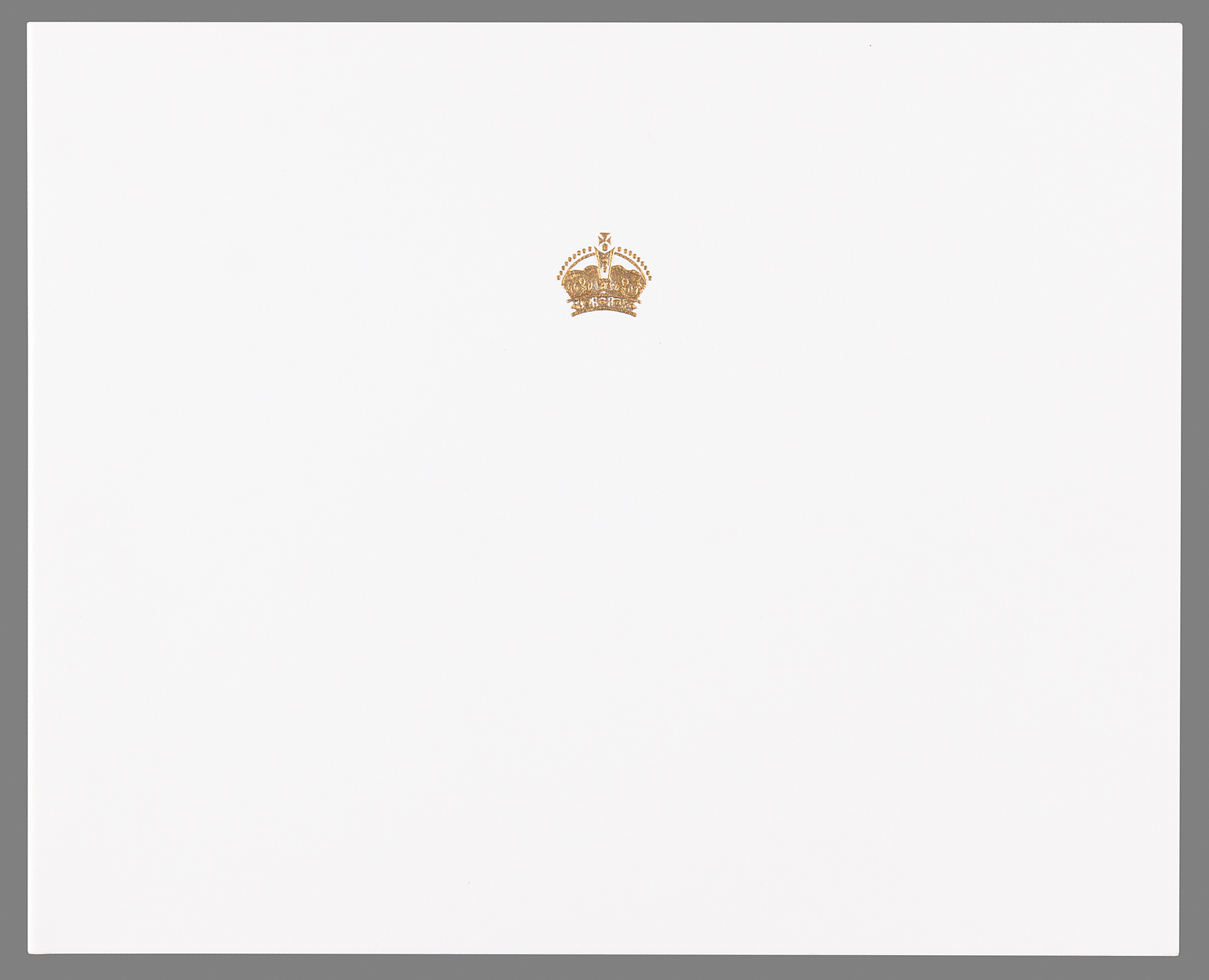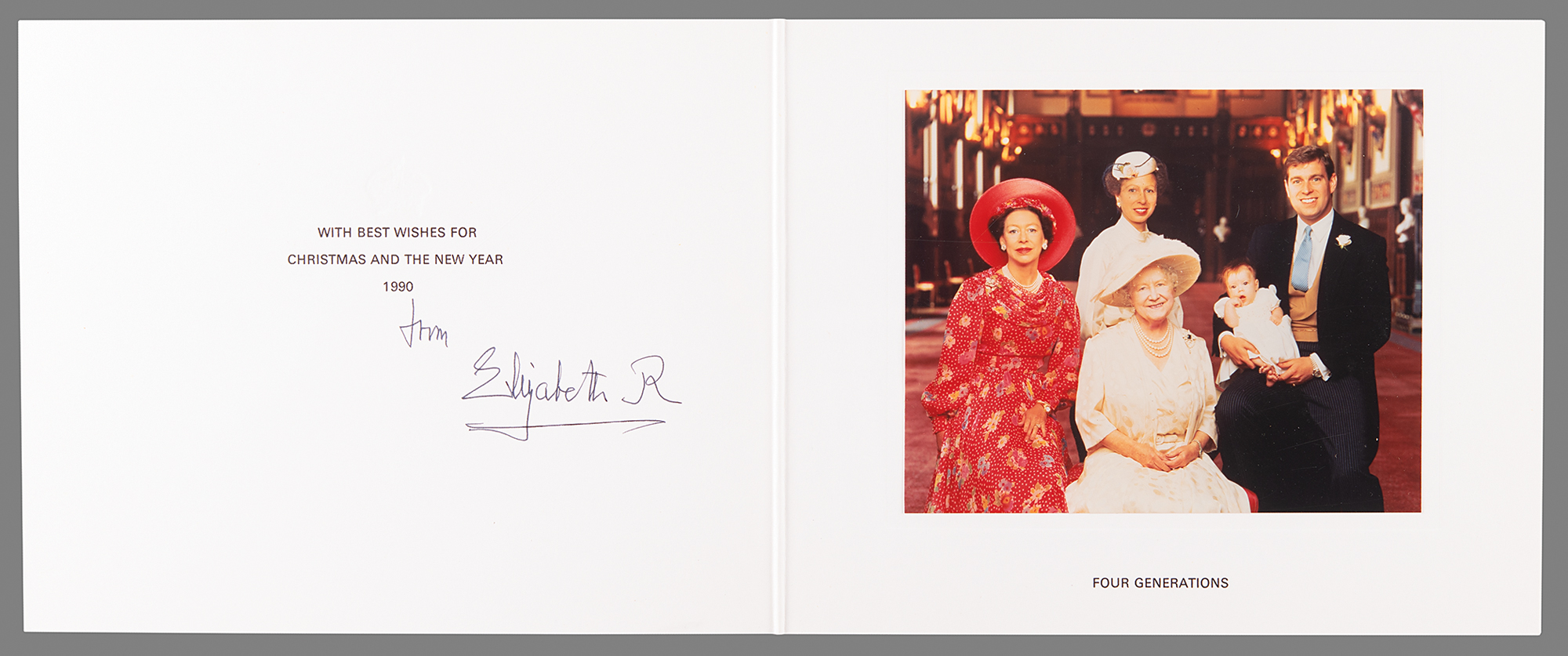 Royal Christmas and New Year's card from 1990 with an embossed royal crown on the front, measuring 18 x 7.25 open, featuring an affixed color photo of four generations of the royal family, signed on the adjacent side in black ink, “from, Elizabeth R.” In very fine condition.
