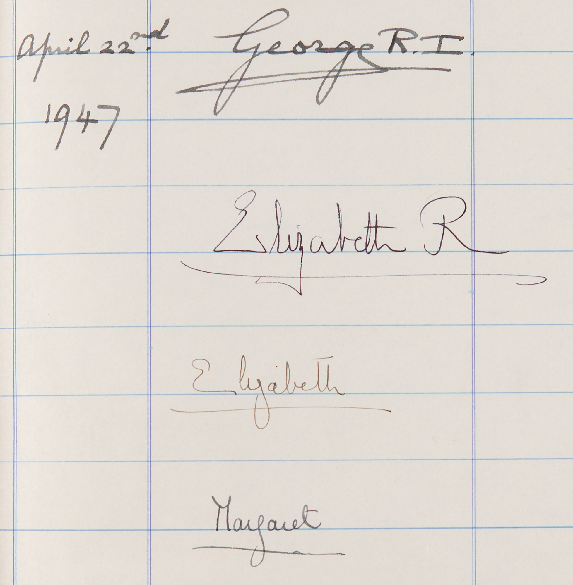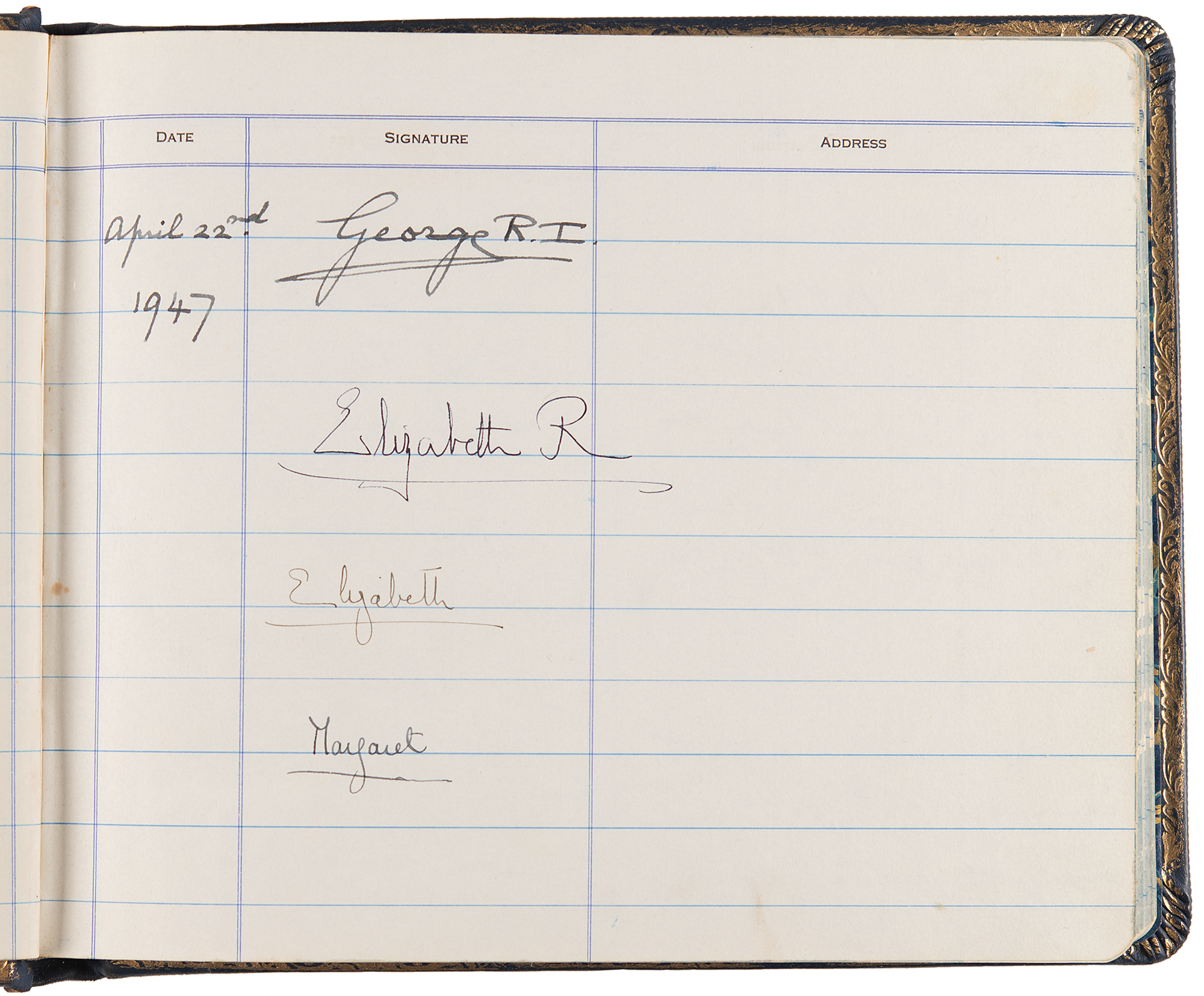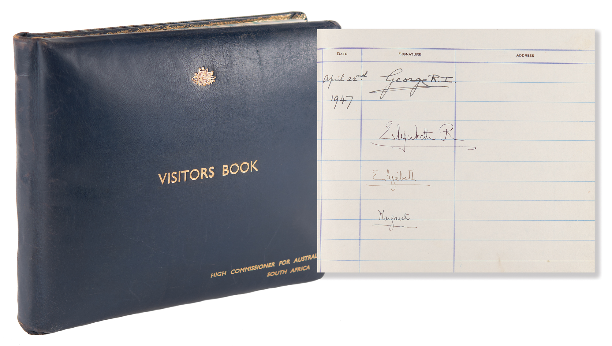 Vintage leather-bound visitor book belonging to Sir George Knowles, the “High Commissioner for Australia” to South Africa, 11.5˝ x 10˝, signed on an opening page in black ink and fountain pen by the royal family, including Queen Elizabeth, The Queen Mother, “Elizabeth R.,” King George VI, “George R. I.,” who adds “April 22nd, 1947,” and their two princess daughters, “Elizabeth” and “Margaret.” Several pages are also signed by various South African and international politicians and diplomats. In fine condition. The royal family embarked on a royal tour of South Africa that lasted from February to April 1947 and included visits to several cities and towns across South Africa. It was an important event, as it marked the first visit by a reigning British monarch to South Africa. Also of note, this book was signed by Princess Elizabeth the day after her 21st birthday, when she gave a legendary radio address while in South Africa, dedicating herself to serving the Commonwealth for her ‘whole life, whether it be long or short.’