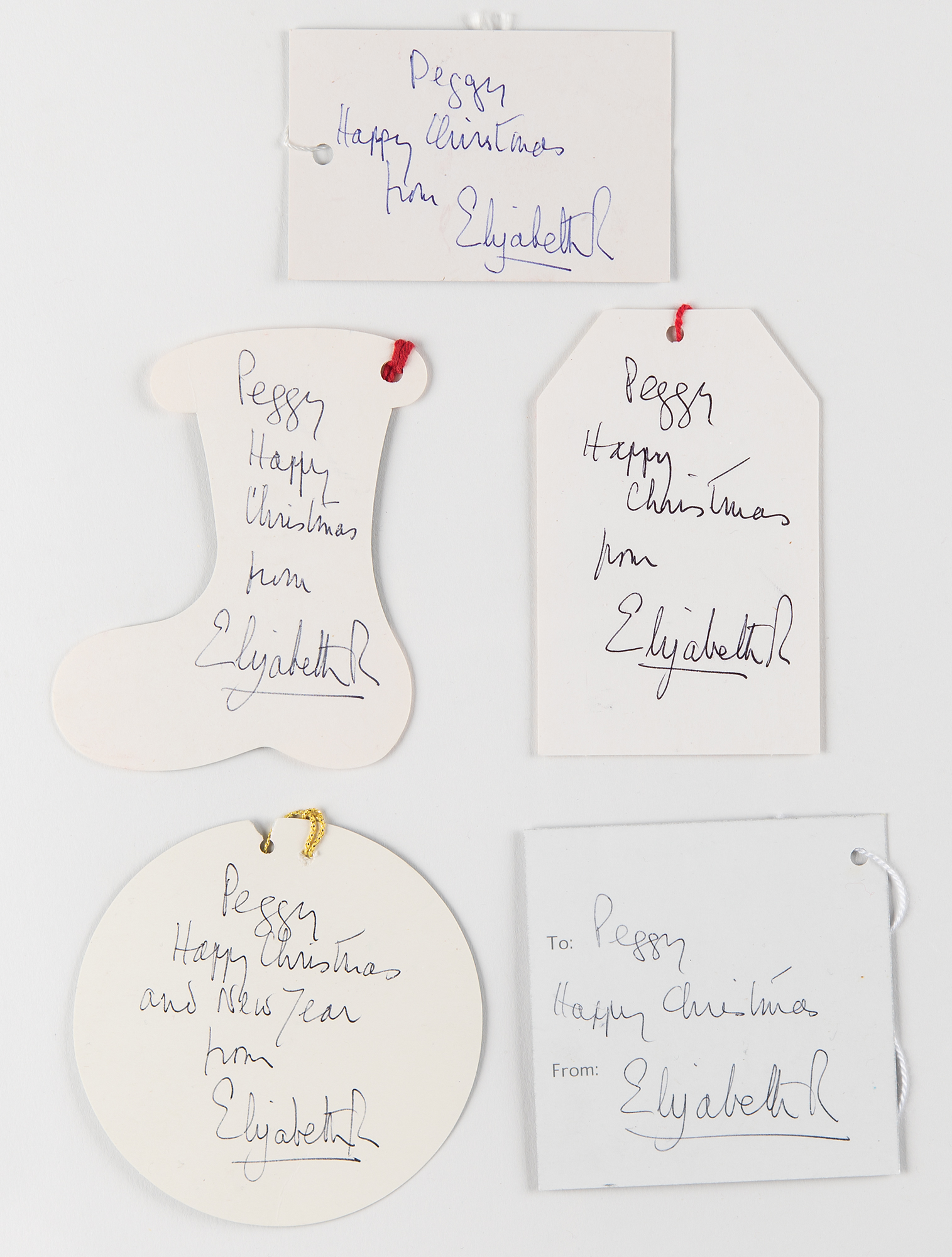 Attractive set of five Christmas gift tags from Queen Elizabeth II, ranging in size from 3.25 x 2.25 to 3.25 x 4, each hand-signed and inscribed in ballpoint or ink, “Peggy, Happy Christmas, from Elizabeth R.,” who adds a New Year’s greeting to one gift tag. In overall fine condition.