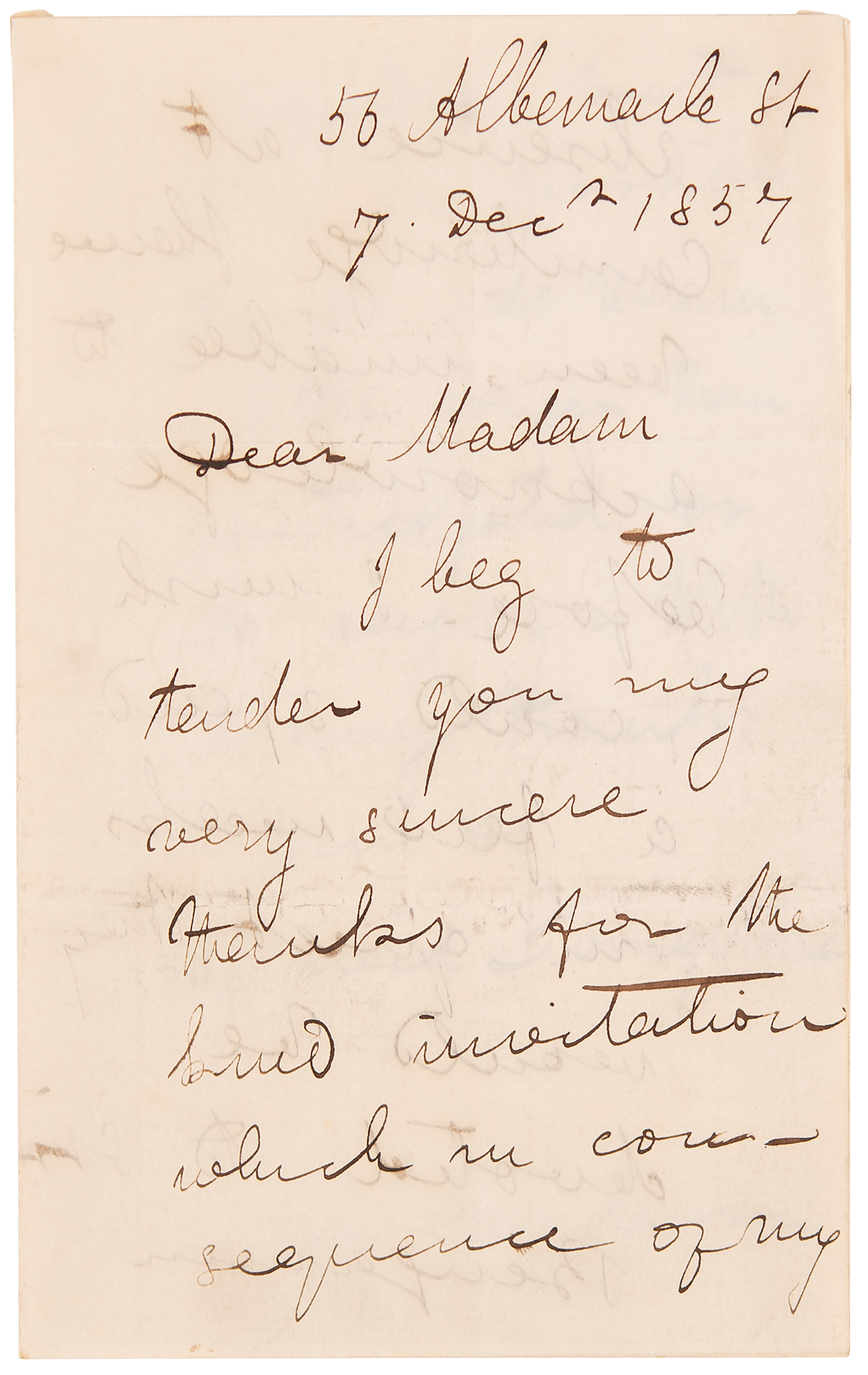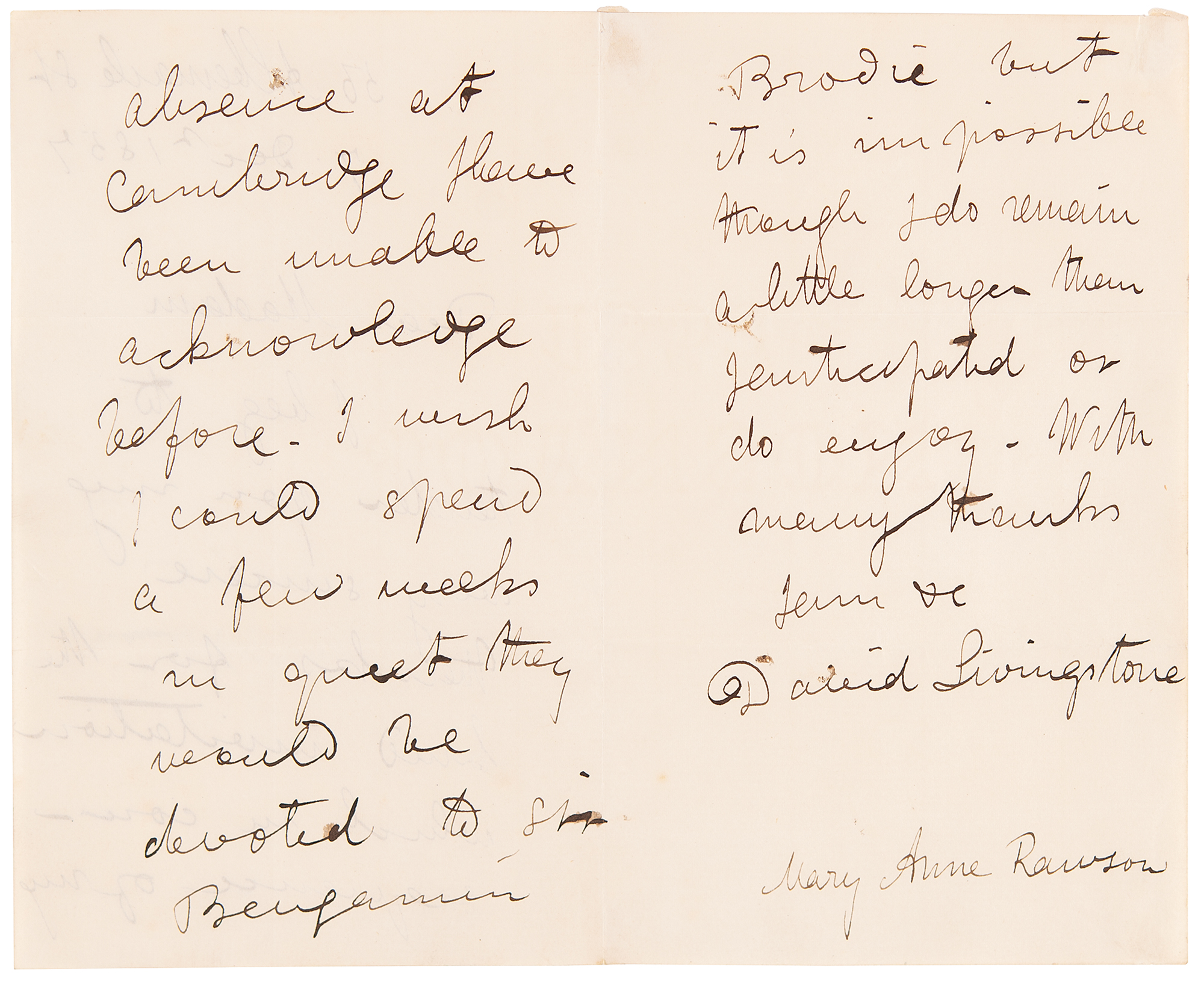 Scottish missionary and explorer (1813–1873) who 'disappeared' on an expedition to find the source of the Nile only to be famously rediscovered by Henry M. Stanley several years later. ALS, three pages on two adjoining sheets, 4.5 x 7.25, December 7, 1857. Addressed from Albemarle Street in London, a handwritten letter to abolitionist Mary Anne Rawson, in full: “I beg to tender you my very sincere thanks for the kind invitation which in consequence of my absence at Cambridge I have been unable to acknowledge before. I wish I could spend a few weeks in quiet they would be devoted to Benjamin Brodie but it is impossible though I do remain a little longer than anticipated or do enjoy.” Included with the letter are two pieces of wood, 2.5˝ x .75˝ and 2˝ x 1.5˝, both bearing affixed sheets with handwritten affirmations identifying them as deriving “from the tree under which was buried the heart of Dr. Livingstone.” Includes four leaves from said burial tree, as well as a period transmittal envelope annotated “Leaves from the tree under which Livingstone's heart was buried, given by the Rev R. Stewart Wright.” R. Stewart Wright (1858-1932) was an Edinburgh-born missionary with the London Missionary Society in Africa. In fine condition.