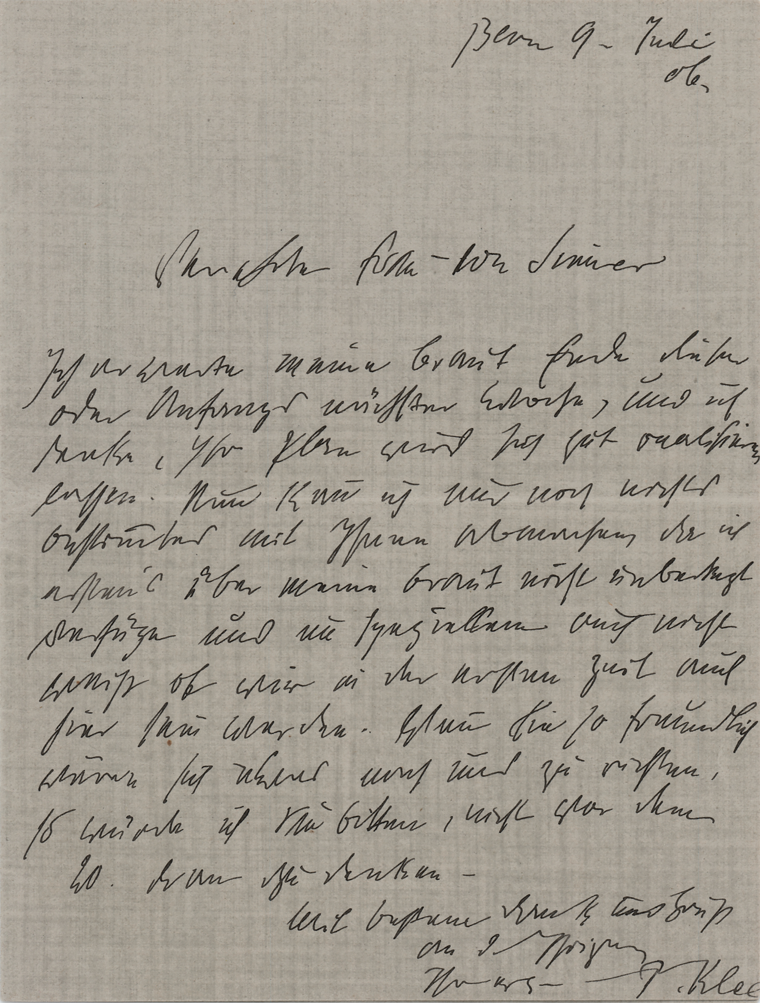 Important Swiss-German artist (1879-1940) whose works incorporate a number of the most influential movements of the day, including Surrealism, Expressionism, and Cubism. ALS in German, signed "P. Klee," one page, 5 x 6.75, July 9, 1906. Addressed from Bern, Switzerland, a handwritten letter to Marie von Sinner, an early collector of Klee's art, in part (translated): “I expect my bride or the beginning of the end of next week, and I think your plan will realize good. Now I can settle just yet given to you when I first inform my fiancee is not necessarily possession and specifically does not know whether we will be the first time here. If you were kind enough to send in the evening for us, I would ask you not before 20 to think about it." In fine condition.