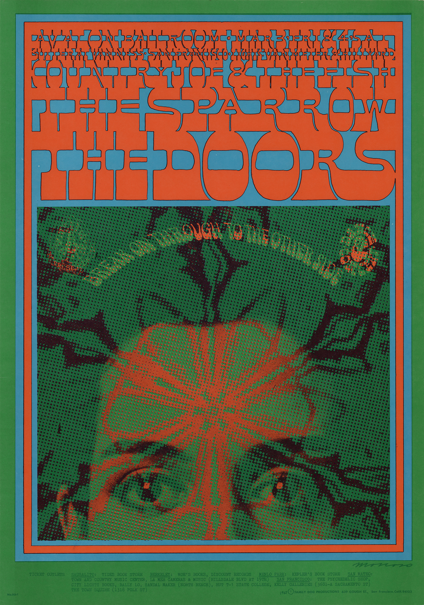Original third printing color 14 x 20 Family Dog concert poster (FD-50) for The Doors, with Country Joe & the Fish and The Sparrow, at the Avalon Ballroom on March 3 and 4, 1967. Designed by artist Victor Moscoso, the poster features a psychedelic portrait below one of Jim Morrison's famous lyrics: "Break on through to the other side." In fine condition.