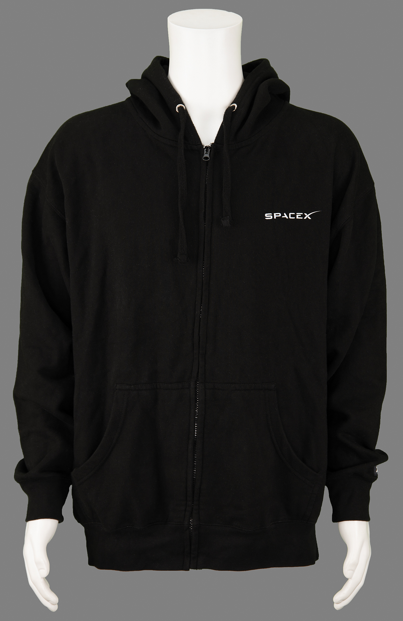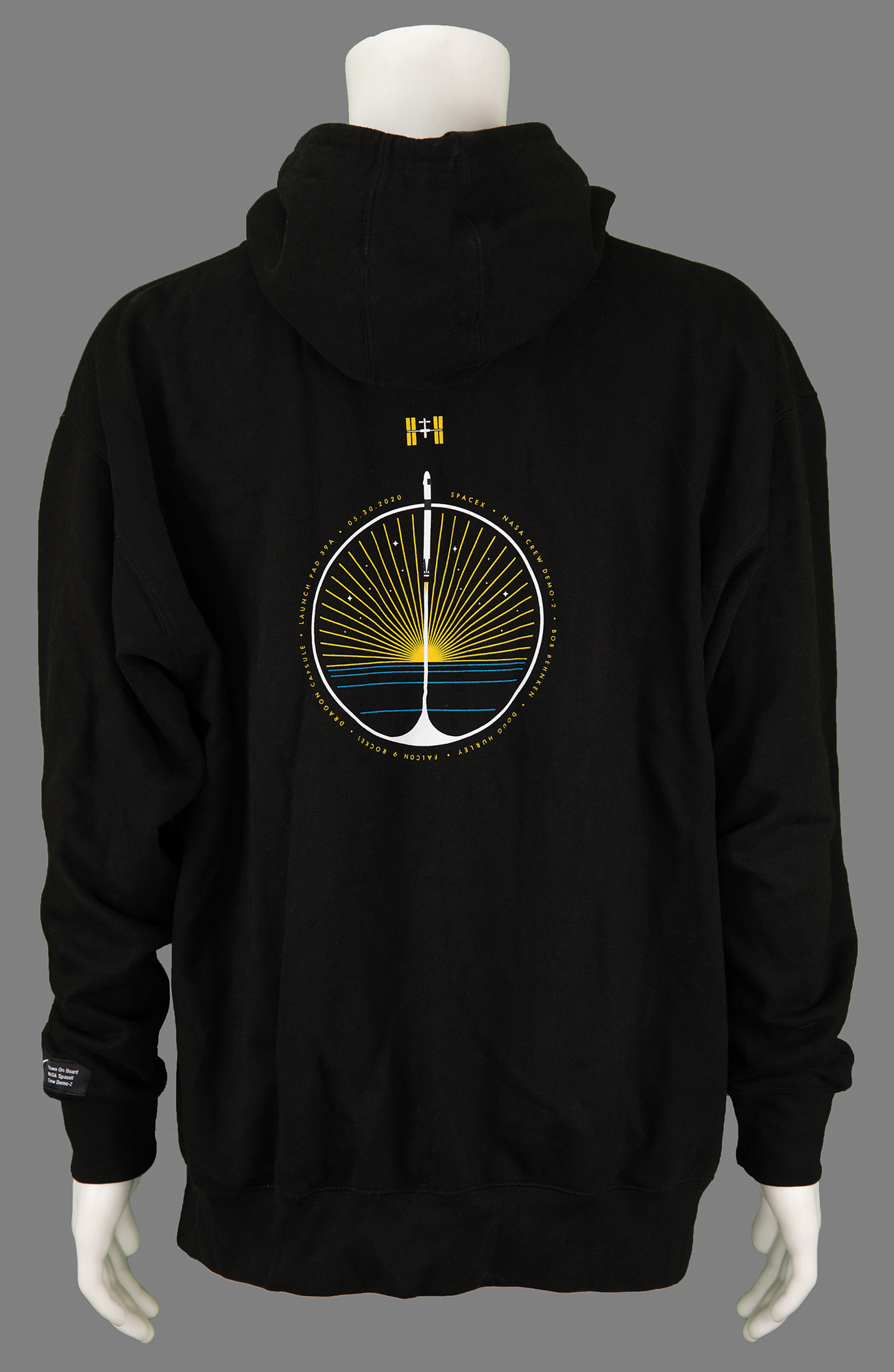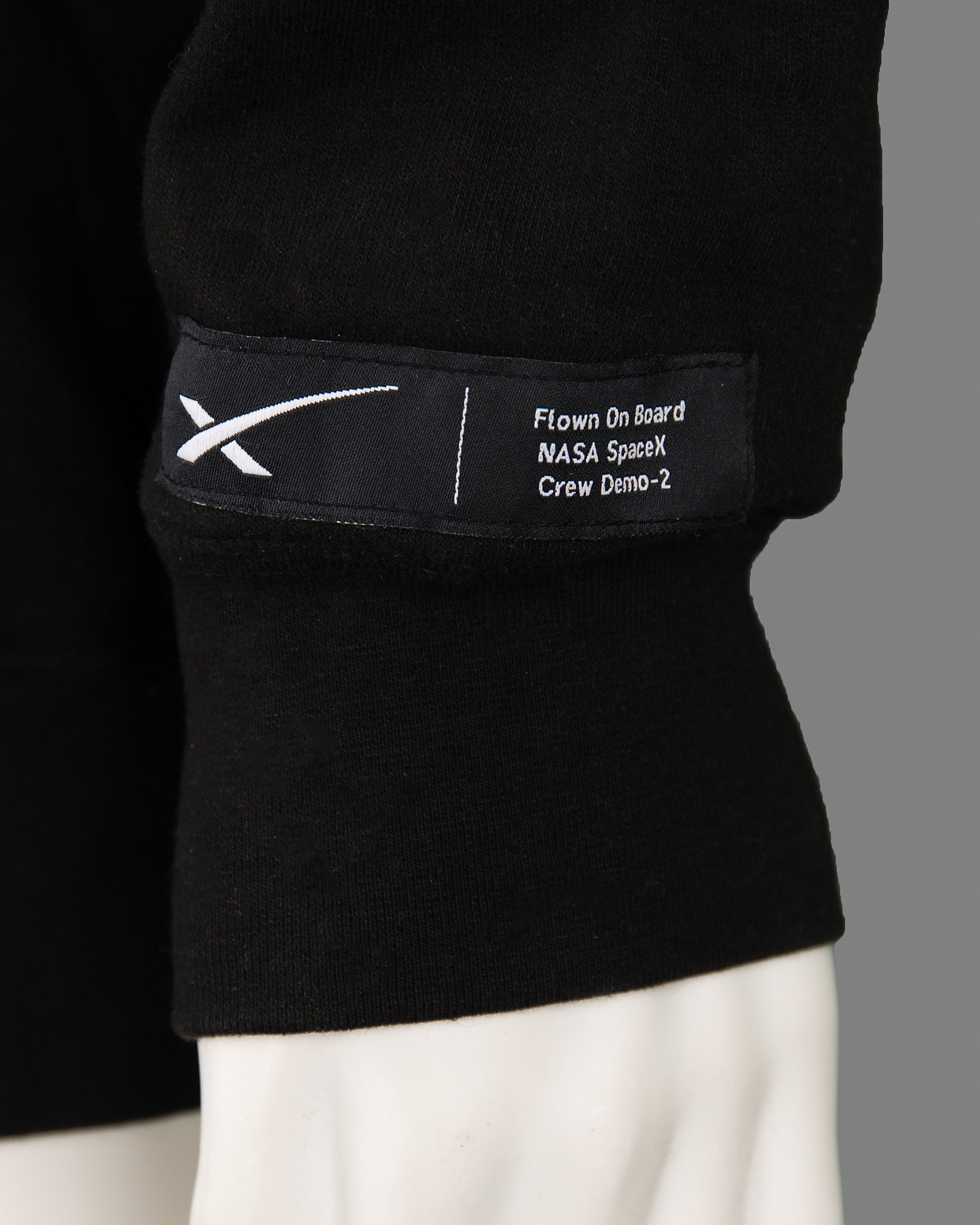 Interesting 3.5˝ x 1˝ SpaceX logo tag flown on the Crew Dragon Demo-2 test flight on May 30, 2020, reading: "Flown On Board NASA SpaceX Crew Demo-2." The tag is sewn to the wrist of a black SpaceX zip-up hooded sweatshirt, size XL, featuring the SpaceX logo on the chest and a graphic commemorating the Crew Dragon Demo-2 flight on the back. In fine condition.
