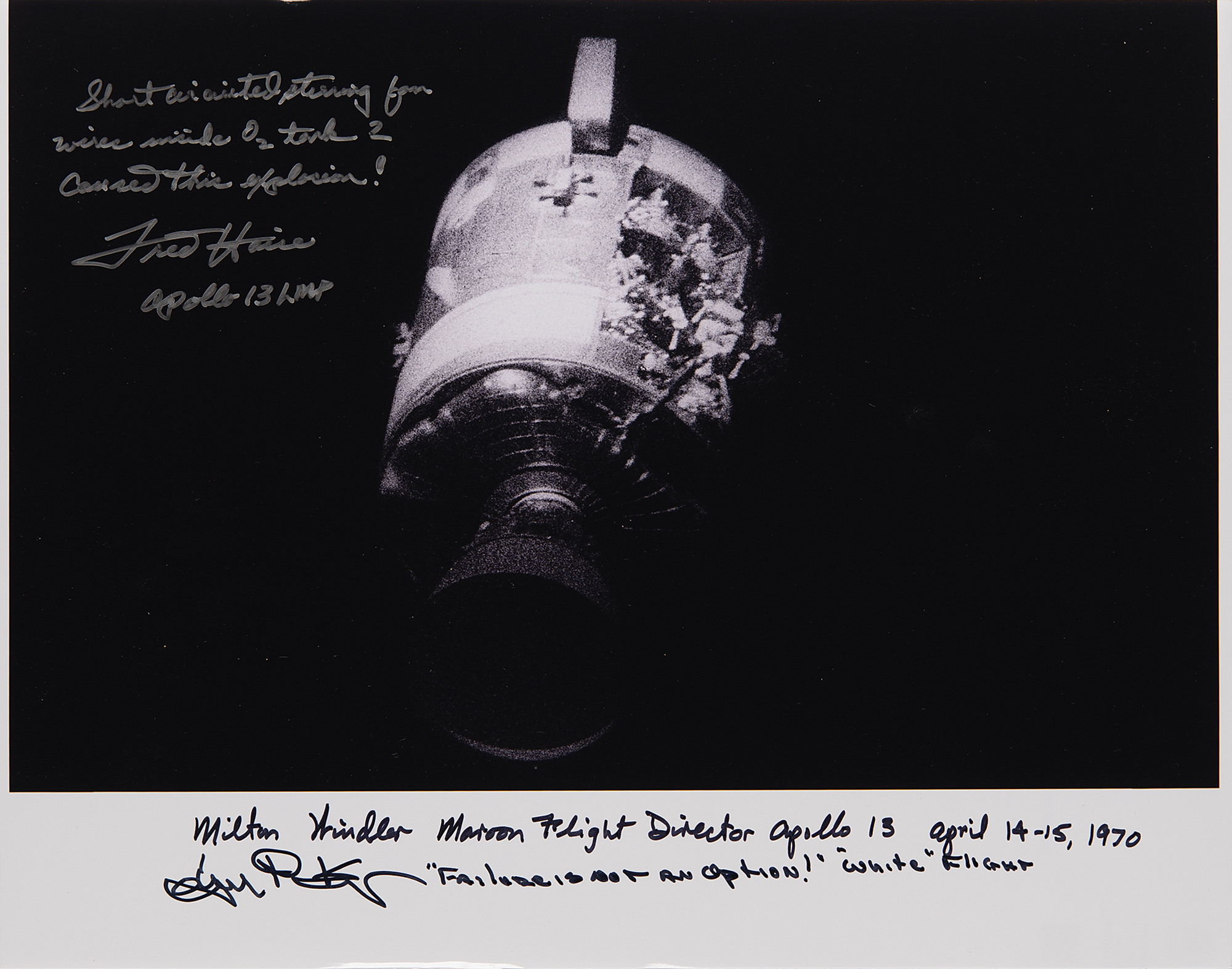 Satin-finish 14 x 11 photo of the damaged Apollo 13 capsule, signed in silver ink, “Short circuited string from wires inside O2 tank 2 caused this explosion! Fred Haise, Apollo 13 LMP,” and in the lower border in black felt tip, “Milton Windler, Maroon Flight Director, Apollo 13, April 14-15, 1970,” and “Gene Kranz, ‘Failure is not an option!’ ‘White’ Flight.” In fine condition.