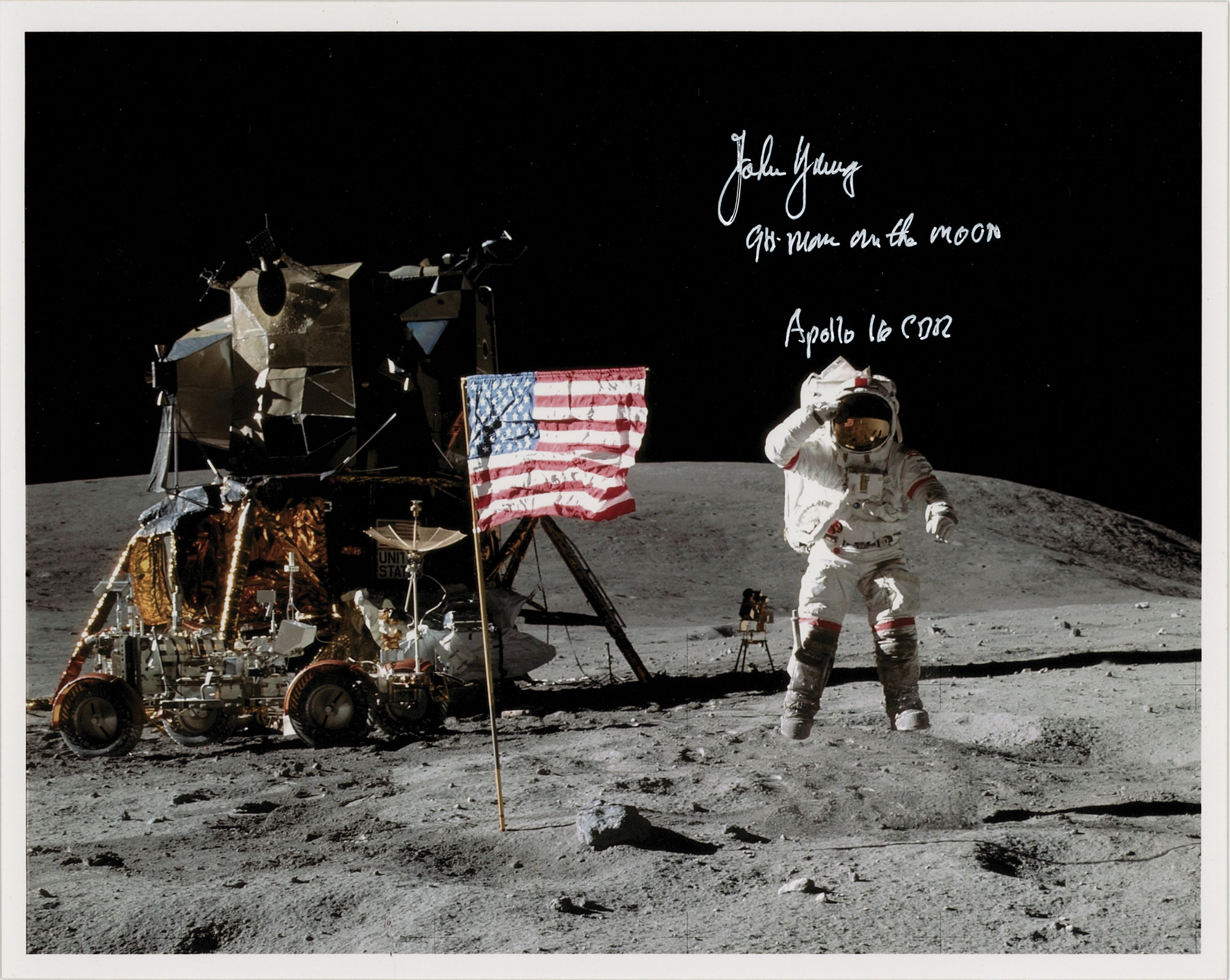 Color satin-finish 10 x 8 photo of moonwalker John Young saluting the American flag and leaping from the lunar surface during the Apollo 16 mission, signed in white paint pen, “John Young, 9th man on the moon, Apollo 16 CDR.” In very fine condition.