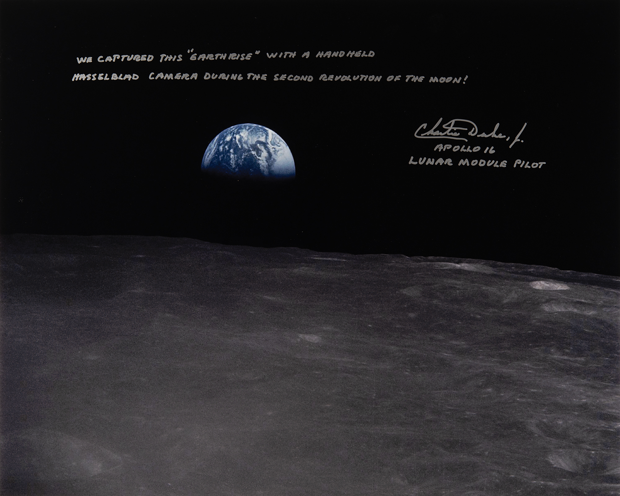 Color semi-glossy 20 x 16 photo of an 'Earthrise' taken during the Apollo 16 mission, signed in silver ink, “We captured this ‘Earthrise’ with a handheld Hasselblad camera during the second revolution of the moon! Charlie Duke, Jr. Apollo 16, Lunar Module Pilot.” In fine condition. Accompanied by a photo of Duke at the time of signing.