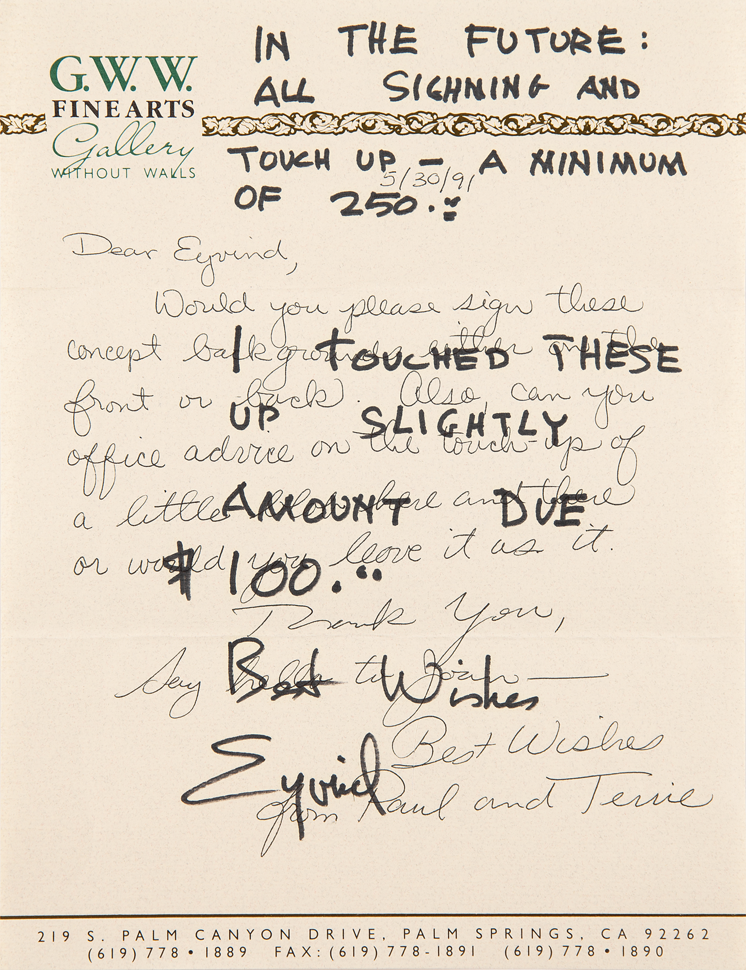 ALS signed “Eyvind,” handwritten in black felt tip over a letter sent to him by Paul and Terrie of G.W.W. Fine Arts, one page, 8.5 x 11, May 30, 1991, requesting that he sign “concept backgrounds” and offer advice on touch-ups. Earle's handwritten response: "I touched these up slightly. Amount due $100," with Earle adding above: "In the future: all signing and touch up – a minimum of 250." In fine condition.