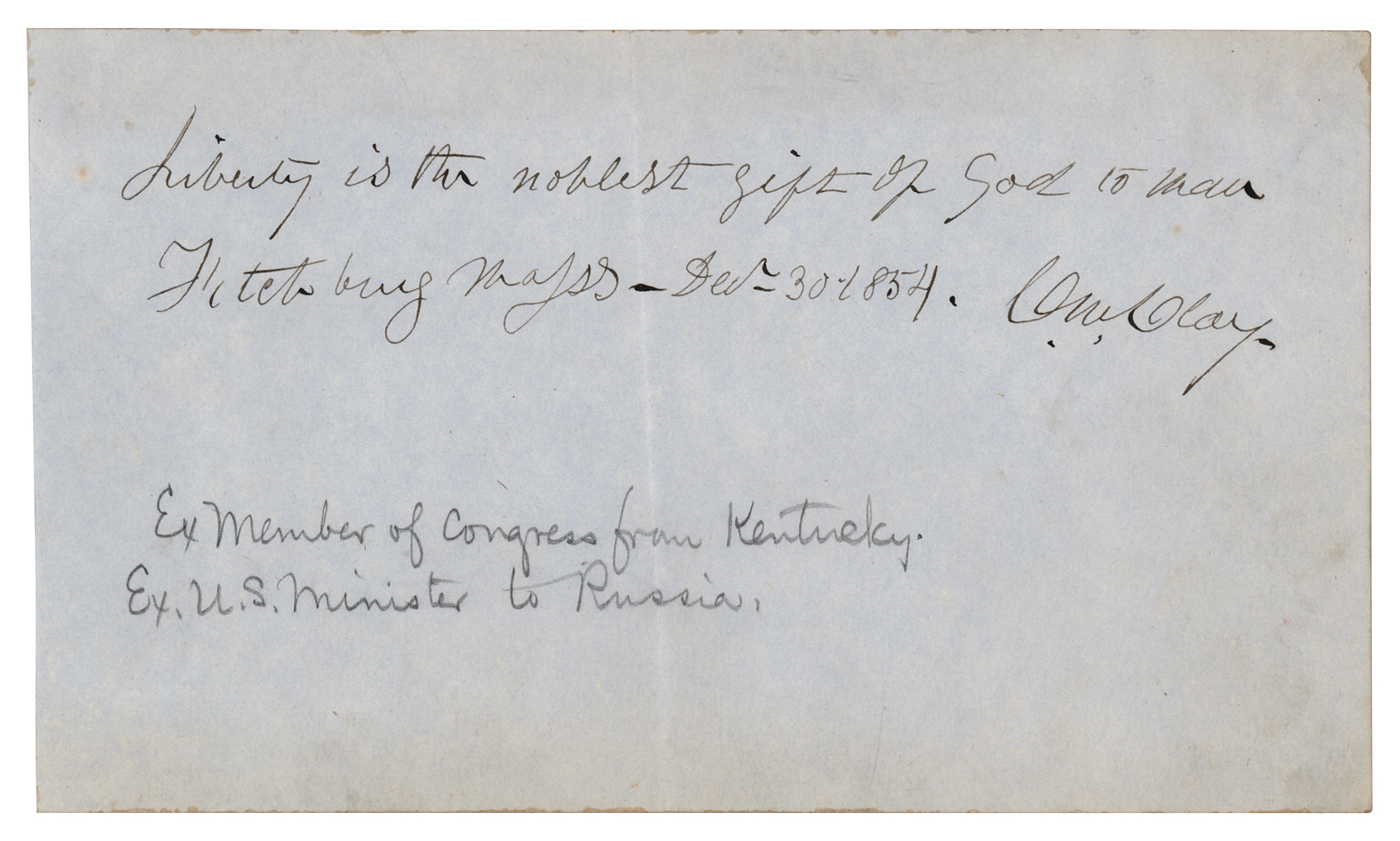 Prominent abolitionist leader (1810–1903) known as the 'Lion of Whitehall.' An ardent supporter of Lincoln, he served as American Minister to Russia from 1862 to 1869, in which capacity he was instrumental in negotiations for the purchase of Alaska. AQS signed "C. M. Clay," on a 7 x 4 album page, Fitchburg, Massachusetts, December 30, 1854. Clay pens a poignant abolitionist quote, in full: "Liberty is the noblest give of God to man." In fine condition, with a faint central vertical fold, and light show-through from old mounting remnants on the back.
