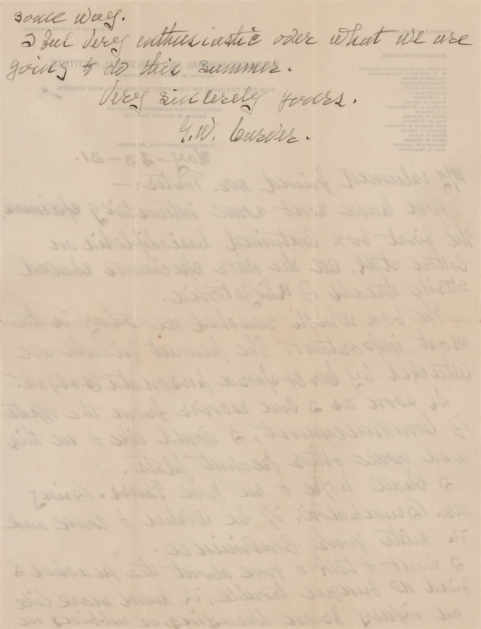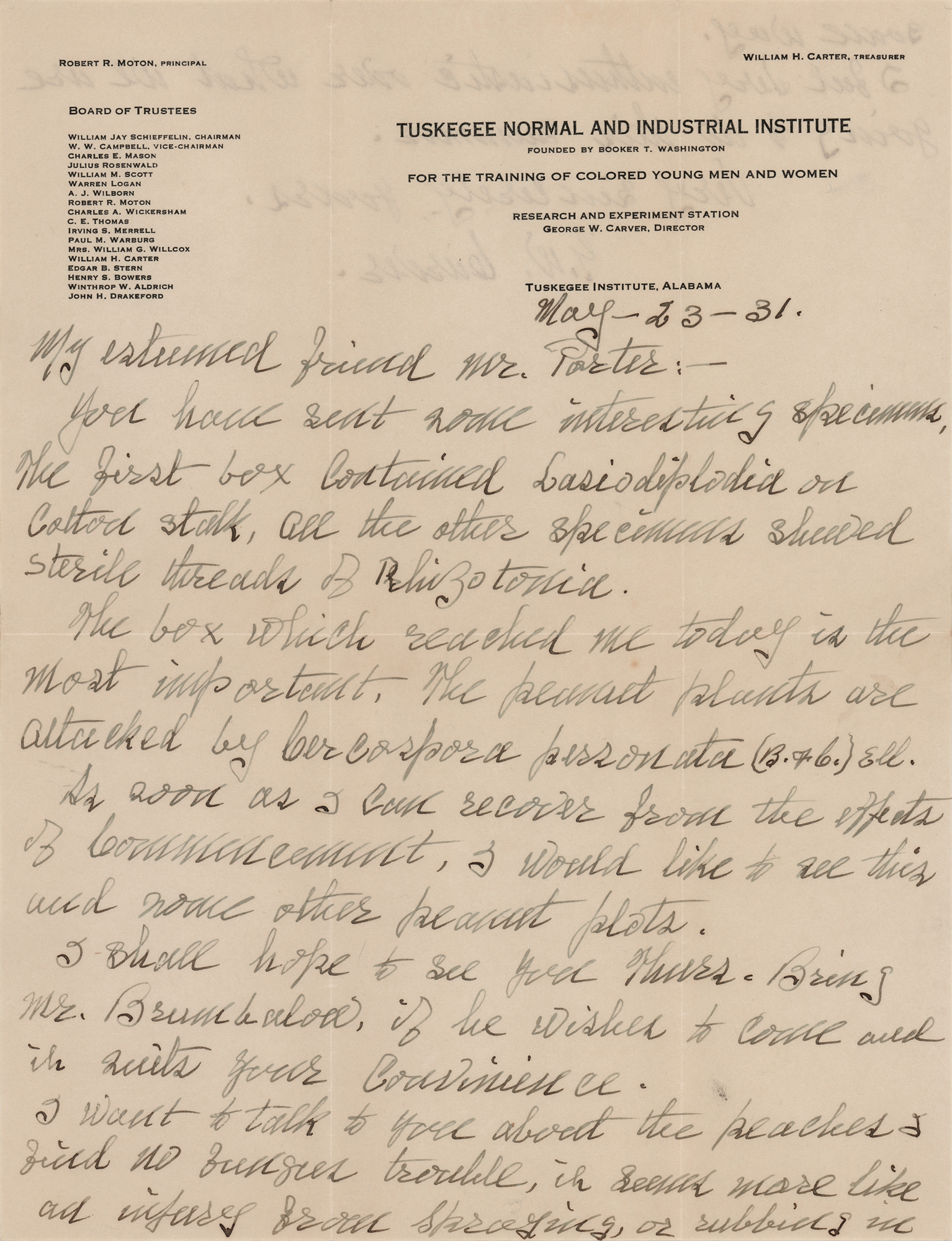 ALS signed “G. W. Carver,” one page both sides, 8 x 11.5, Tuskegee Normal and Industrial Institute letterhead, May 23, 1931. Handwritten letter to Geddy Porter in Fort Gaines, Georgia, in part: "You have sent some interesting specimens. The first box contained Lasiodiplodia or cotton stalk…The box which reached me today is the most important. The peanut plants are attacked by Cercospora personata…As soon as I can recover from the effects of Commencement, I would like to see this and some other peanut plots. I shall hope to see you Thurs…I want to talk to you about the peaches." In fine condition. Accompanied by the original mailing envelope, addressed in Carver's own hand.