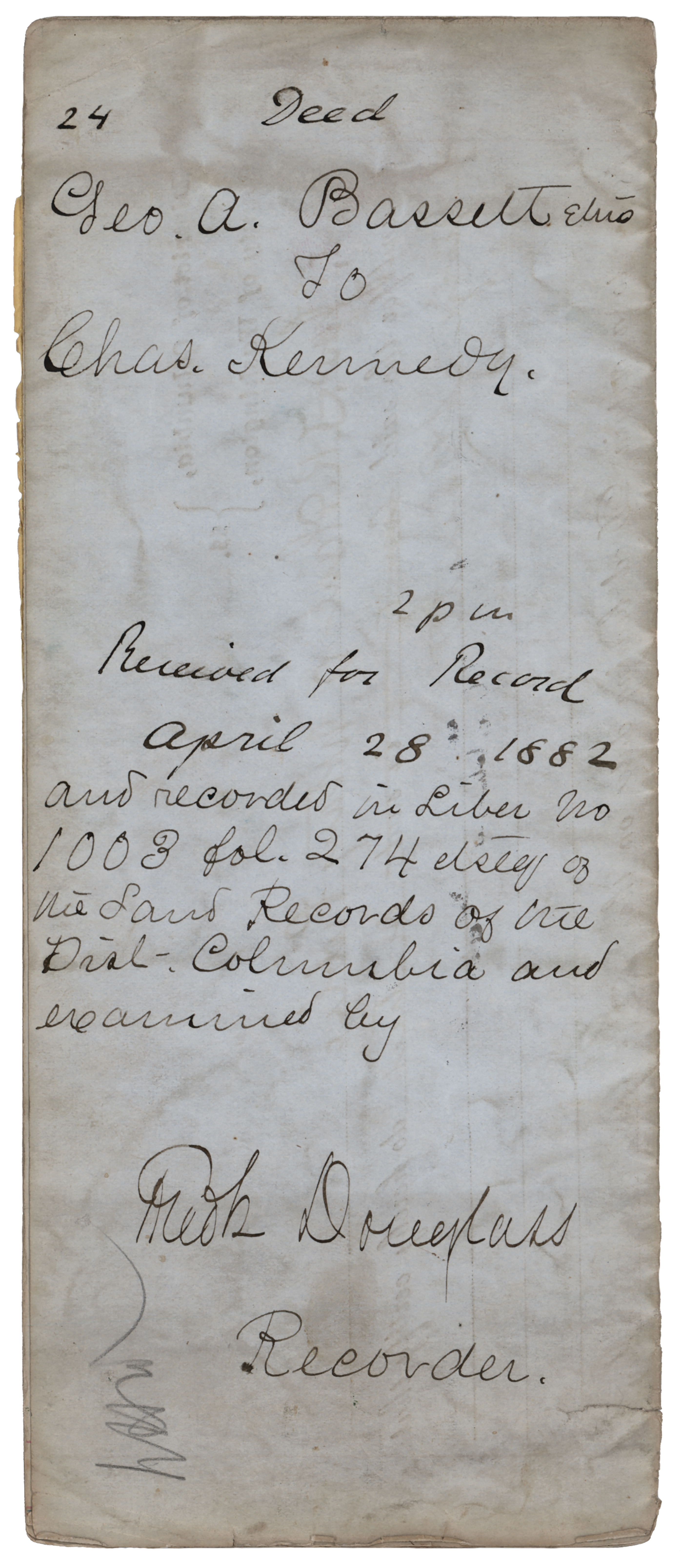 Partly-printed DS, signed “Fred'k Douglass,” three pages on two adjoining sheets, 8.5 x 14, April 28, 1882. Deed for a Washington, D.C. land transaction between George A. Bassett and Charles Kennedy, signed on the docketing panel in ink by Frederick Douglass as recorder of deeds. In very good condition, with light toning and soiling, and some splitting along the folds.