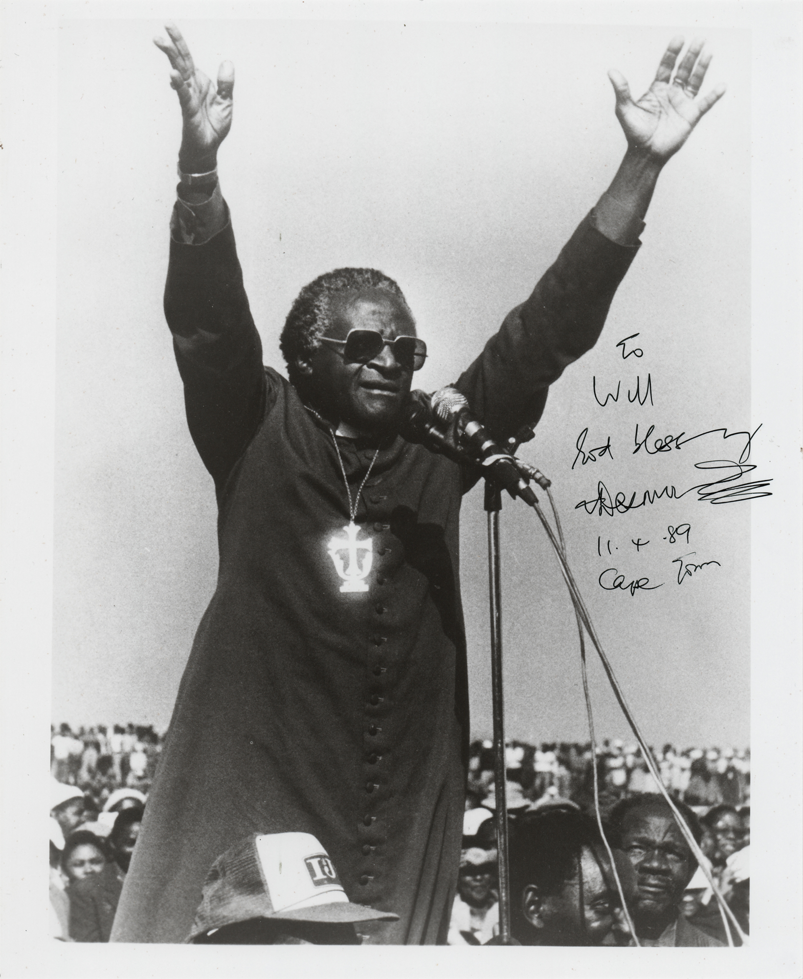 Glossy 8 x 9.75 photo of the anti-apartheid and human rights activist with his hands raised, signed and inscribed in black felt tip, "To Will, God bless you, Desmond Tutu, 11.4.89, Cape Town.” In fine condition, with scattered small creases.
