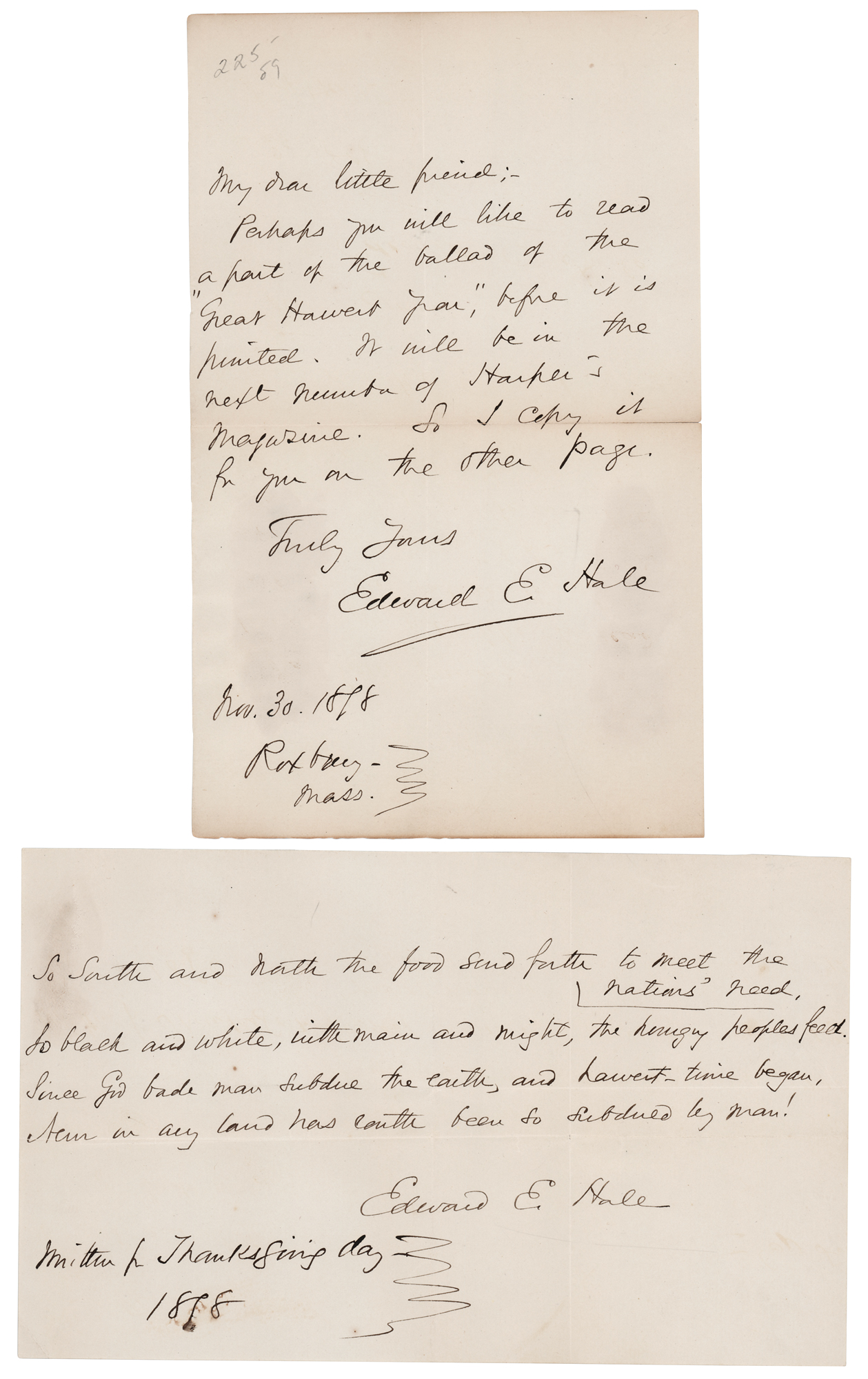 American author and Unitarian clergyman (1822–1909) remembered for his short story 'The Man Without a Country.' Two items: an AQS signed "Edward E. Hale," one page, 8 x 5, Thanksgiving Day, 1898, in full: "So South and North the food send forth to meet the nations' need, / So black and white, with main and might, the hungry peoples feed. / Since God bade man subdue the earth, and harvest-time began, / Never in any land has earth been so subdued by man!"; and an ALS signed "Edward E. Hale, one page, 5 x 8, November 30, 1898, in part: "Perhaps you will like to read a part of the ballad of the 'Great Harvest Year,' before it is printed. It will be in the next number of Harper's Magazine." In fine condition, with light show-through from old mounting remnants on the back, and a partial split to the letter's horizontal fold.