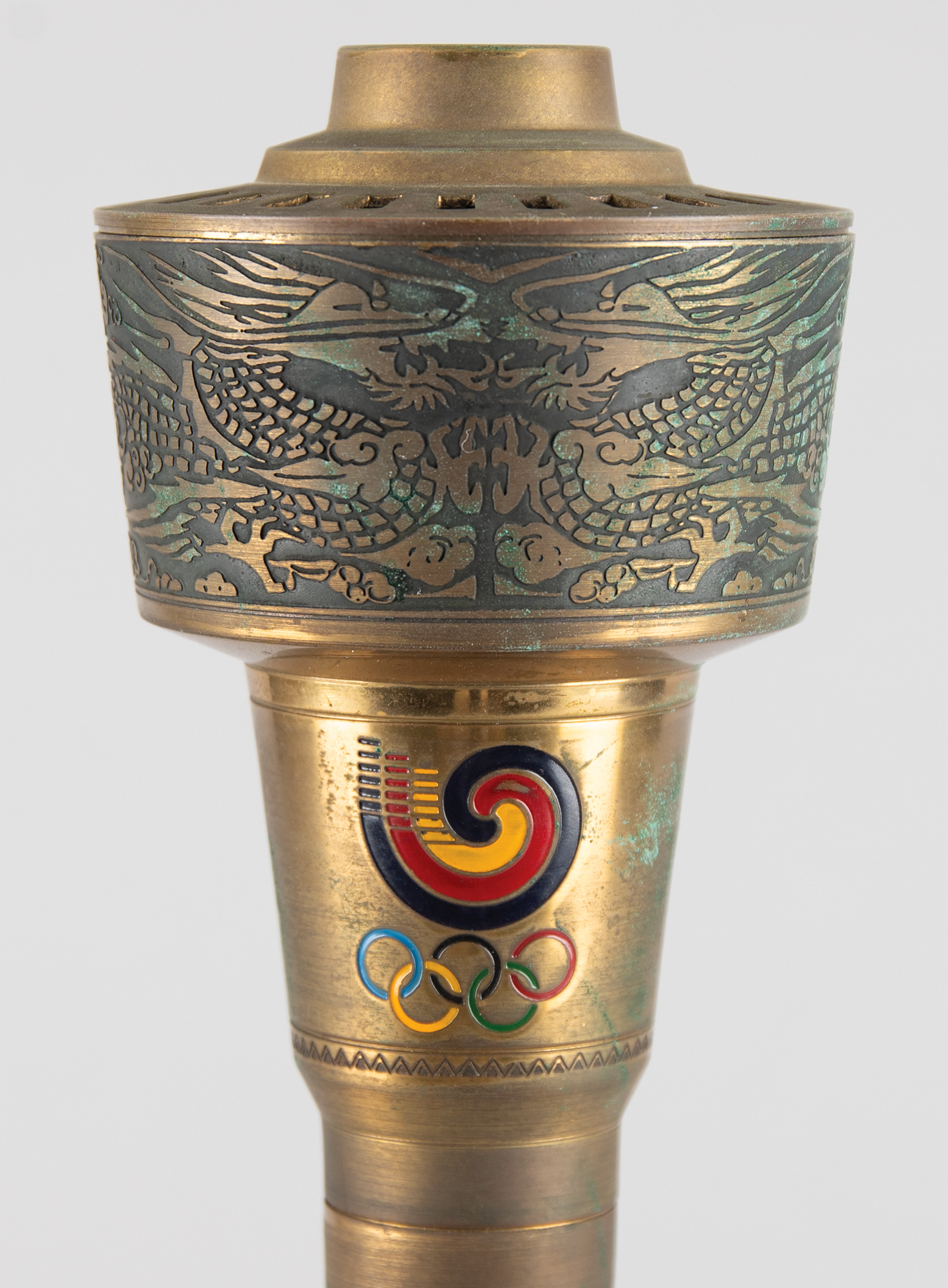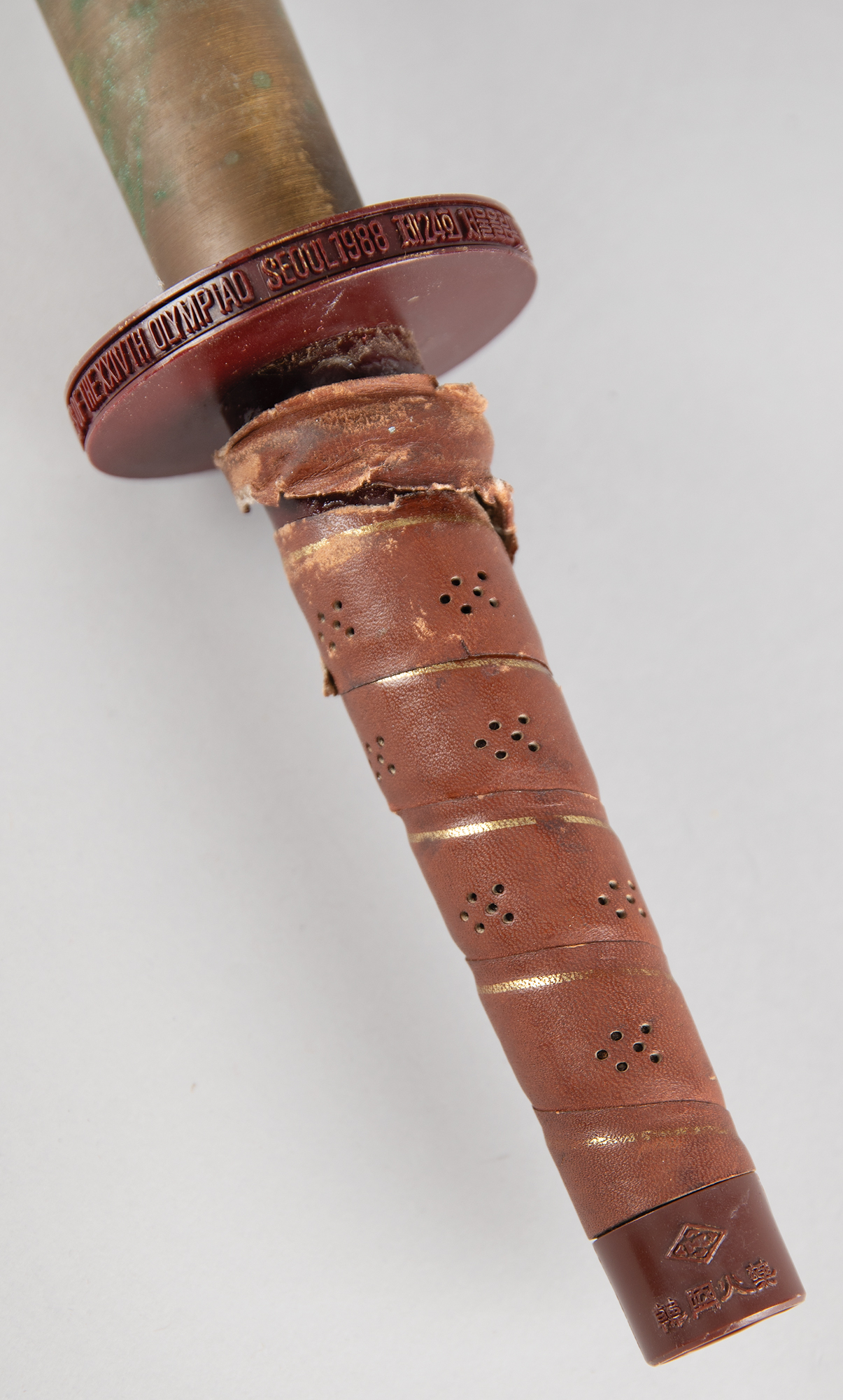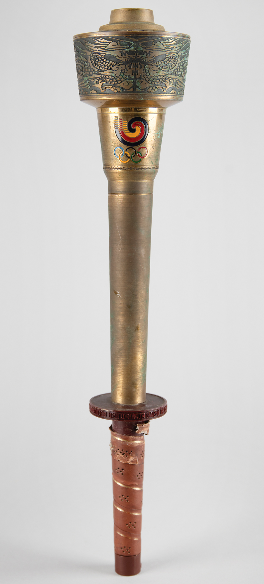 Beautifully designed official 1988 Seoul Olympics torch, constructed of metal, copper, leather, and plastic, measuring 20″ in length and 4″ at its widest point, designed by Lee Woo-Sung and manufactured by Korea Explosives Co. Ltd. The handle is wrapped in brown leather with a ring above, inscribed, "Games of the XXIVth Olympiad Seoul 1988," in English and Korean. The upper portion of the torch bears a colorful Olympic ring emblem and the top is engraved with an intricate dragon design symbolizing the harmony between East and West; based on the Chinese zodiac, the year 1988 was also the year of the dragon. The torch’s burner is absent, and the torch exhibits overall tarnishing and heavy wear to the upper part of the leather handle wrap. During the 22-day relay, the Olympic Flame traveled from the Greek capital of Athens to Korea's southernmost point, Jeju Island, before making its way north to Seoul in a 4,167 km relay.