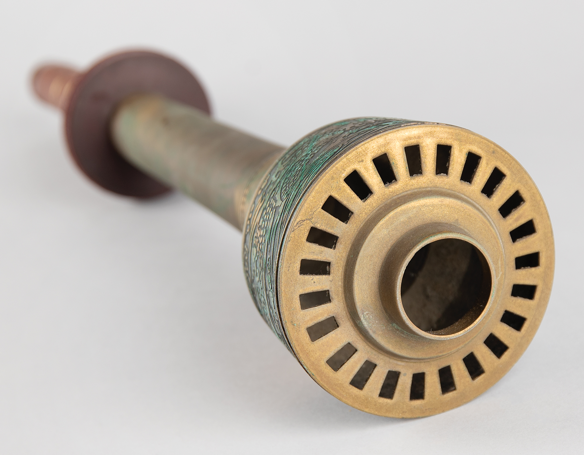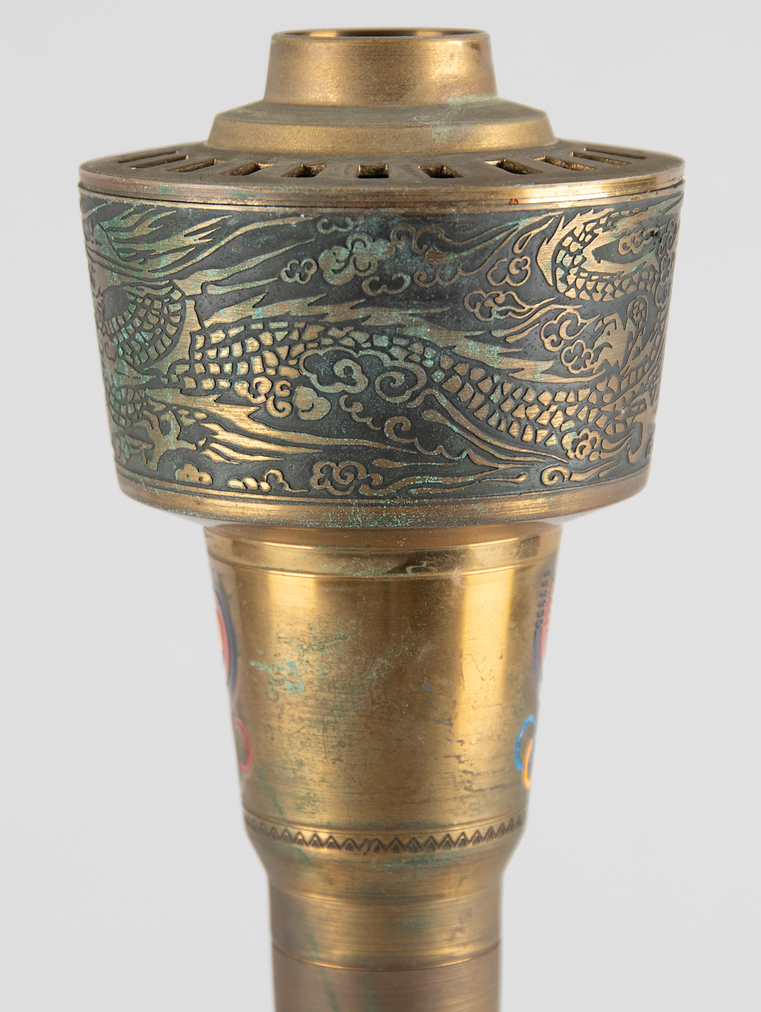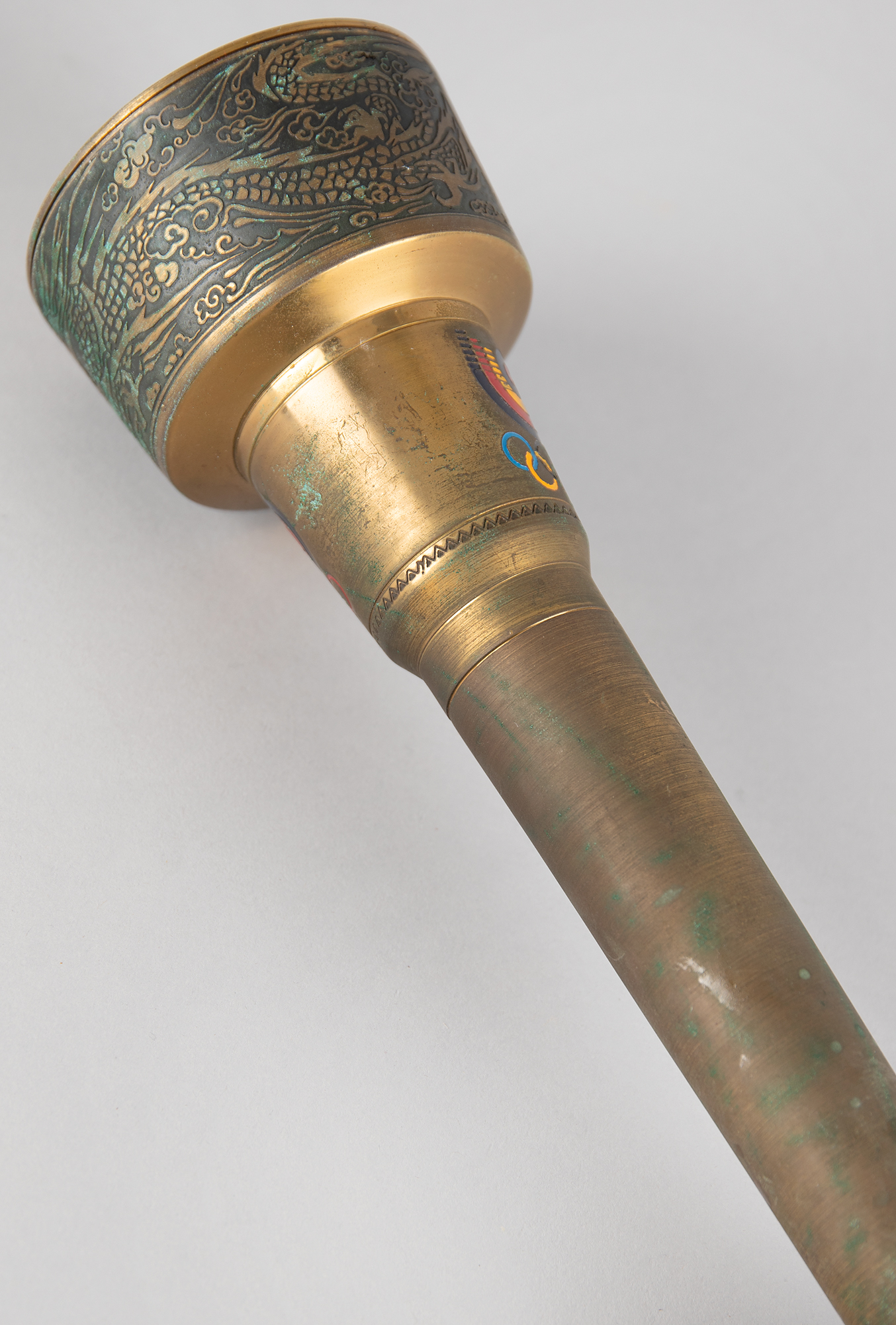Beautifully designed official 1988 Seoul Olympics torch, constructed of metal, copper, leather, and plastic, measuring 20″ in length and 4″ at its widest point, designed by Lee Woo-Sung and manufactured by Korea Explosives Co. Ltd. The handle is wrapped in brown leather with a ring above, inscribed, "Games of the XXIVth Olympiad Seoul 1988," in English and Korean. The upper portion of the torch bears a colorful Olympic ring emblem and the top is engraved with an intricate dragon design symbolizing the harmony between East and West; based on the Chinese zodiac, the year 1988 was also the year of the dragon. The torch’s burner is absent, and the torch exhibits overall tarnishing and heavy wear to the upper part of the leather handle wrap. During the 22-day relay, the Olympic Flame traveled from the Greek capital of Athens to Korea's southernmost point, Jeju Island, before making its way north to Seoul in a 4,167 km relay.