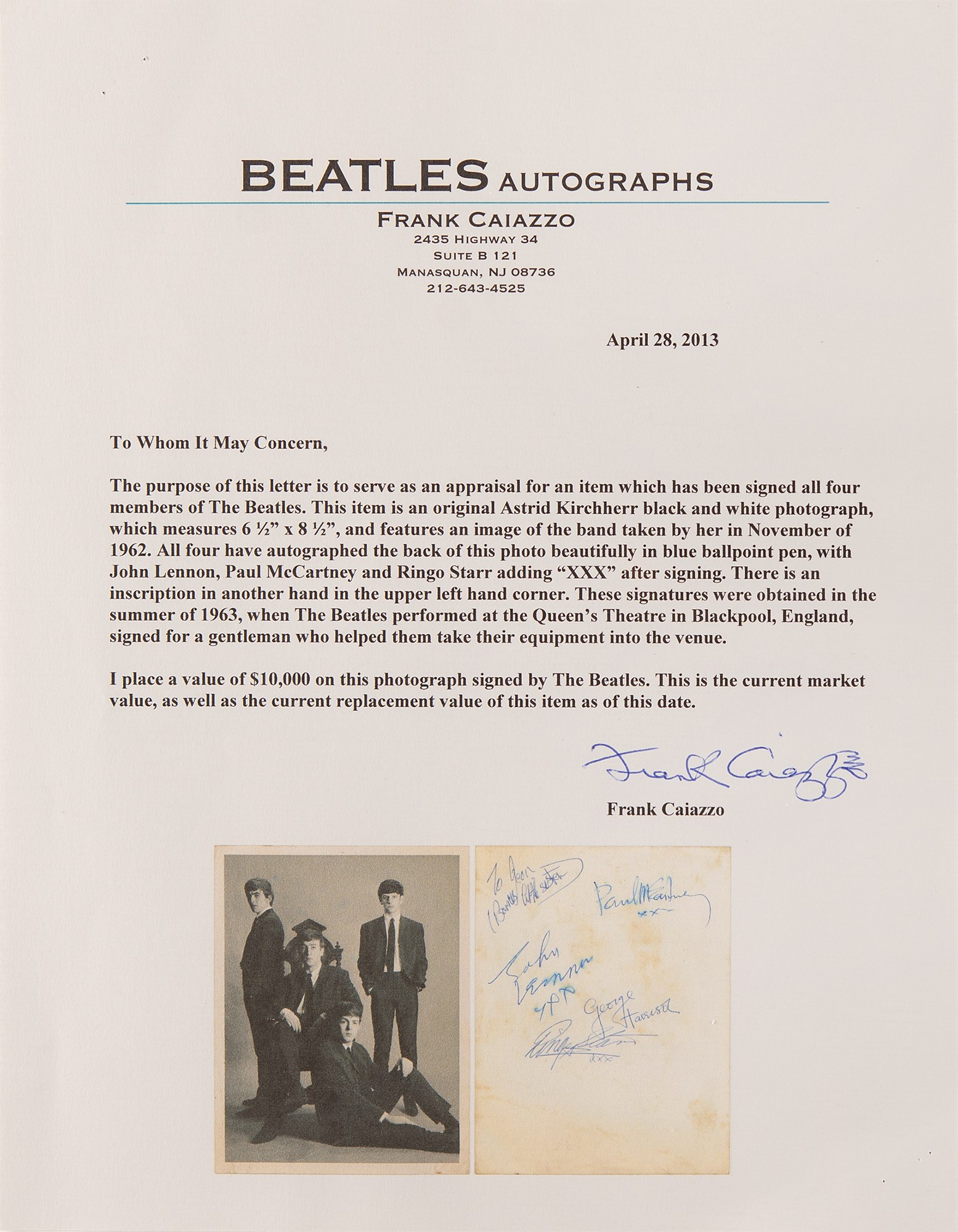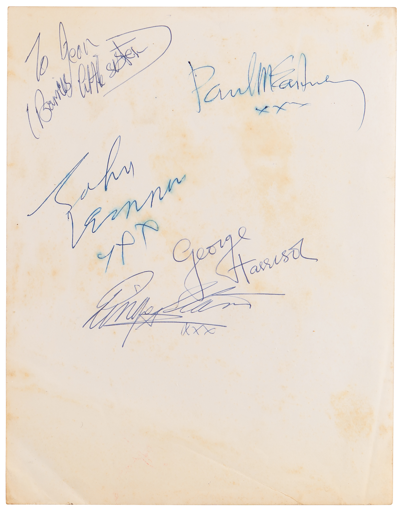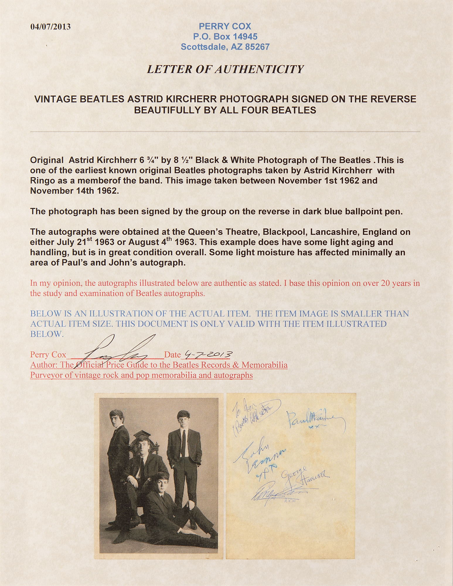 Exceptional, early original vintage glossy 6.5 x 8.5 photograph of the Beatles by Astrid Kircherr, taken in November 1962, signed on the reverse in blue ballpoint, "John Lennon, xxx," "Paul McCartney, xxx," "George Harrison," and "Ringo Starr, xxx," with an inscription in the corner penned in another hand. In very good to fine condition, with scattered creasing (heaviest to the bottom), and dampstaining to the signed side, slightly affecting Lennon's and McCartney's signatures. Accompanied by letters of authenticity from noted Beatles experts Frank Caiazzo and Perry Cox, who notes: "The autographs were obtained at the Queen's Theater, Blackpool, Lancashire, England on either July 21st 1963 or August 4th 1963."