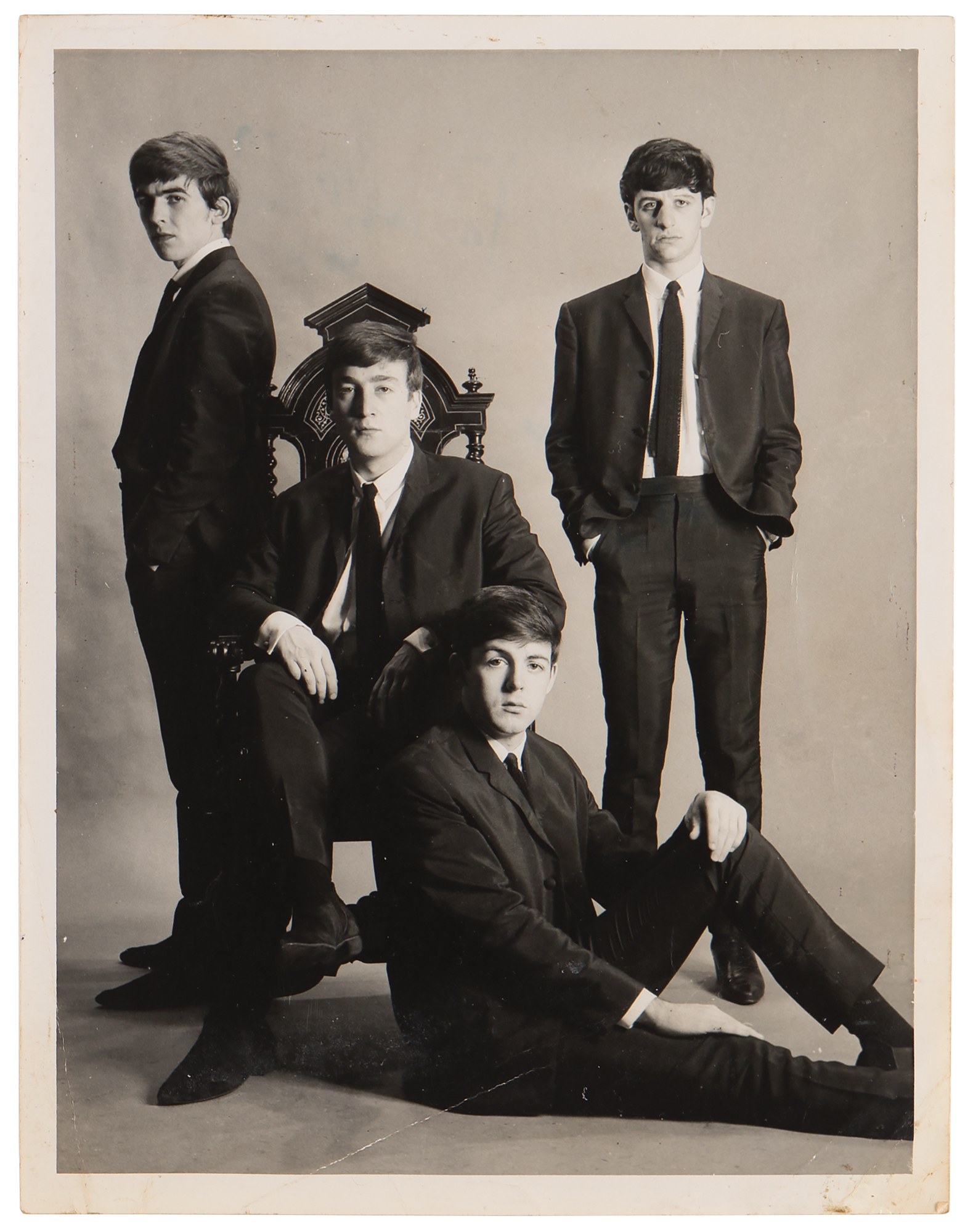 Taken during the ‘Chair Sessions’ in Astrid Kirchherr’s studio in Hamburg in early November 1962, this classic image shows the four members of the Beatles dressed in sharp suits: John takes a seat on an ornate, throne-like chair; Paul relaxes on the floor in front; George strikes a serious pose, his back turned to the group; and Ringo stands tall with his hands in his pockets. Kirchherr is credited with introducing the Beatles to their ‘mop top’ hairstyle, and Beatles historian Mark Lewishohn has described her influence on the band as 'immeasurable.'