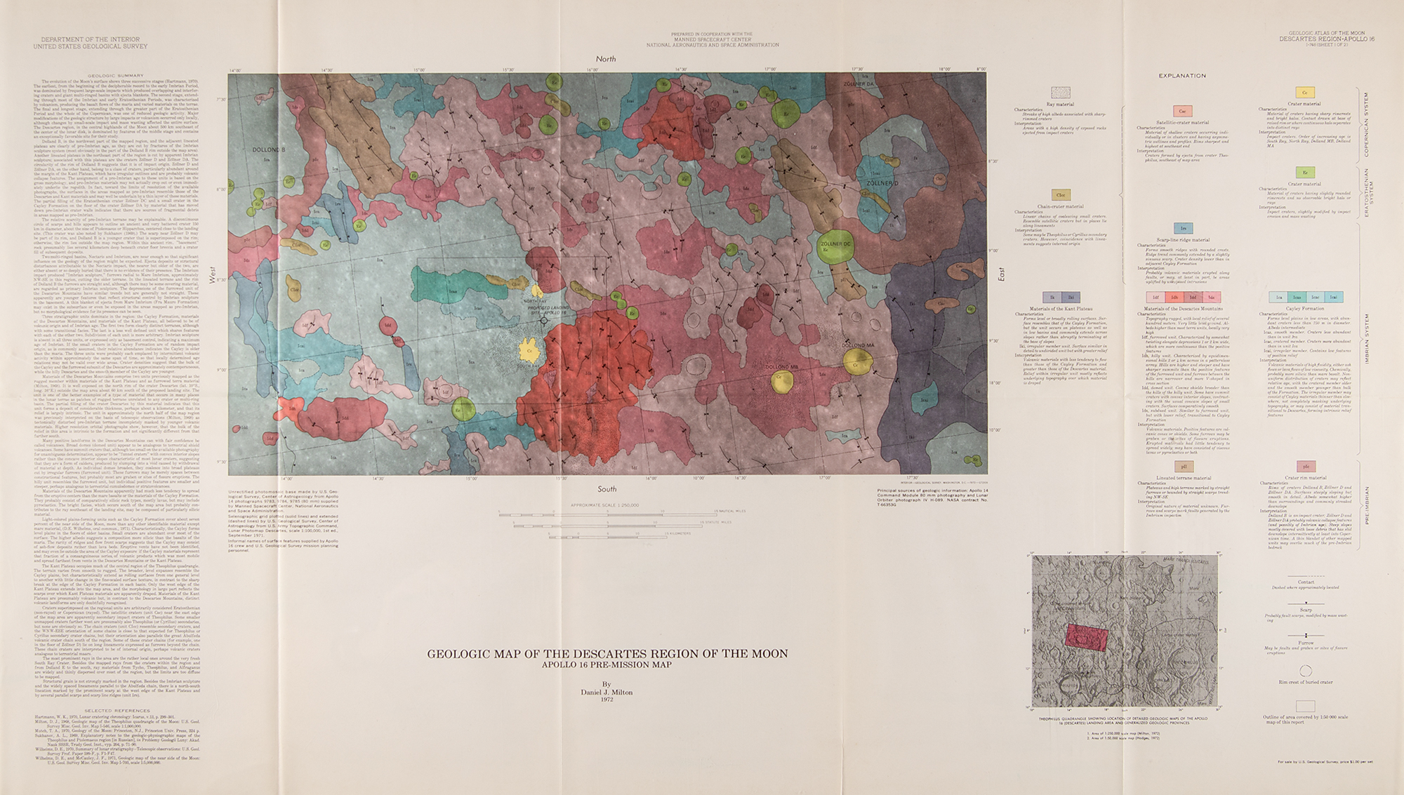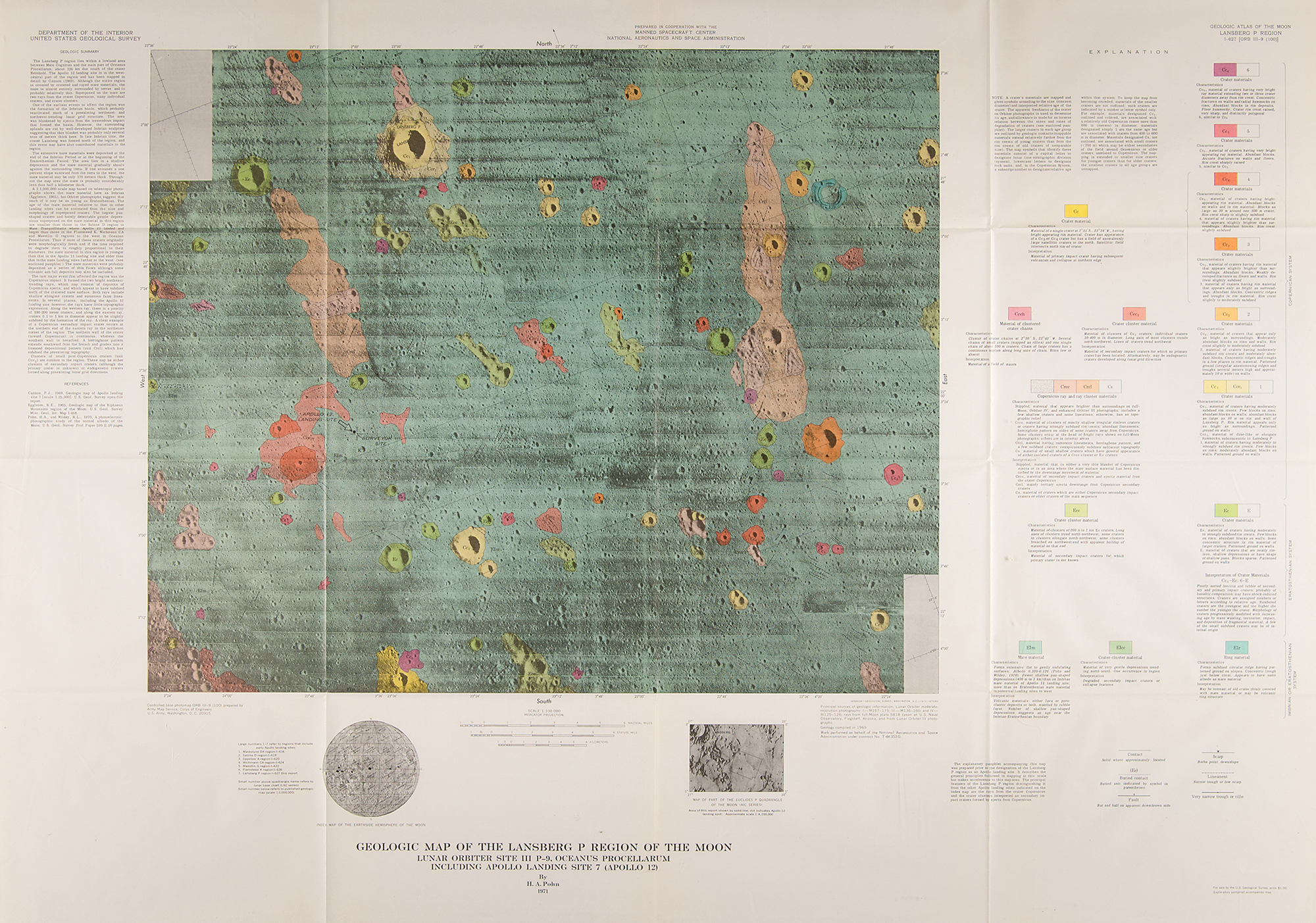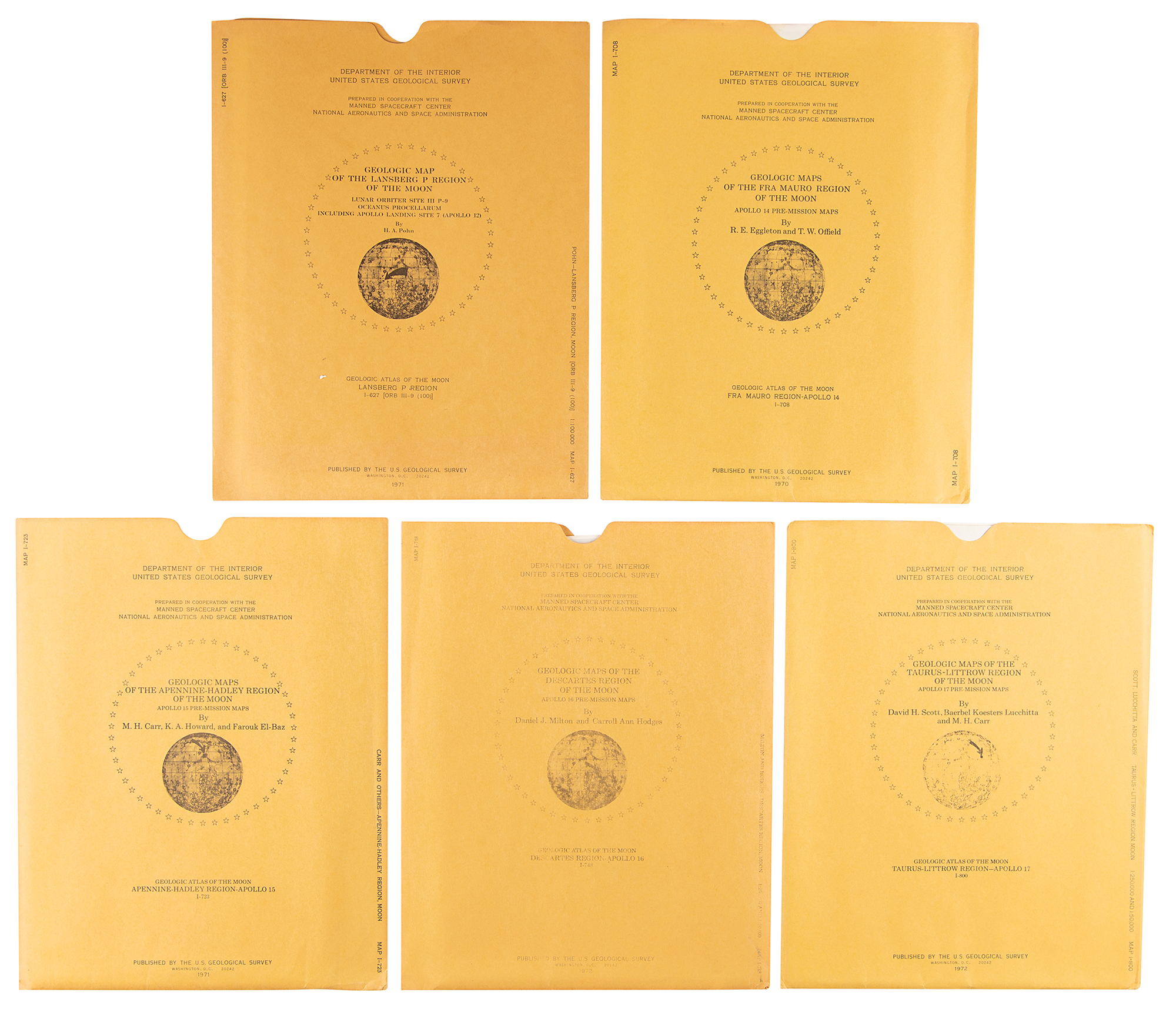Group of five geological maps of the moon focusing on Apollo landing regions, published by the U. S. Geological Survey between 1970 and 1972, and prepared in cooperation with NASA and the USAF Aeronautical Chart and Information Center, all folded and in their original sleeves. The collection includes: "Geologic Maps of the Fra Mauro Region of the Moon: Apollo 14 Pre-Mission Maps" (1970); "Geologic Map of the Lansberg P Region of the Moon: Lunar Orbiter Site III P-9, Oceanus Procellarum, Including Apollo Landing Site 7 (Apollo 12)" (1971); "Geologic Maps of the Apennine-Hadley Region of the Moon: Apollo 15 Pre-Mission Maps" (1971); "Geologic Maps of the Descartes Region of the Moon: Apollo 16 Pre-Mission Maps" (1972); and "Geologic Maps of the Taurus-Littrow Region of the Moon: Apollo 17 Pre-Mission Maps" (1972). In overall fine condition.