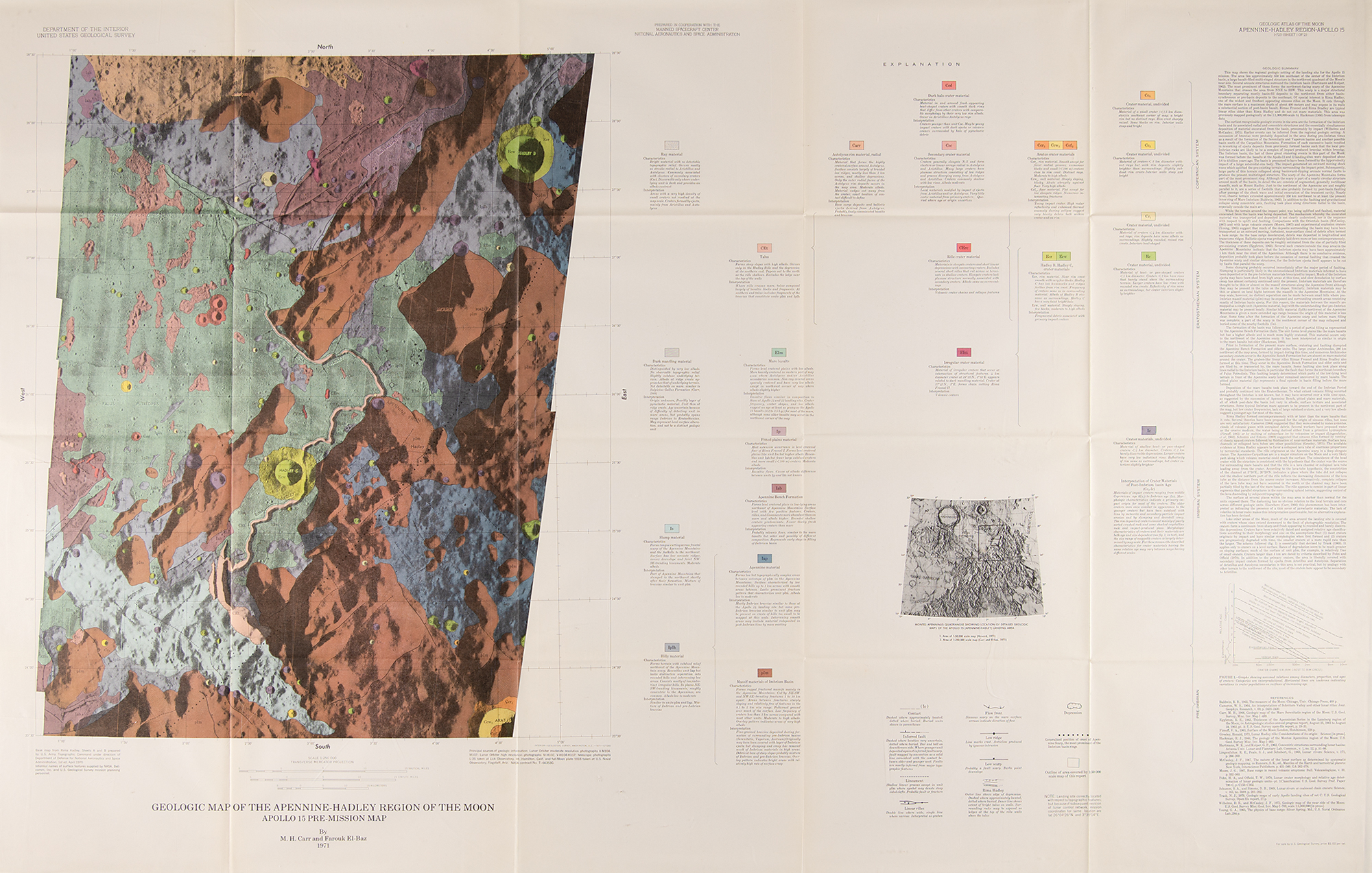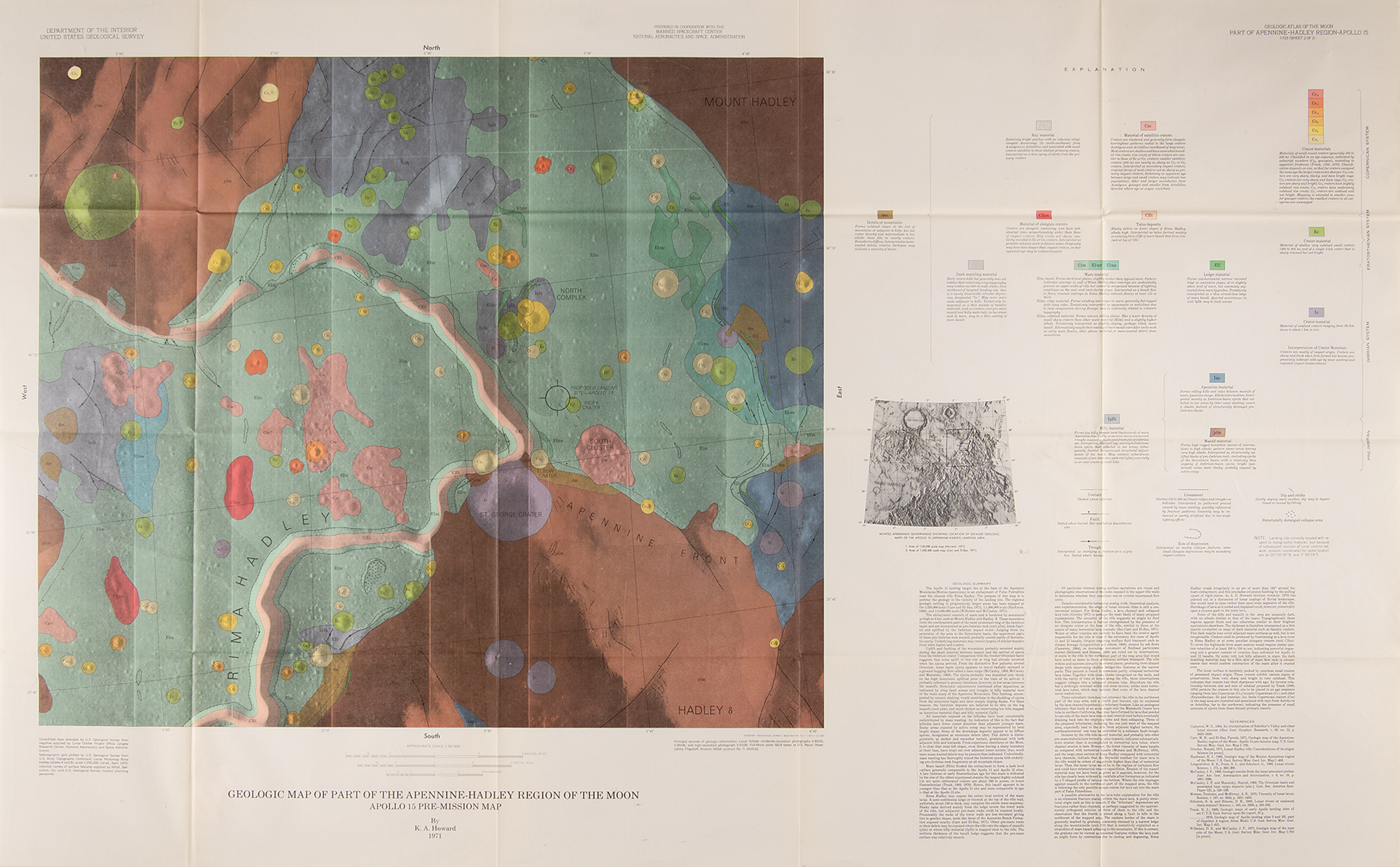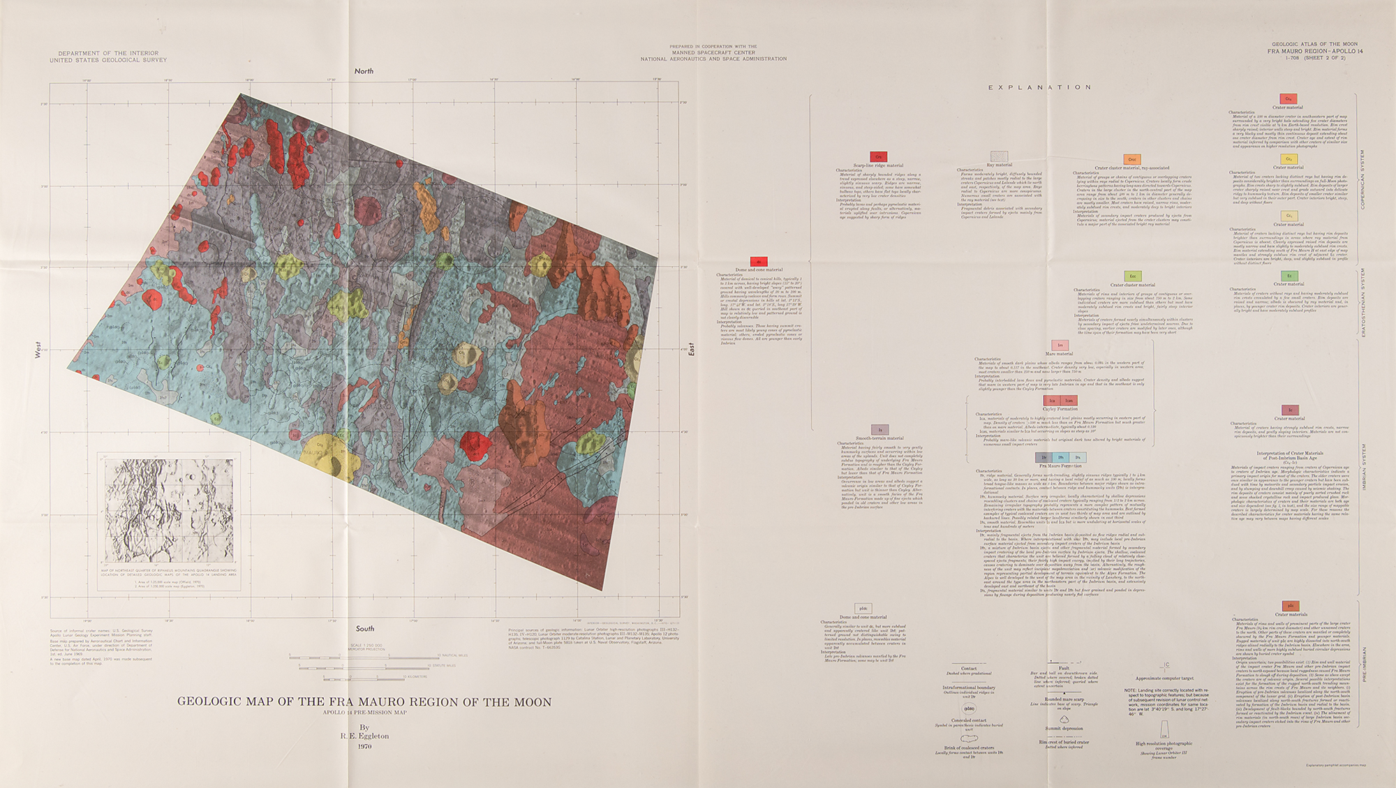 Group of five geological maps of the moon focusing on Apollo landing regions, published by the U. S. Geological Survey between 1970 and 1972, and prepared in cooperation with NASA and the USAF Aeronautical Chart and Information Center, all folded and in their original sleeves. The collection includes: "Geologic Maps of the Fra Mauro Region of the Moon: Apollo 14 Pre-Mission Maps" (1970); "Geologic Map of the Lansberg P Region of the Moon: Lunar Orbiter Site III P-9, Oceanus Procellarum, Including Apollo Landing Site 7 (Apollo 12)" (1971); "Geologic Maps of the Apennine-Hadley Region of the Moon: Apollo 15 Pre-Mission Maps" (1971); "Geologic Maps of the Descartes Region of the Moon: Apollo 16 Pre-Mission Maps" (1972); and "Geologic Maps of the Taurus-Littrow Region of the Moon: Apollo 17 Pre-Mission Maps" (1972). In overall fine condition.