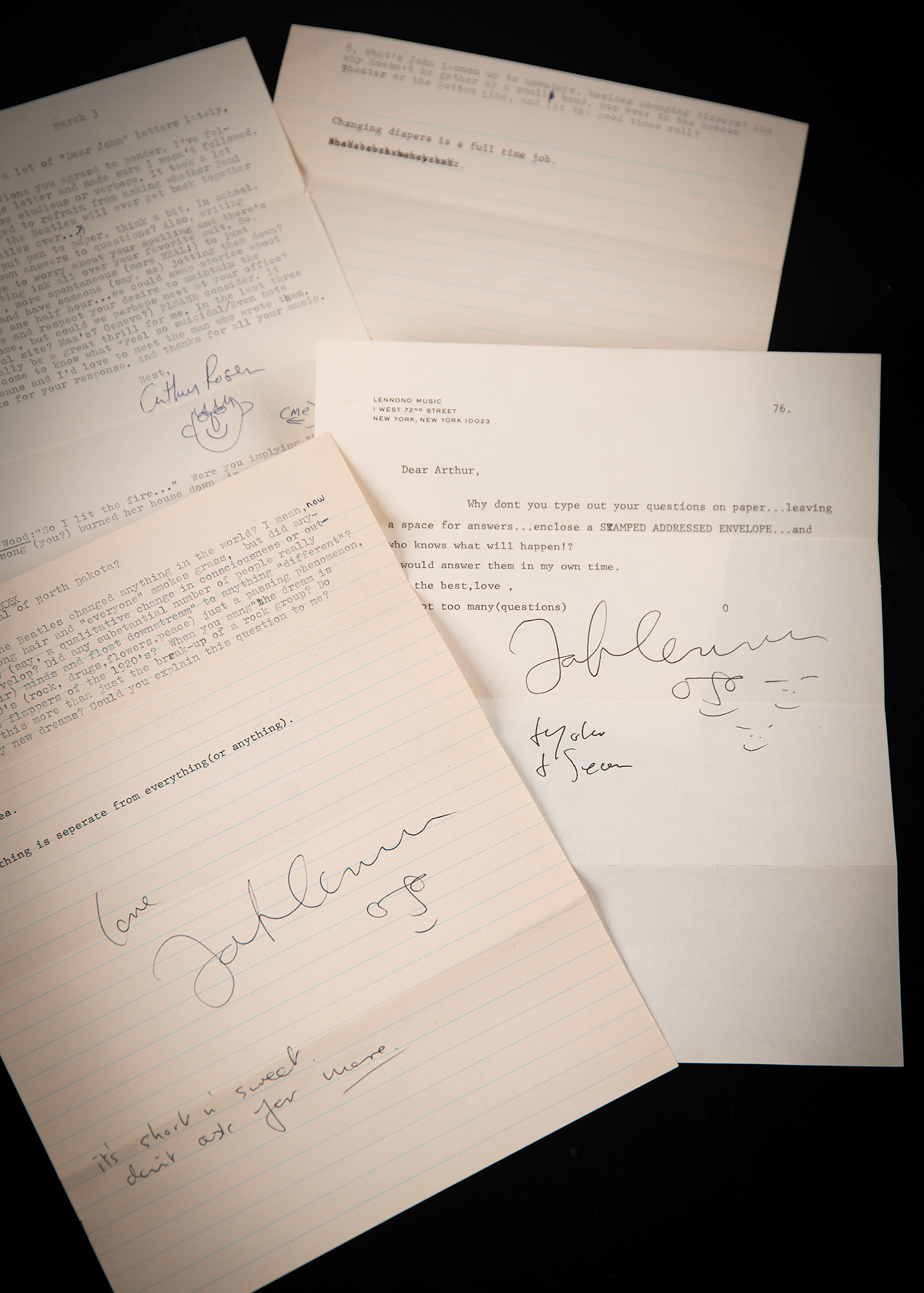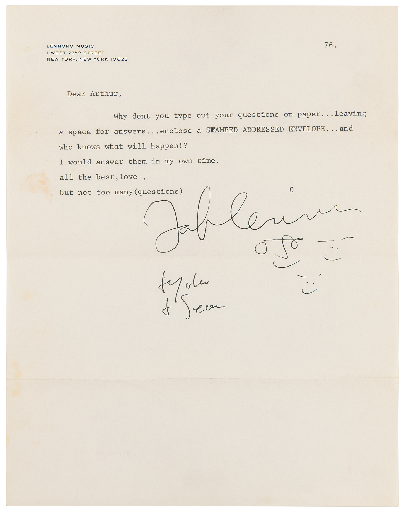 Fascinating TLS and signed typed questionnaire from John Lennon directed to Arthur Rosen, a patient at the New York Psychiatric Institute, in March of 1976. The TLS, one page, 8.5 x 11, Lenono Music letterhead, postmarked March 2, 1976, reads, in full (spelling and grammar retained): “Why dont you type out your questions on paper…leaving a space for answers…enclose a STAMPED ADDRESSED ENVELOPE…and who knows what will happen!? I would answer them in my own time. all the best, love, but not too many (questions).” Signed prominently at the conclusion in black ink by John Lennon, who signs on behalf of his wife and baby son, “+ Yoko” and “+ Seaman,” and adds small face doodles of the entire family.