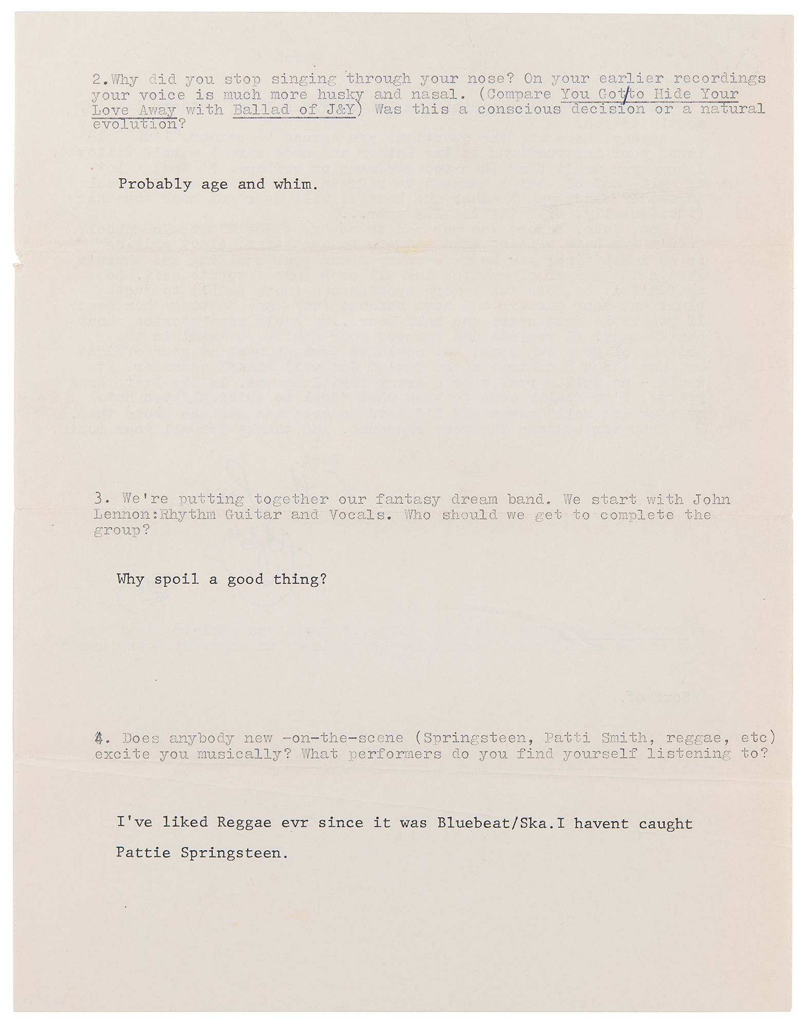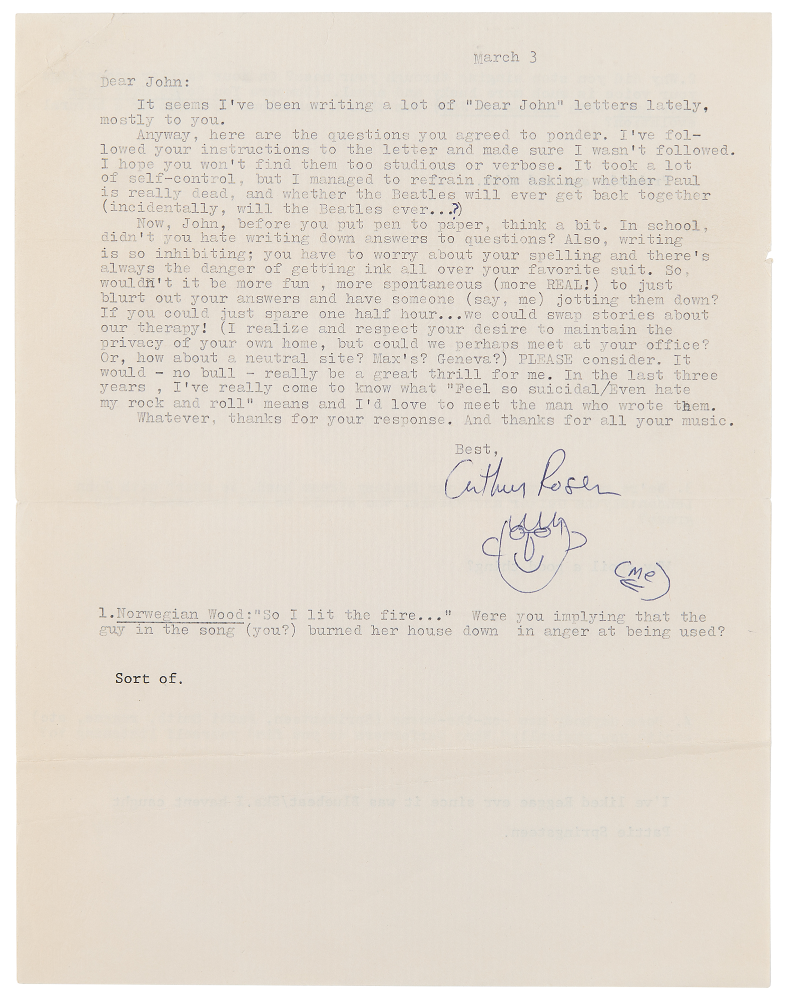 The text of Rosen’s letter, in full: “It seems I've been writing a lot of ‘Dear John’ letters lately, mostly to you. Anyway, here are the questions you agreed to ponder. I've followed your instructions to the letter and made sure I wasn't followed. I hope you won't find them too studious or verbose. It took a lot of self-control, but I managed to refrain from asking whether Paul is really dead, and whether the Beatles will ever get back together (incidentally, will the Beatles ever…?) Now, John, before you put pen to paper, think a bit. In school, didn't you hate writing down answers to questions? Also, writing is so inhibiting; you have to worry about your spelling and there's always the danger of getting ink over your favorite suit. So, wouldn't it be more fun, more spontaneous (more REAL!) to just blurt out your answers and have someone (say, me) jotting them down? If you could just spare one half hour…we could swap stories about our therapy! (I realize and respect your desire to maintain the privacy of your own home, but could we perhaps meet at your office? Or, how about a neutral site? Max's? Geneva?) PLEASE consider. It would – no bull – really be a great thrill for me. In the last three years, I've really come to know what ‘Feel so suicidal/Even hate my rock and roll’ means and I'd love to meet the man who wrote them. Whatever, thanks for your response. And thanks for all your music.” In overall fine condition. Accompanied by both original mailing envelopes.