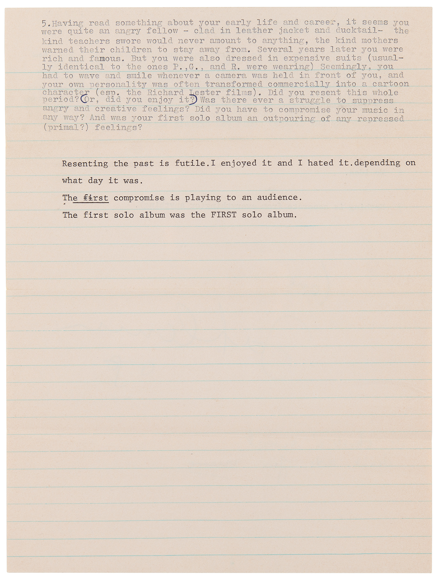 “5. Having read something about your early life and career, it seems you were quite an angry fellow – clad in leather jacket and ducktail – the kind teachers swore would never amount to anything, the kind mothers warned their children to stay away from. Several years later you were rich and famous. But you were also dressed in expensive suits (usually identical to the ones P., G., and R. were wearing) Seemingly, you had to wave and smile whenever a camera was held in front of you, and your own personality was often transformed commercially into a cartoon character (esp. the Richard Lester films). Did you resent this whole period? Or, did you enjoy it? Was there ever a struggle to suppress angry and creative feelings? Did you have to compromise your music in any way? And was your first solo album an outpouring of any repressed (primal?) feelings?”