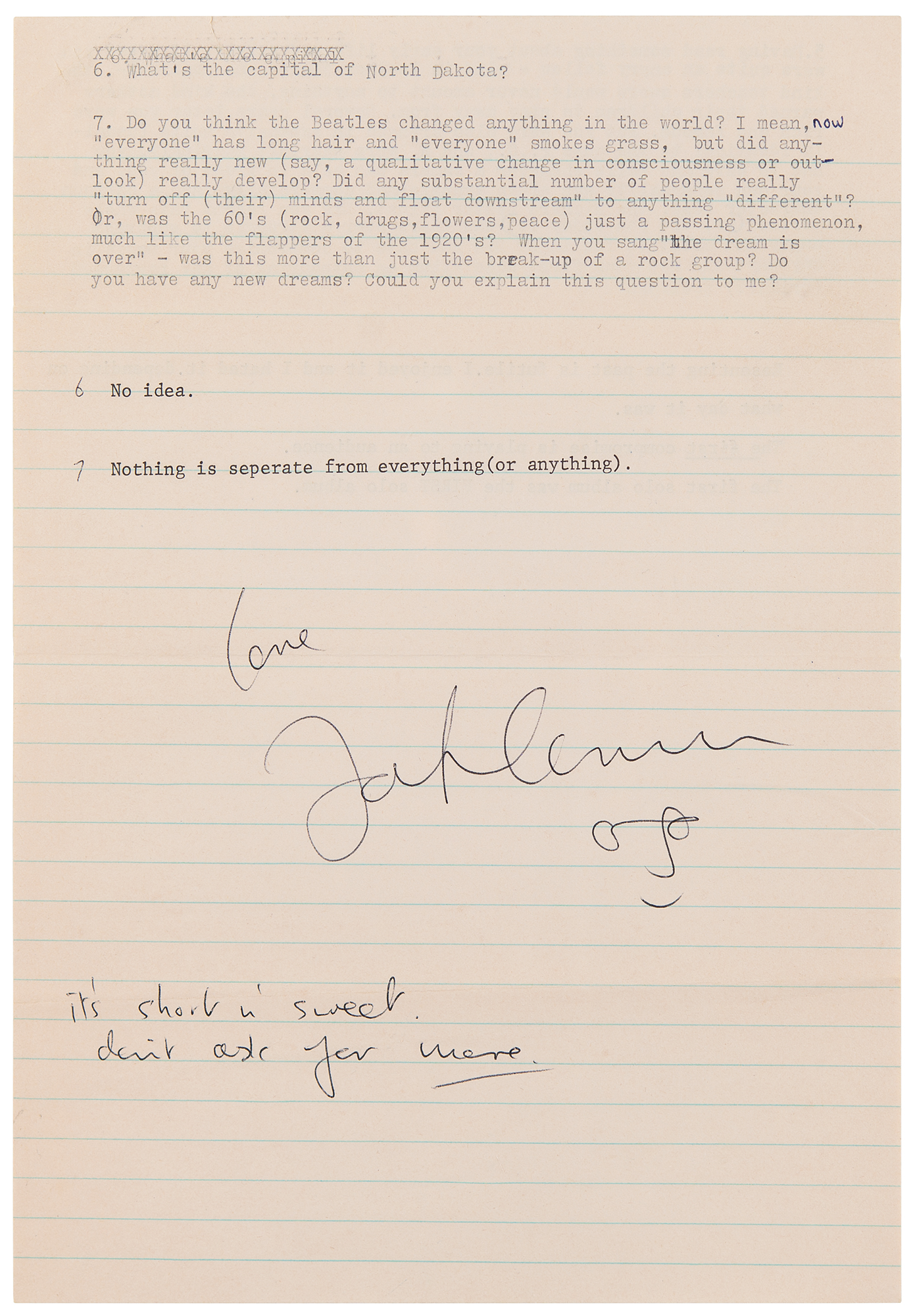 Rosen responded with a typed letter postmarked on March 30, 1976, containing a total of eight questions spaced out across the front and back of three 8.5 x 11 sheets, with Lennon signing his name after the seventh in black ballpoint, “Love, John Lennon,” and adding a small sketch of his spectacled face and a handwritten message: “It’s short n’ sweet, don’t ask for more.”