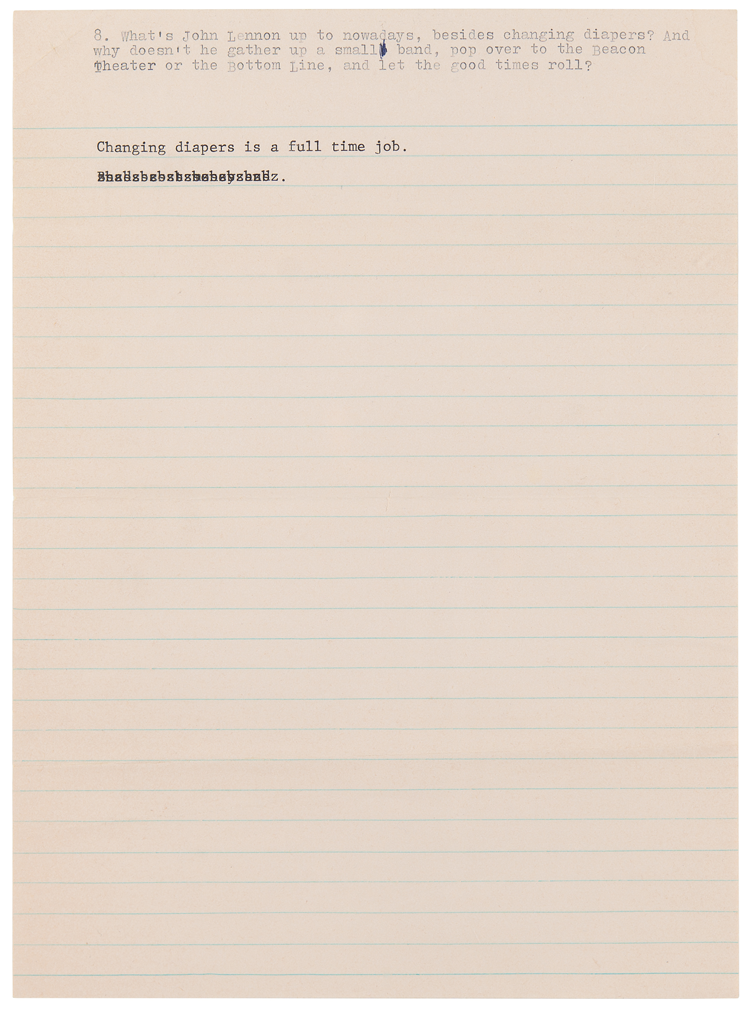 “8. What's John Lennon up to nowadays, besides changing diapers? And why doesn't he gather up a small band, pop over to the Beacon Theater or the Bottom Line, and let the good times roll?