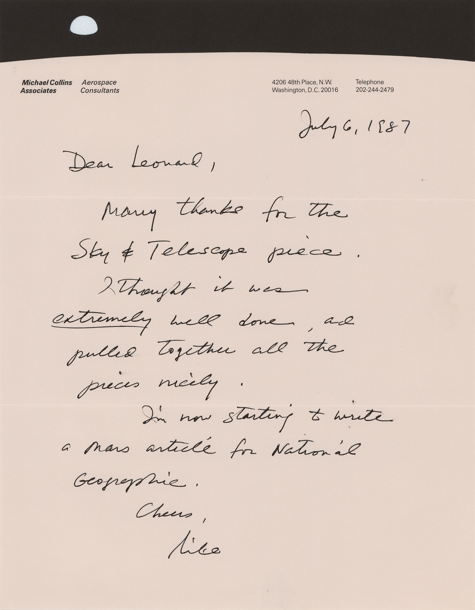 ALS signed “Mike,” one page, 8.5 x 11, personal 'Michael Collins Associates' letterhead, July 6, 1987. Handwritten letter to journalist Leonard David, in full: “Many thanks for the Sky & Telescope piece. I thought it was extremely well done, and pulled together all the pieces nicely. I’m now starting to write a Mars article for National Geographic.” In very fine condition.