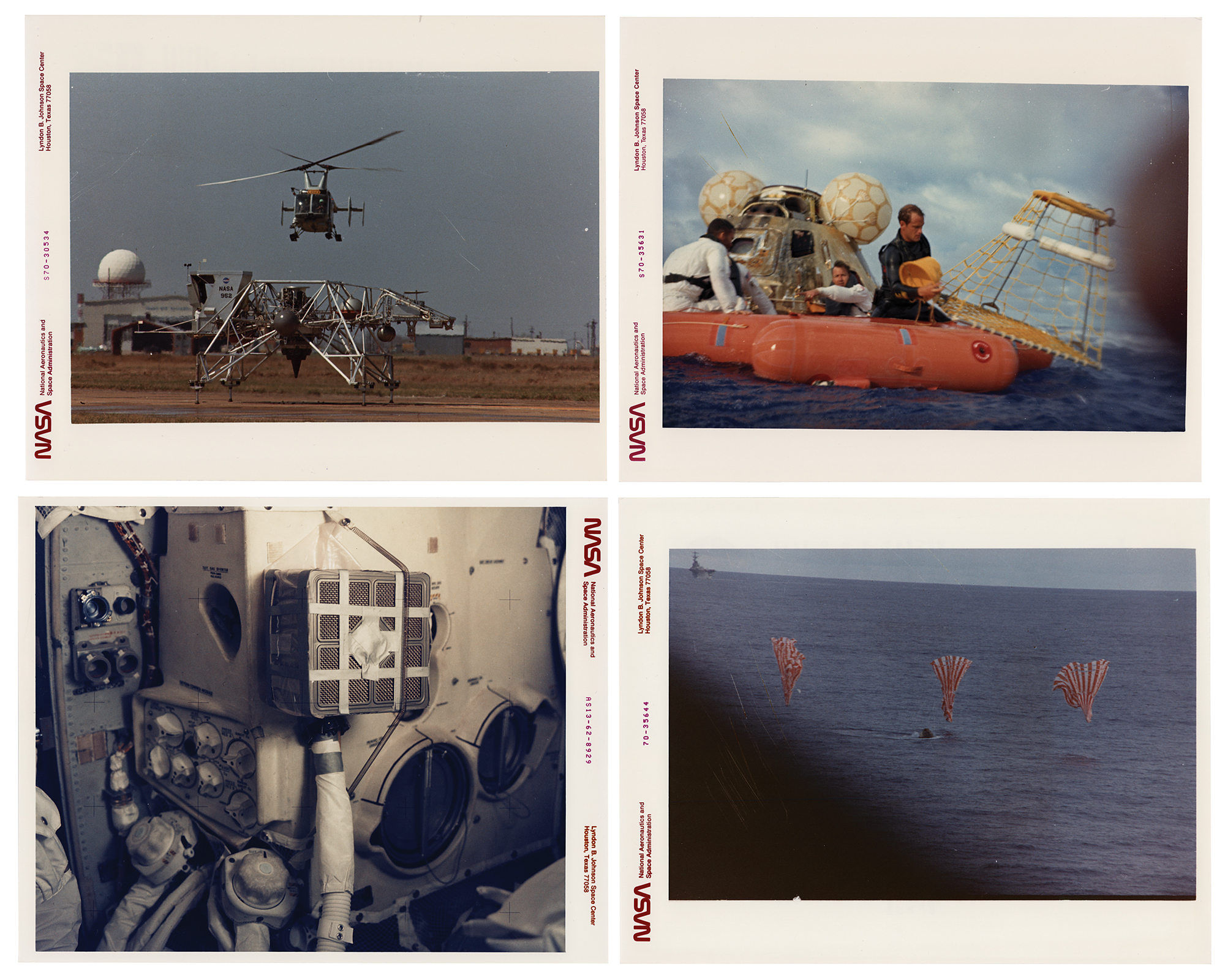 Collection of 12 official color red-numbered NASA photographs for the Apollo 13 mission, glossy and semi-glossy, 8 x 10 and 10 x 8, two of which are earlier variants with “A Kodak Paper” watermarks and purple NASA caption text on the reverse, and the remaining 10 are modern NASA ‘worm’ logo examples, with the reverse of each bearing variations of black and purple NASA caption text and “Kodak Professional” and “This Paper Manufactured by Kodak” watermarks. The earlier photos: (S-70-34850) Jack Swigert being fitted before launch and (S-70-35140) Ken Mattingly reading a flight plan in mission control. The modern photos: (AS13-62-8929) the essential ‘mailbox’ LiOH canister adapter; (70-24012) LMP Fred Haise suited up during lunar surface training; (70-35644) Apollo 13 splashdown; (STS13-60-8703) near full moon taken on the homebound journey of Apollo 13; (S70-20253) Lovell and Haise in Hawaii during a lunar traverse simulation; (S70-24010) James Lovell and Haise before water egress training; (S70-30534) the Lunar Landing Training Vehicle being piloted by Lovell at the Ellington Air Force Base; (S70-34851) Haise talking with a space suit technician; (S70-35631) the crew in rafts during South Pacific recovery operations; and (S70-35649) helicopter recovery after splashdown. In overall very fine condition.