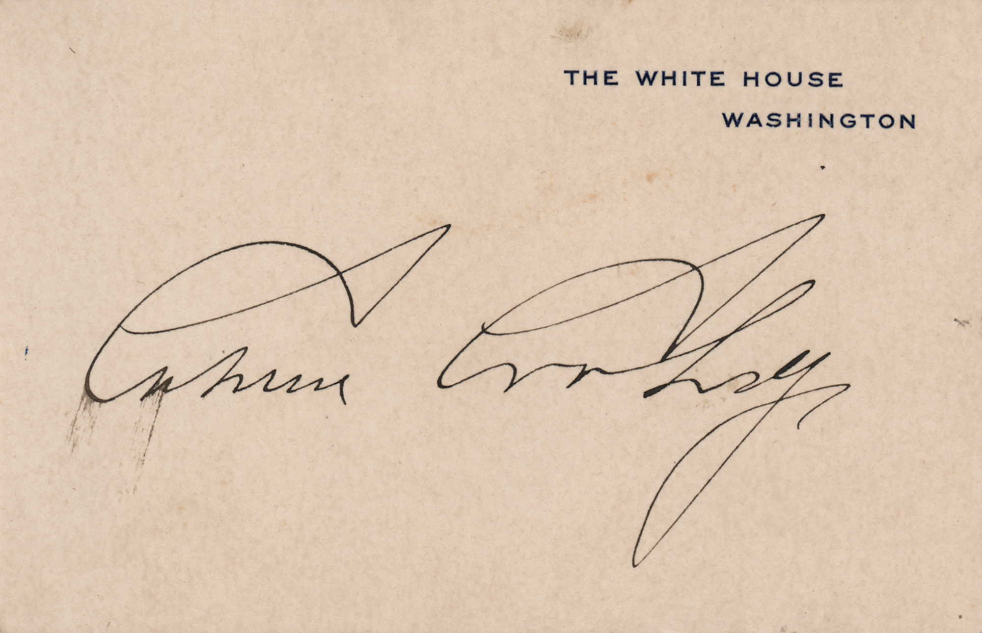 White House card, 4.25 x 2.75, signed neatly in ink by President Calvin Coolidge. In fine condition, with a trivial brush to the start of the signature.