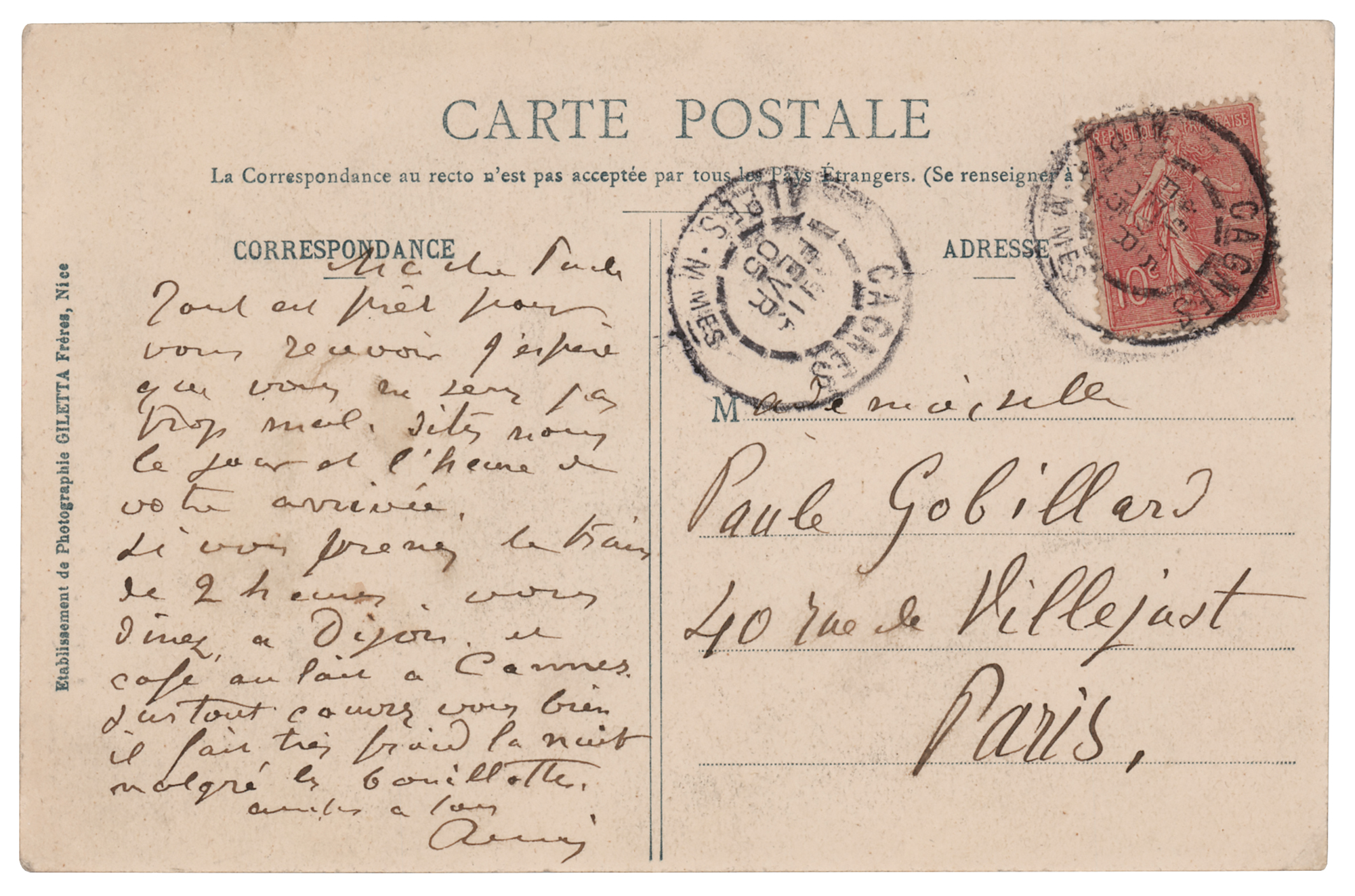 ALS in French, signed “Renoir,” penned on the reverse of a 5.5 x 3.5 postcard bearing a photo of ‘An Arab Street’ in Cagnes, France, postmarked from Cagnes, on February 11, 1905. Handwritten letter to French artist and Post-Impressionist painter Paule Gobillard, in full (translated): “We are ready for you here. I hope you will be comfortable with us. Please, could you tell us the day and time of your arrival. If you take the 2 o'clock train, you can dine in Dijon, and coffee with milk in Cannes. Above all, dress warmly. It is very cold at night, despite the hot water bottles.” In fine condition.