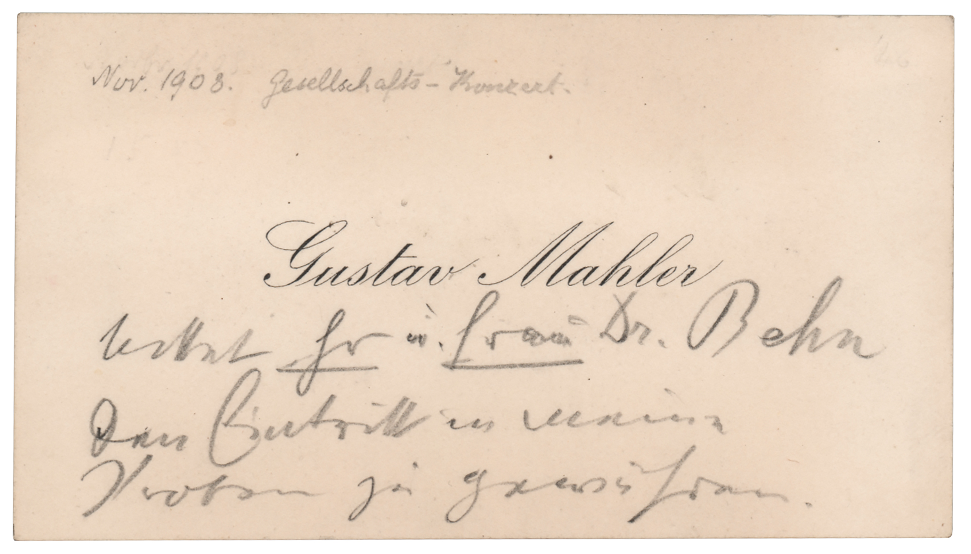 Austrian composer (1860–1911) whose epic symphonies redefined the genre and assured him a place among the most important and influential composers of the late 19th and early 20th centuries. Scarce unsigned handwritten note in pencil in German by Gustav Mahler the front of one of his personal 4 x 2.25 calling cards, elegantly imprinted with his name: "Gustav Mahler." A collector's notation above dates the piece to 1903. In fine condition.