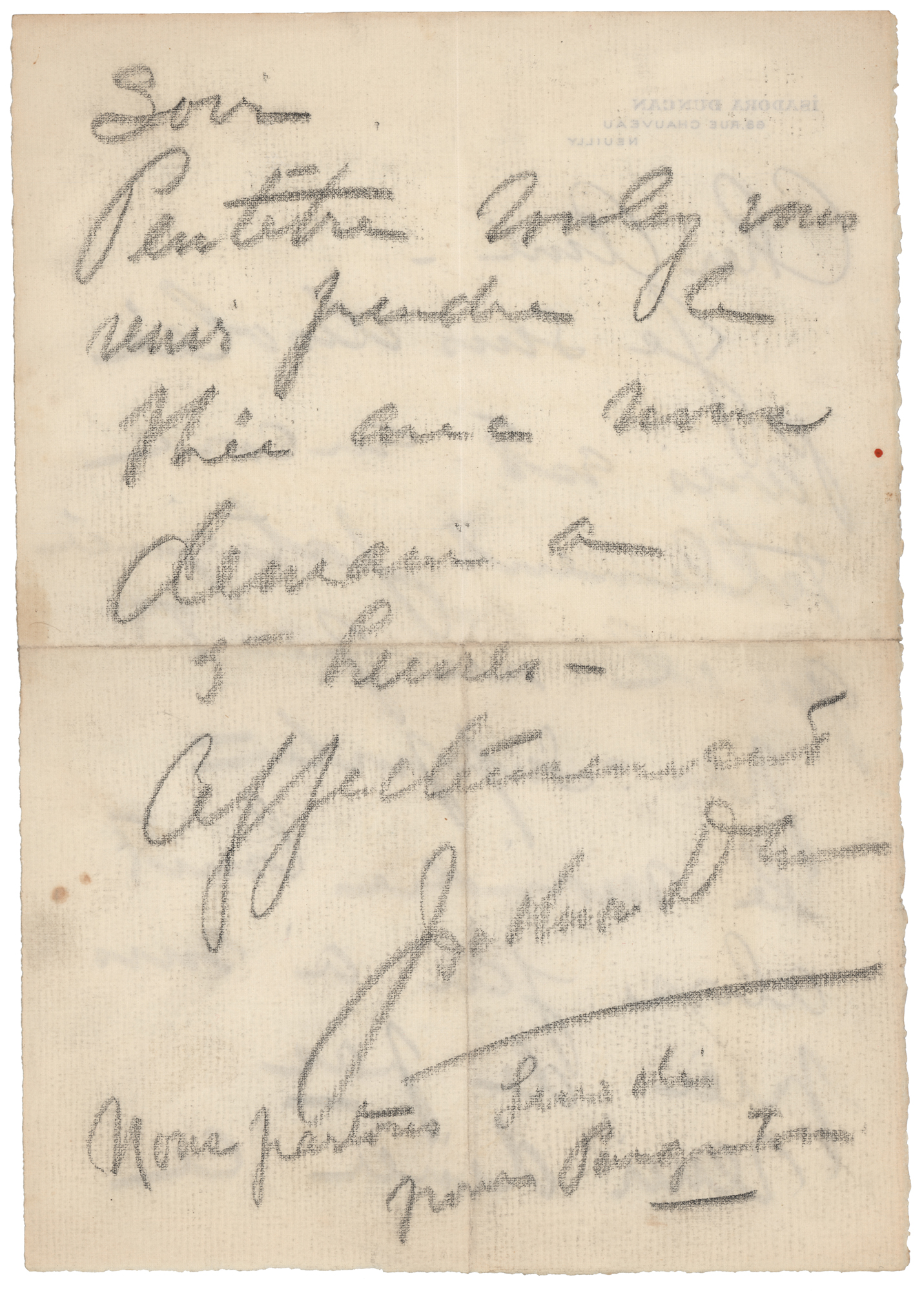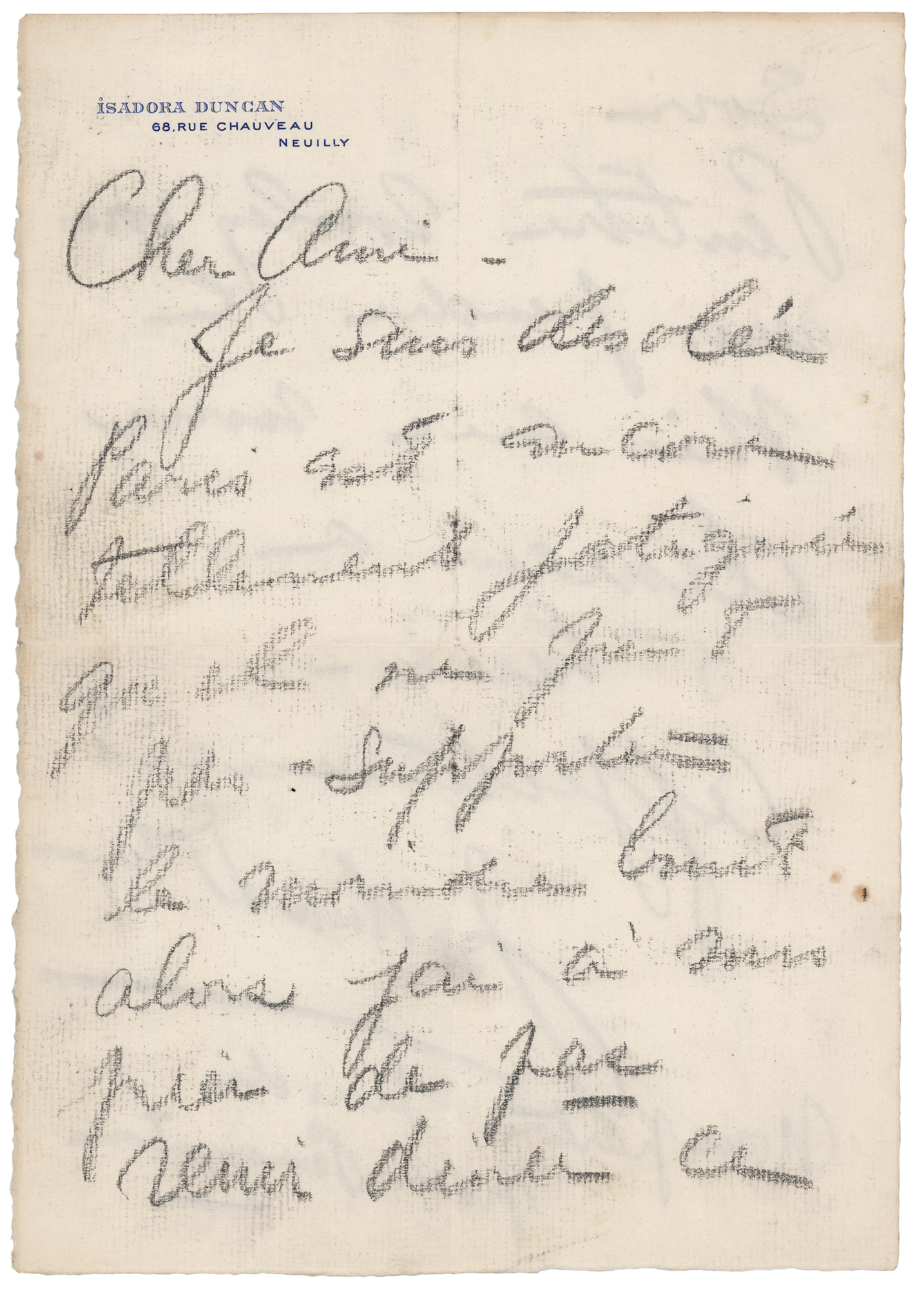 Pioneer of modern dance (1877–1927) killed in a grisly accident when her scarf became entangled in the wheels and axle of the car in which she was riding. ALS in French, one page both sides, 7.25 x 10.25, personal letterhead, no date. Untranslated handwritten letter by Isadora Duncan, apologizing because Paris tired her out; she reschedules dinner plans for the next day at 5. In fine condition.
