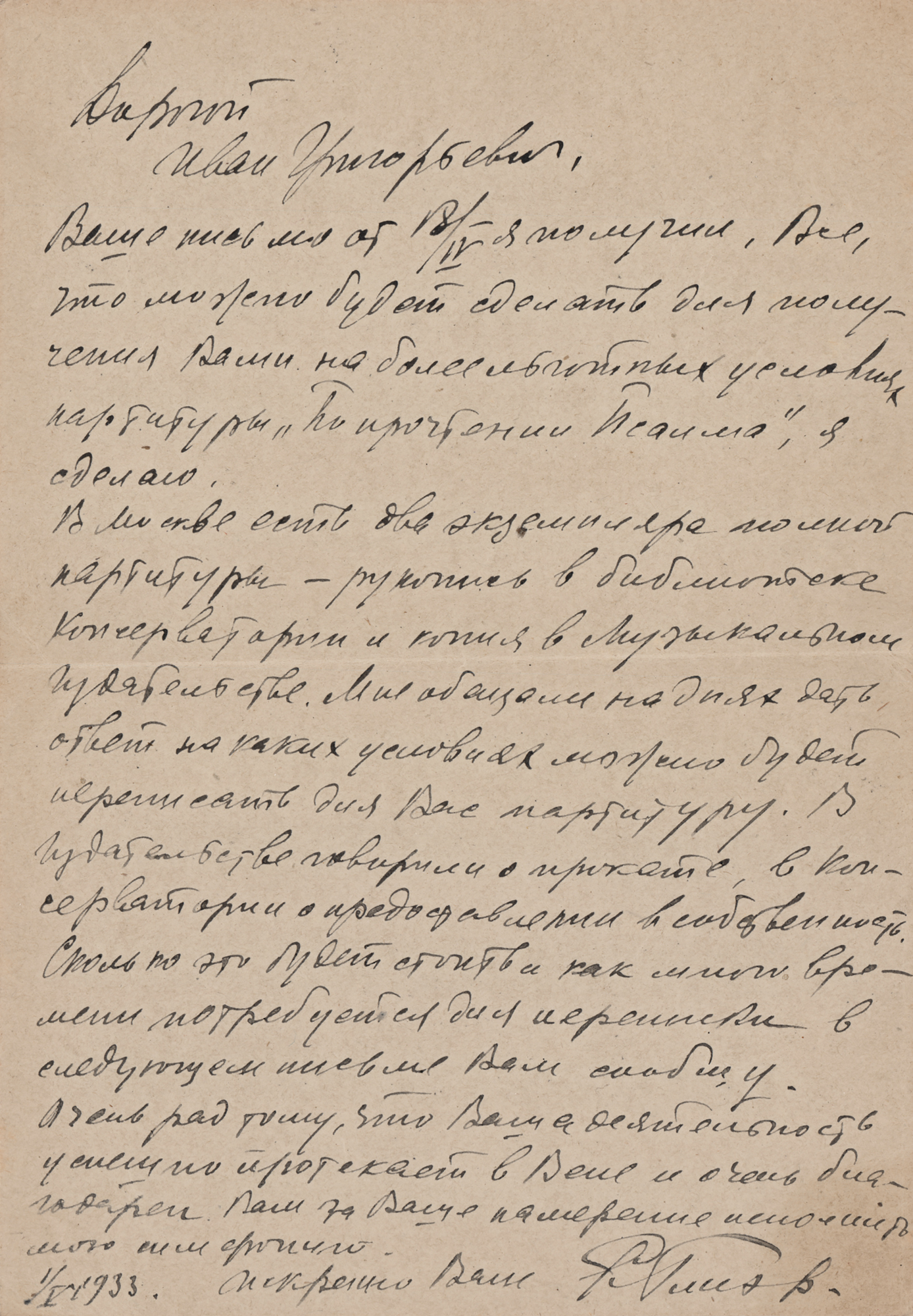 Russian composer (1875-1956) who concentrated primarily on monumental operas, ballets, and cantatas. Scarce ALS in Russian, signed “R. Gliere,” one page, 5.75 x 8.25, May 1, 1933. Handwritten letter to Ivan Grigoryevich, in part (translated): "I will do everything in my power to see to it that you receive the score for 'After Reading a Psalm' on favorable terms. There are two copies of the full score in Moscow: the manuscript in the Conservatory library and a copy in the Music Publishing House. The other day they promised to tell me the conditions necessary for having the score copied for you. At the Publishing House they spoke of rental fees, at the Conservatory of rights of ownership. How much it will cost and how much time the copying will take I will let you know in my next letter. I am very glad you are doing so well in Vienna and very grateful to you for thinking of performing my symphony." In fine condition.