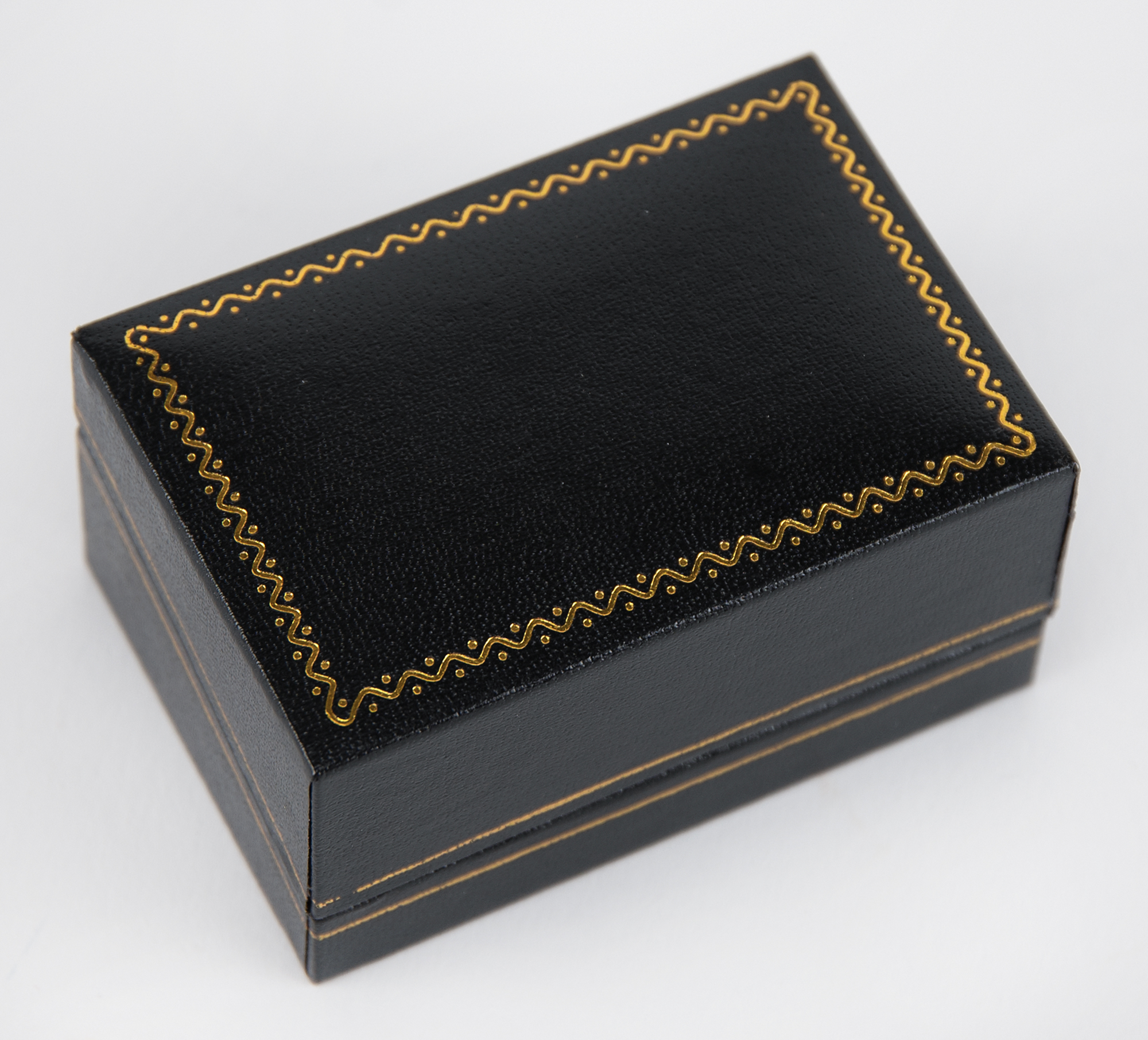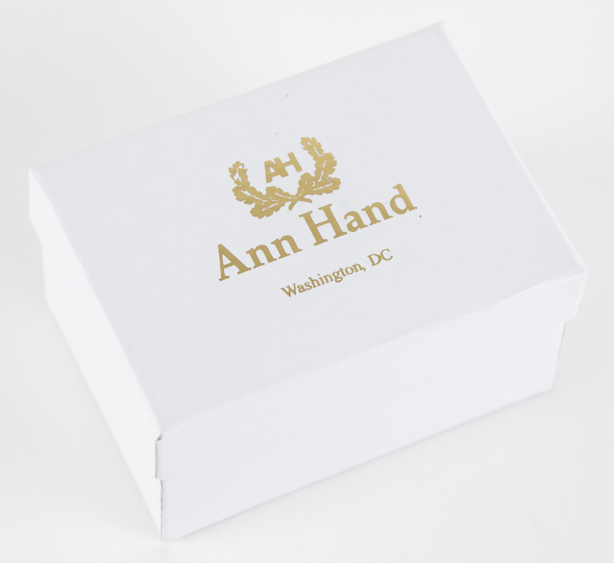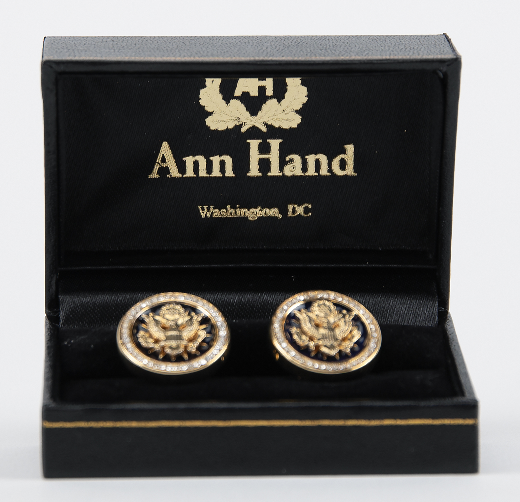White House-exclusive pair of gold-tone sterling silver cufflinks produced by Ann Hand in very limited quantities during the presidency of Donald Trump. Each cufflink measures .75˝ in diameter and features a golden Great Seal of the United States against a dark blue enamel background that is encircled with faux diamonds. The reverse of both cufflinks are stamped with the maker’s mark, silver content, and the facsimile signature of Donald Trump. Includes the original Ann Hand presentation box. In very fine condition.