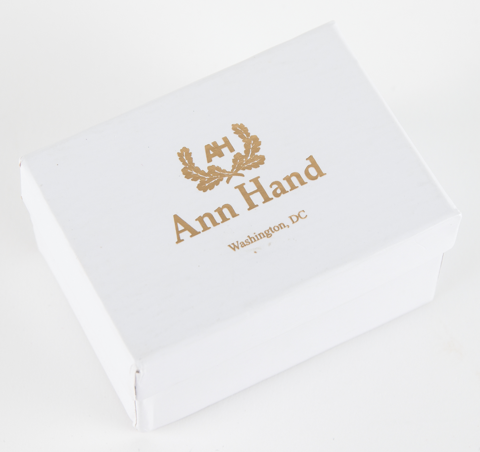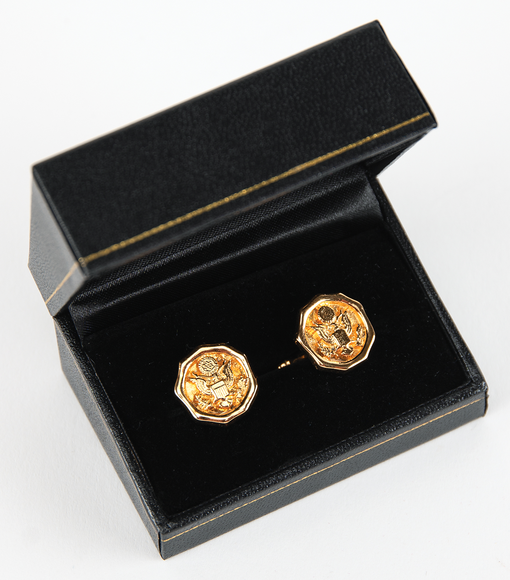White House-exclusive pair of gold-tone sterling silver cufflinks produced by Ann Hand in very limited quantities during the presidency of Donald Trump. Each cufflink measures 75˝ in diameter and features a design of the Great Seal of the United States. The reverse of both cufflinks are stamped with the maker’s mark and silver content. Includes the original Ann Hand presentation box. In very fine condition.