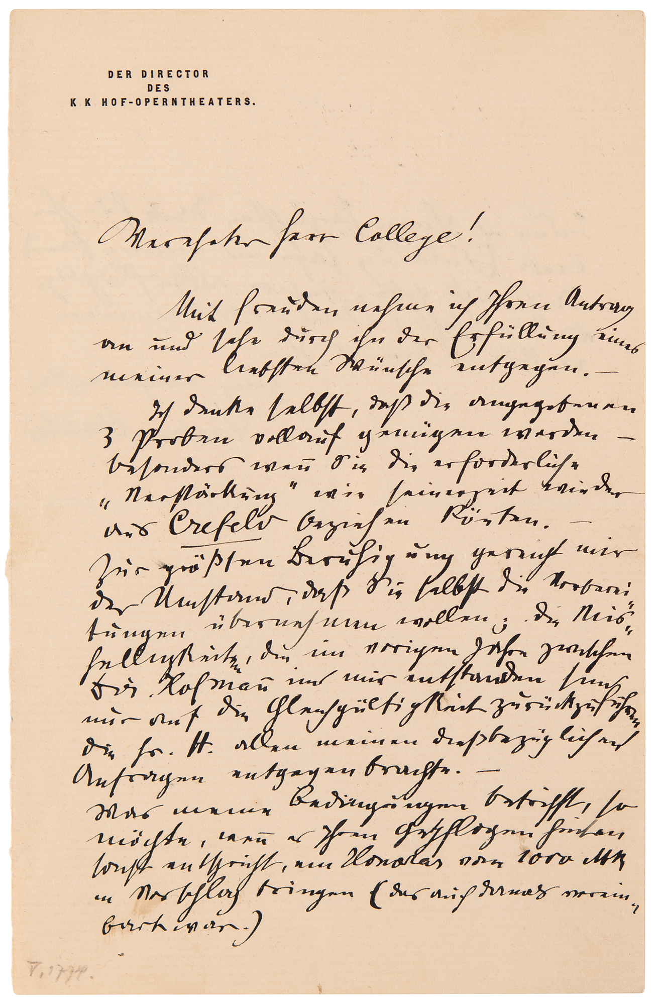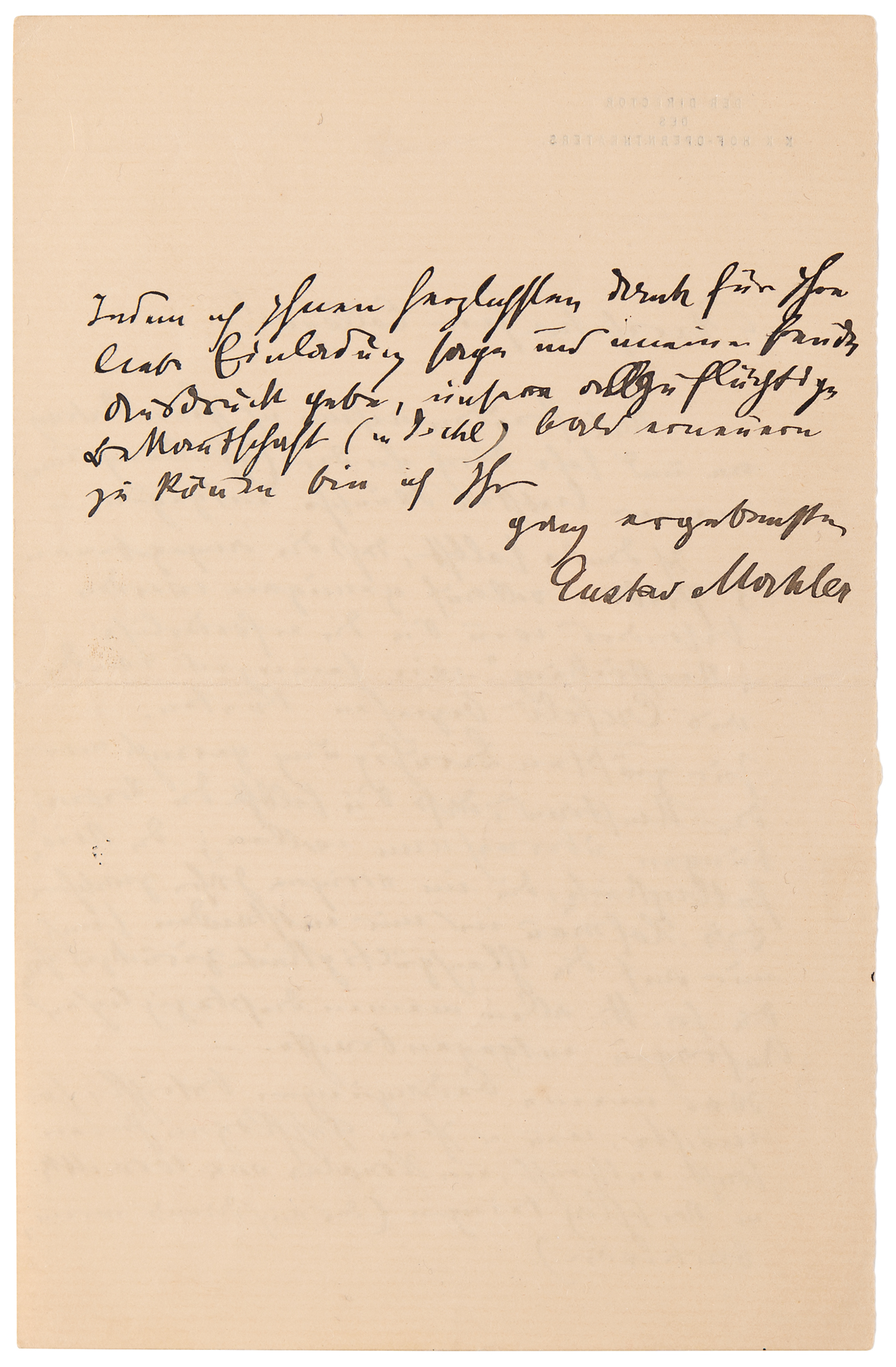 This letter was likely written in 1904, when Mahler was director of the Vienna Court Opera; the recipient was likely Fritz Steinbach, director of the music director of the Gürzenich Orchestra in Cologne from 1902 to 1914. Mahler would conduct the Gürzenich Orchestra in a performance of his Symphony No. 3 as part of a special subscription concert on March 27, 1904, and would premiere his Symphony No. 5 with the Gürzenich Orchestra on October 18, 1904. A superb and extremely desirable autograph letter by the Austrian master.