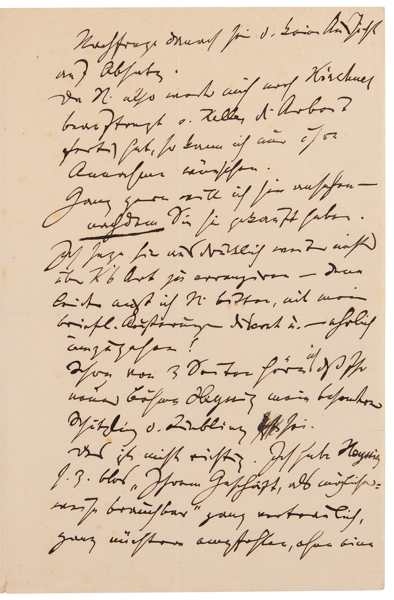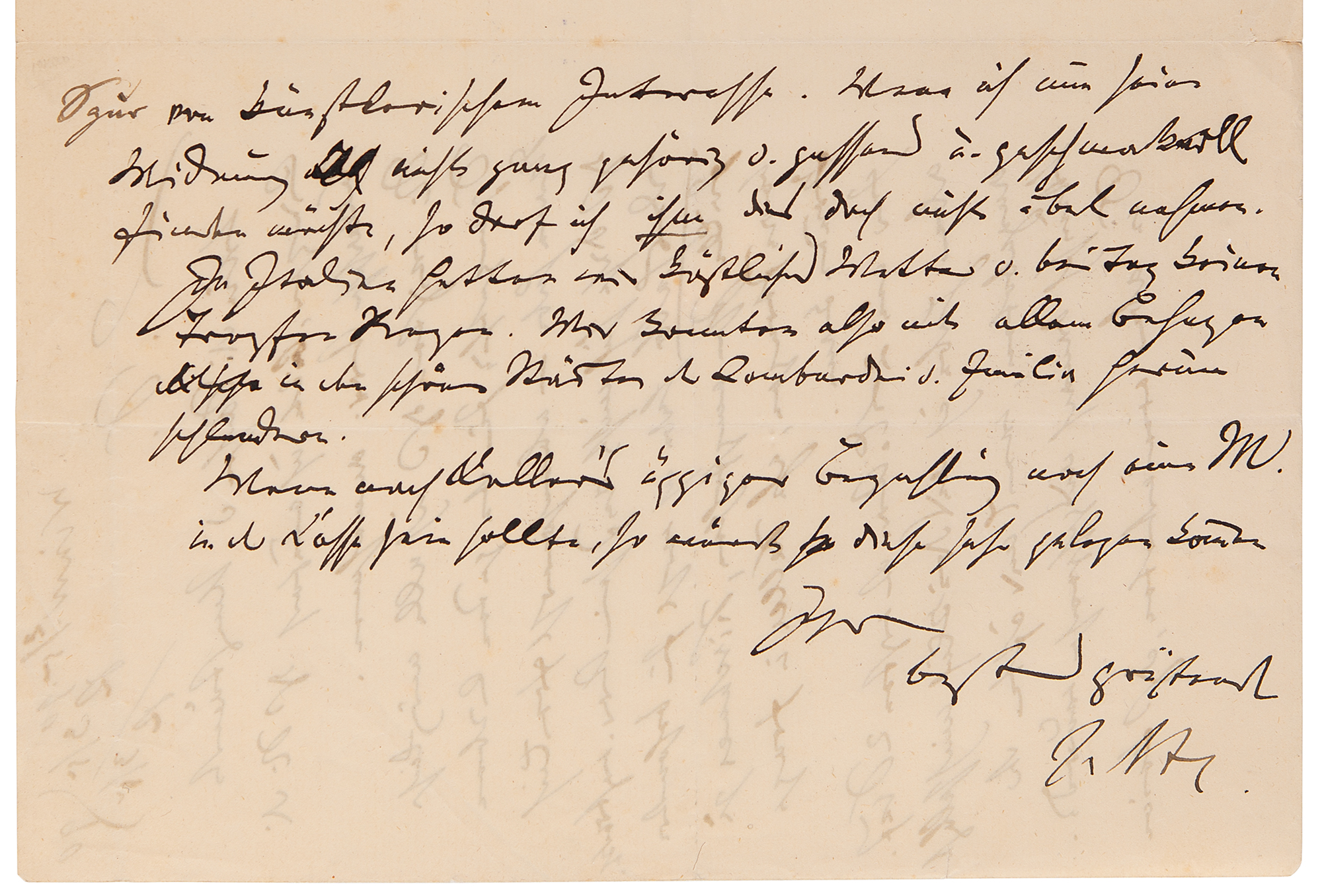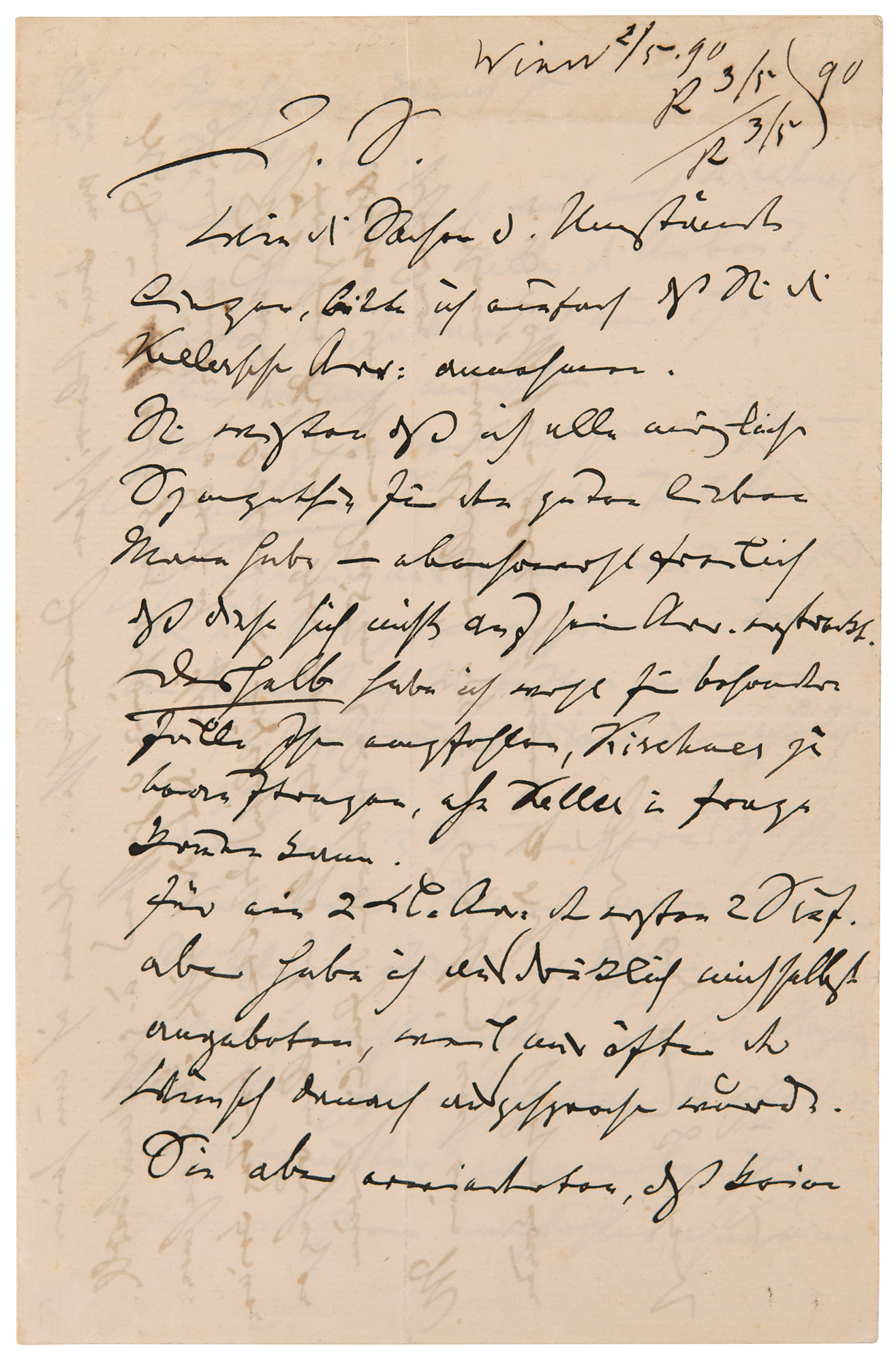 ALS in German, signed “J. Br.,” three pages on two adjoining sheets, 5.5 x 8.25, May 2, 1890. Handwritten letter from Vienna to his publisher, Fritz Simrock, in part (translated): "In view of things, and, circumstances being what they are, what can I do but ask you to publish the Keller arrangements. You know that I harbor all kinds of sympathy for the dear man—albeit true that does not extend to his arrangements. For that very reason, I have duly recommended, in certain cases, to give the assignment to Kirchner before Keller can even be taken under consideration. However, as concerns arrangements for two-handed piano of the first two symphonies, I specifically offered to write them myself because frequent requests have reached me that I do so. But your reply was that there does not exist any demand for same, and therefore no prospect for any sales. Since you did not give the assignment either to me or to Kirchner, and Keller has already completed the job, all I can do is hope that they will be published. Gladly I shall go over them after you purchased them. I shall not go into a detailed discussion here of K's style as an arranger and the pity is that I must ask you to deal with my remarks in this letter discreetly—and honestly! It's from three different sources that I've heard how your new Bohemian, Heyssig, is supposed to be my protégé and favorite. That is not true. All I did at the time was recommend Heyssig as 'in all likelihood useful for your firm' in strict confidence, quite sober, without any trace of artistic self-interest. So if I now may find his dedication not altogether seemly and appropriate and in good taste, I nevertheless cannot be expected to hold a grudge against him for it. In Italy we had delicious weather and not a drop of rain during the day. Thus, we were able to wander about in full comfort through the lovely towns of Lombardy and Emiglia. If, following Keller's lavish compensation, there is still left a single M. in the cash drawer, then that one would come in very handily." In fine condition. A desirable letter concerning the arrangement and publication of his works.